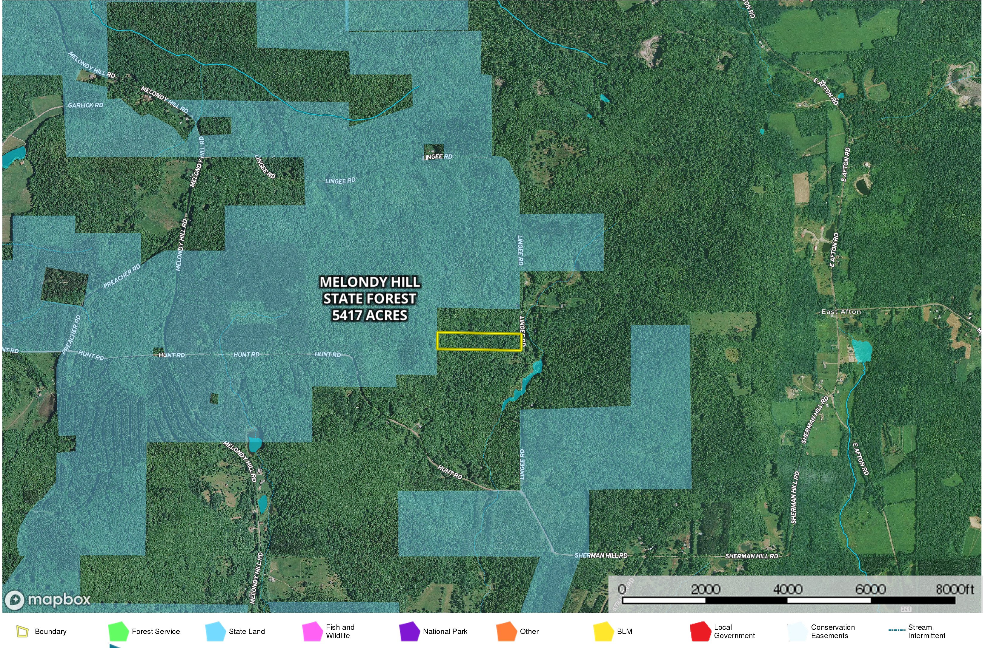 - Year round direct access to Melondy Hill State Forest, 5417 acres NYS Lands for hunting, trapping, fishing, hiking, snowmobiling, cross-country skiing