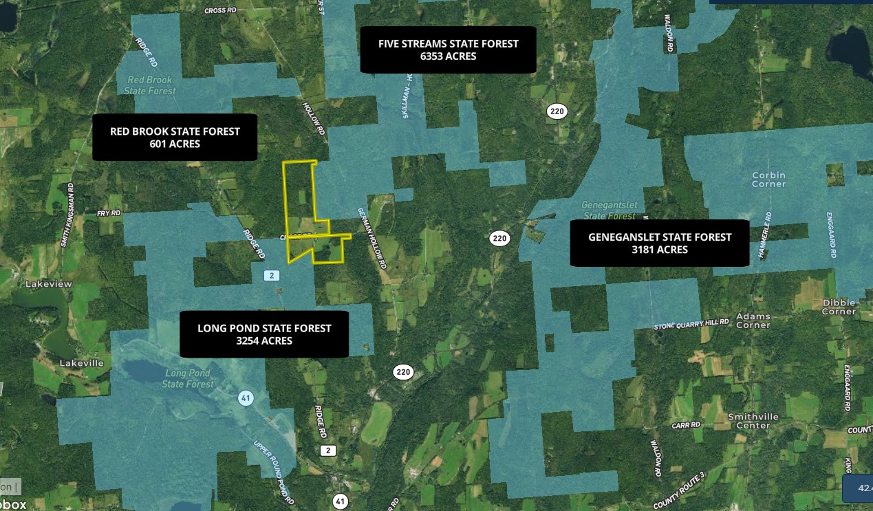- Borders NYS Public Lands on 2 sides: Long Pond State Forest (3254 acres) and Five Streams State Forest (6353 acres)