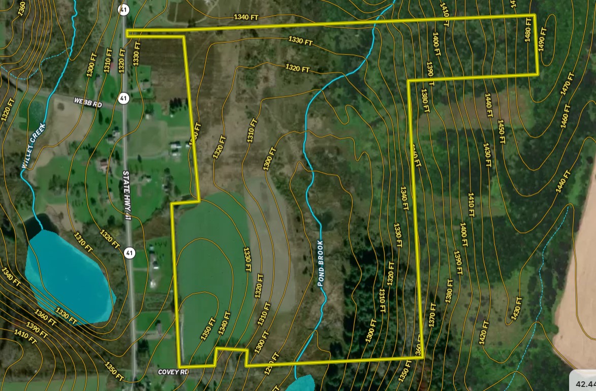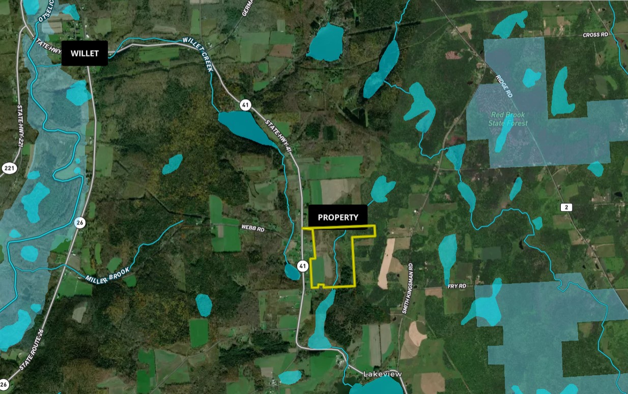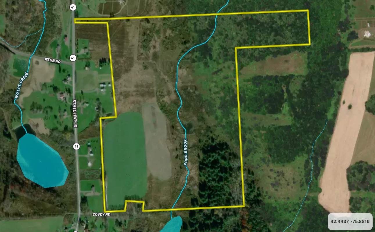 Dont miss this diverse large tract of land in a secluded location for hunting, vacation or building your new year round home. This large property offers a great hunting or outdoor recreation, agricultural fields for a small farm operation or lease to an area farmer for income potential, featuring 20 acres of tillable land, 18 acres of pasture, 25 acre woodlot and the remainder brushy/open meadows. There are 2937 +/- feet of a named stream, Pond Brook, runs through the property with a really nice natural beaver pond that was loaded with ducks and geese when recently visited. An ATV/UTV sized trail system runs through the property providing access all the way back into the woods. This past year, 13 acres of the tillable land was planted to corn, while 6.5 acres were planted as a food plot. There are several tree stands located strategically on the property. Wild apple trees are also sporadically located around the back side of the stream and offer an attractive food source to deer and wild turkey, among other area wildlife. This diverse habitat with woods, fields, brush and water attract whitetail with preferred food sources and areas suitable for bedding. There were a lot of whitetail sign noted when walked and pheasants were also noted on the property. This property is privately set back from the county maintained road with a 50 ft wide x 400 ft long access (owned, not ROW) and a second access to the land via the dead end Covey Road. Power is available along Route 41. In an area renowned for wildlife conservation, great hunting and fishing, many additional outdoor recreational opportunities are nearby. This property is located just 2.6 miles from Long Pond State Forest, with 3254 acres for hunting, hiking, camping, horseback riding and a 4 mile snowmobile trail running through it for winter sports as well. Fishing and boating can also be enjoyed on Long Pond, which is a 117 acre lake. More water recreation and fishing is available within 9 miles at Dorchester Park, with its public boat launch, on the Whitney Point Reservoir, a 1200 acre lake renowned for walleye, bass and panfish among many other species. Dorchester Park also offers a public beach and picnic area. The Whitney Point Multiple Use Area is located there as well which provides an additional 4546 acres of NYS Land to hunt, hike and enjoy outdoor recreation.