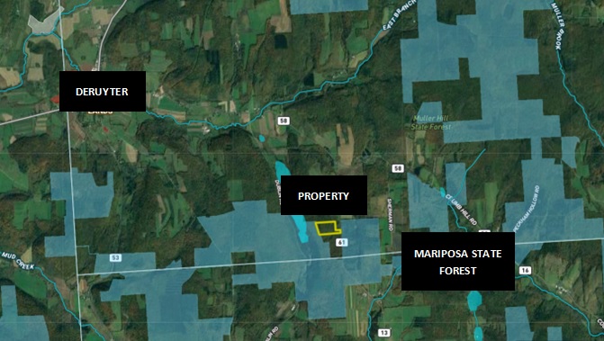 With a cleared area ready for your camper, you can pull in and enjoy this beautiful wooded property for hunting, vacation getaway, or building your year-round home. There is power at the year-round maintained paved road. The nice-sized trail takes you from the level area at the top of the property and down the moderate slope to the back. Mariposa State Forest is located just across the road as well as borders the back of this property, adding an additional 3002 acres for hunting, hiking, and camping as well as miles of snowmobiling trails available for winter fun as well. This area of Central New York is renowned for its wildlife conservation efforts, and deer and wild turkey hunting, making this property an ideal location for your base camp. Between the area farms and thousands of acres of woodlands, streams, and brushy cover, this property, and the surrounding area offer the ideal diverse habitat for whitetail and area wildlife to pass through. The Chenango River, among several great fishing locations in the vicinity, is only 6 miles away and offers fishing for brown trout, smallmouth bass, walleye, northern pike, and muskellunge, among several other species. Amazing additional outdoor activities await in less than a half-hour from this property, including 4157 acres of public land at the Whitney Point Multiple Use Area (NYS Land) with its outstanding hunting, hiking, camping, as well as Dorchester Park, located on the 1200 acre lake of the Whitney Point Reservoir, and offers a public beach, picnic area and NYS boat launch for access to outstanding fishing for pike, bass and panfish. While the property is remotely located on a quiet country road, amenities are only 4 miles away in DeRuyter, while Whitney Point and Cortland are both a half-hour, and you can be in Binghamton in one hour. NYC/George Washington Bridge is 3.5 hours away. This is a really nice property for any number of uses at a very affordable price. Adjacent 10.89 acres are also for sale.