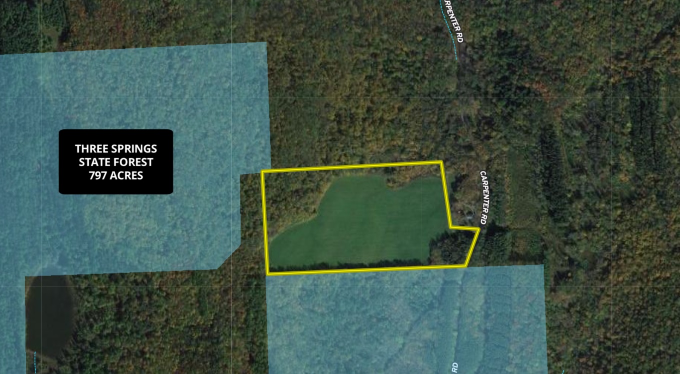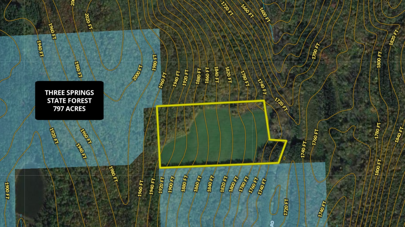 - Borders Three Springs State Forest (797 acres) on two sides