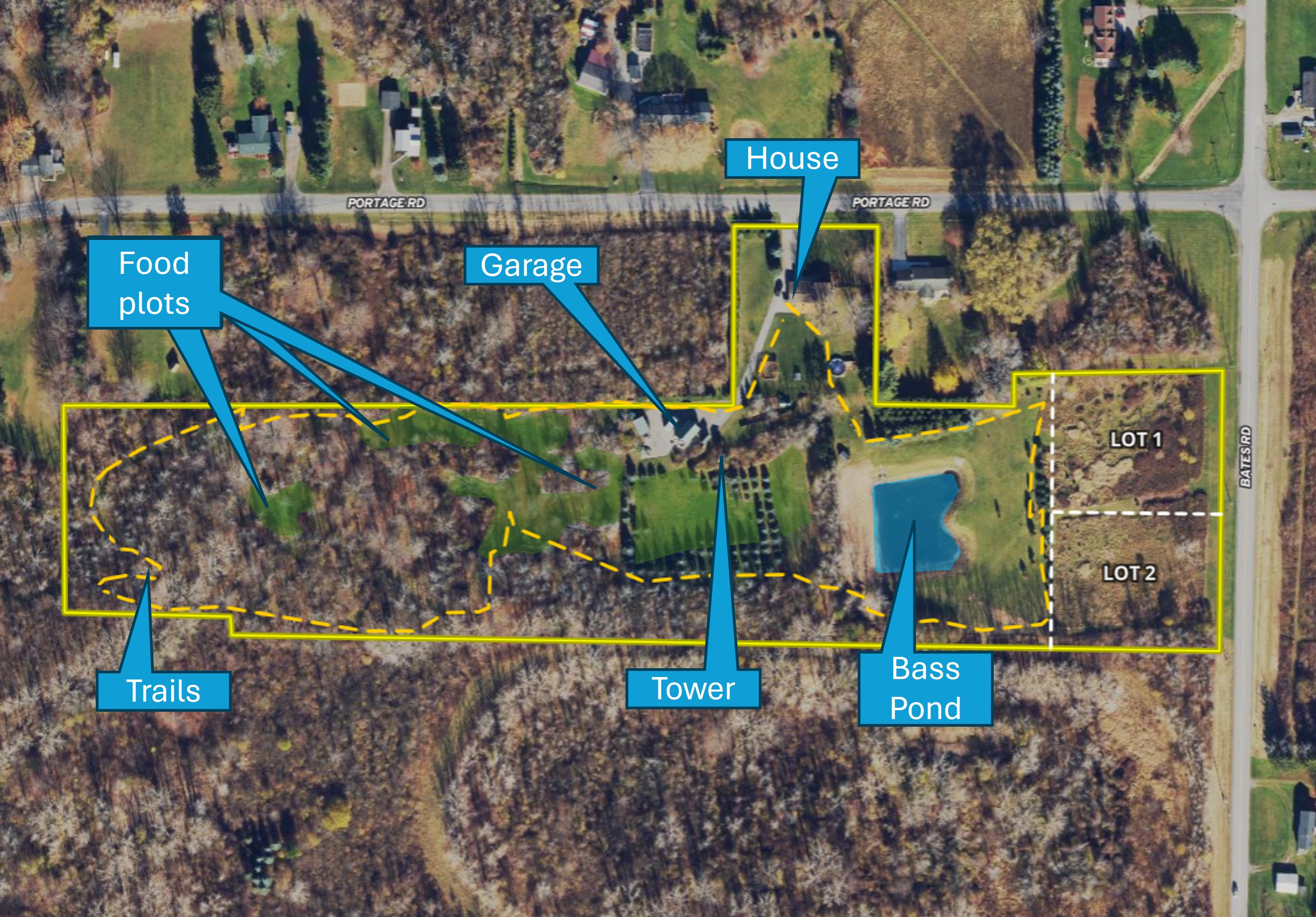 Food plot, Trail network, Tree stand/Blinds