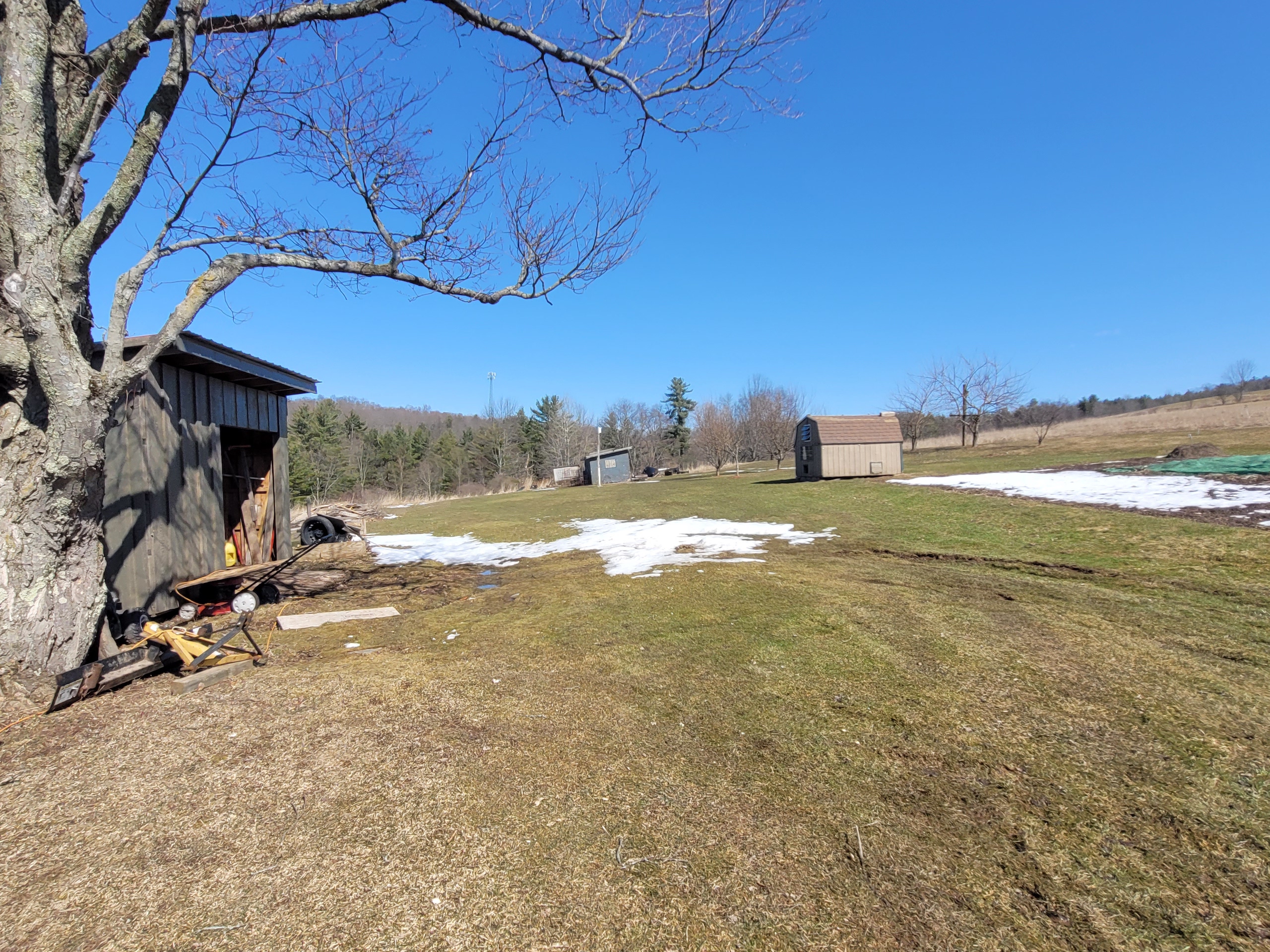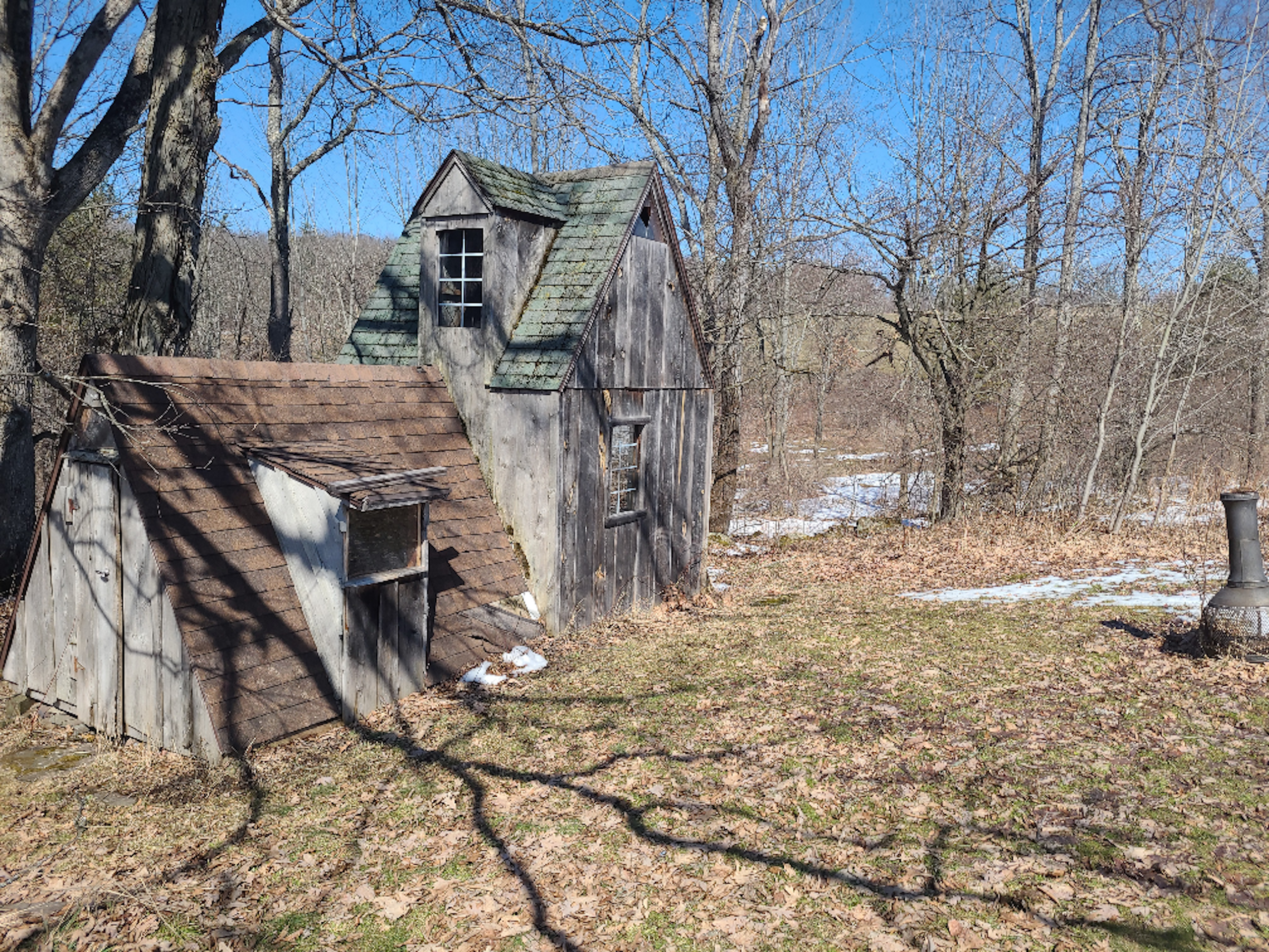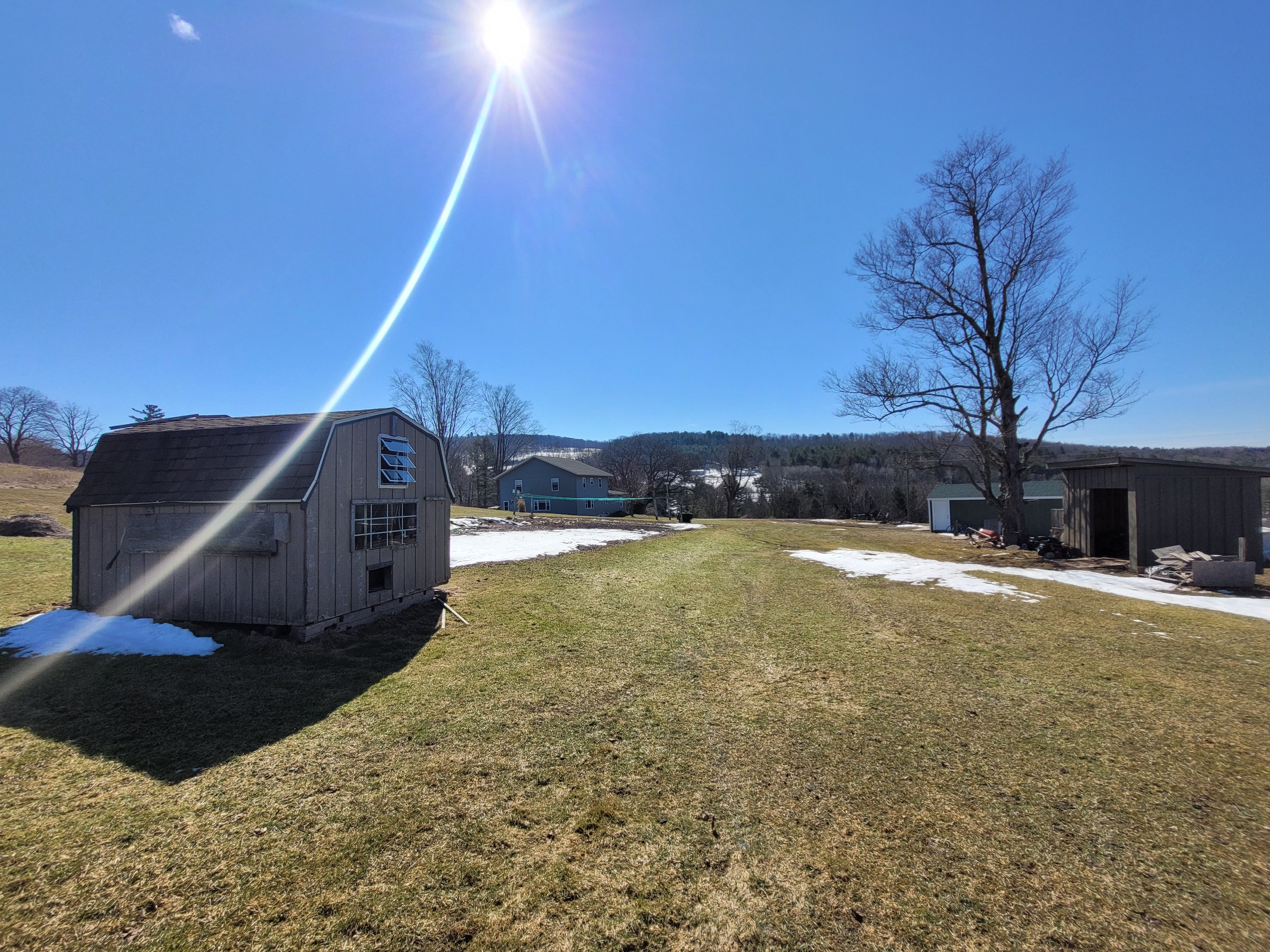 - Several sheds and outbuildings used for storage and chickens currently