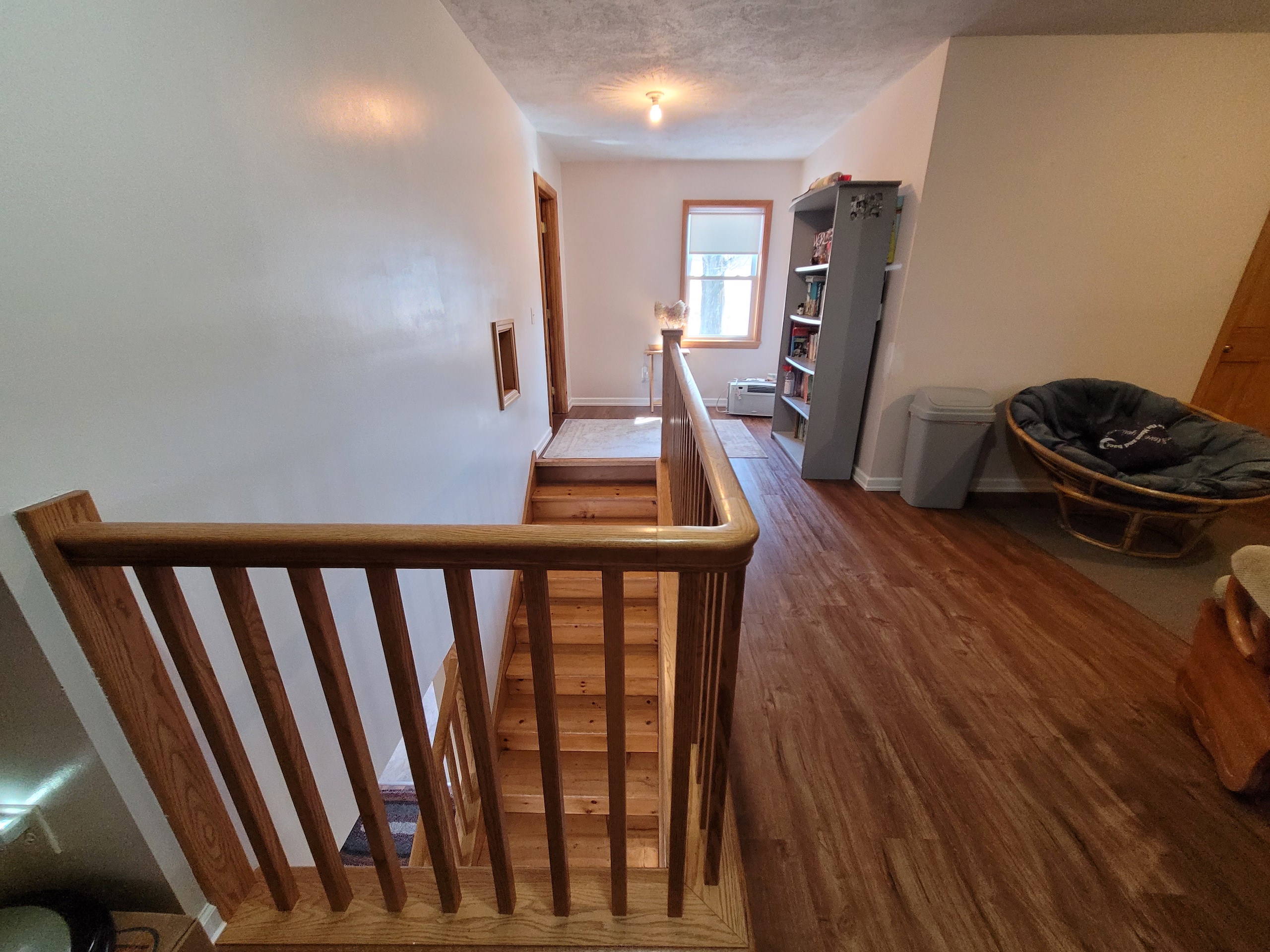 - Gorgeous contemporary open wood staircase and railing leading to second floor