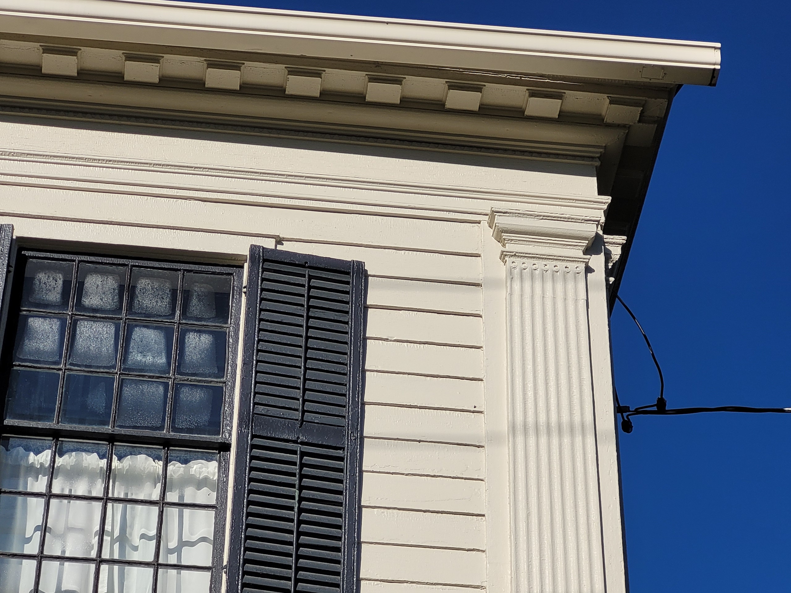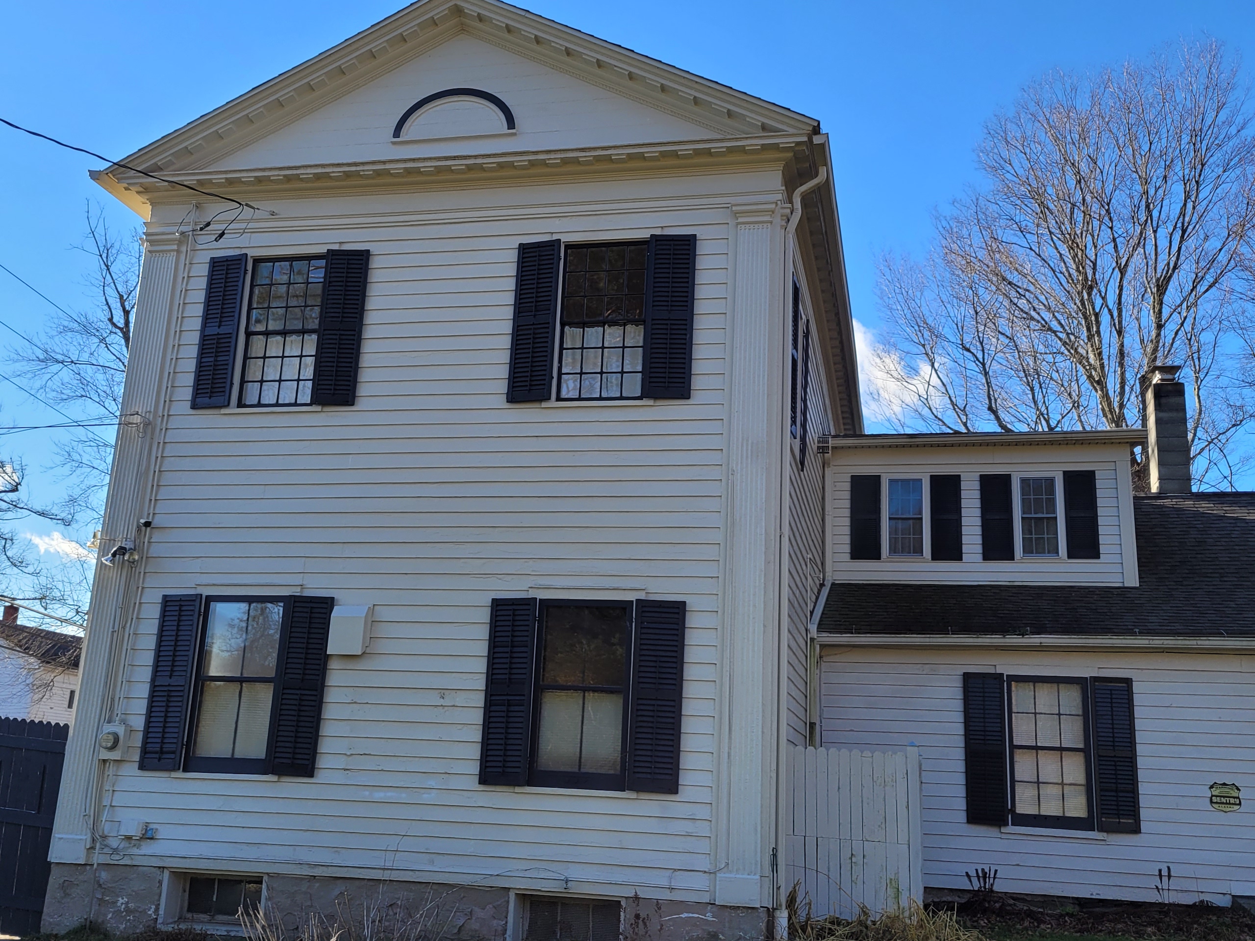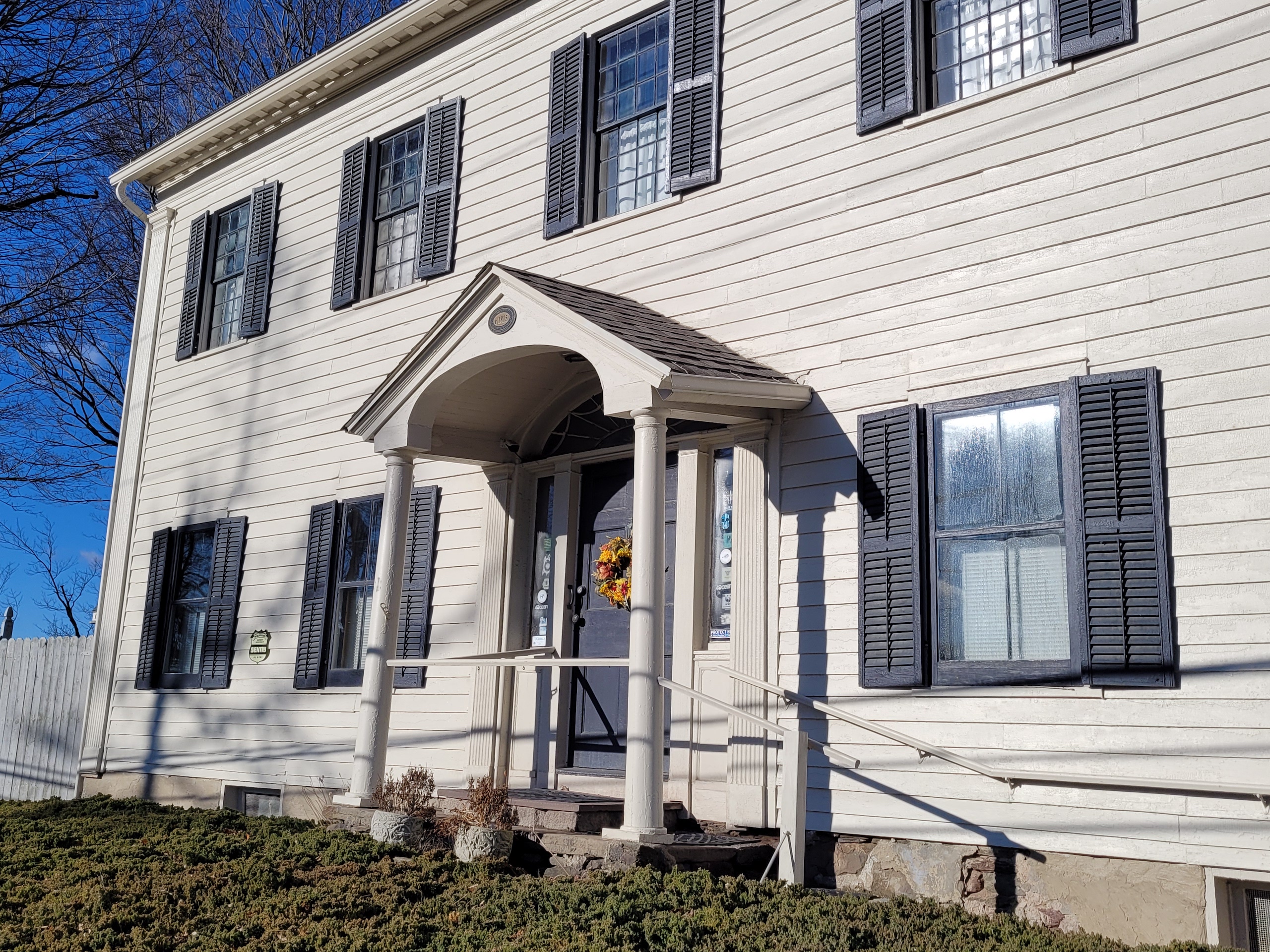 - Many original architectural features: wainscoting & interior trim, front door w fanlight transom window and sidelites, exterior dentil moulding, fluted pilasters, wood flooring