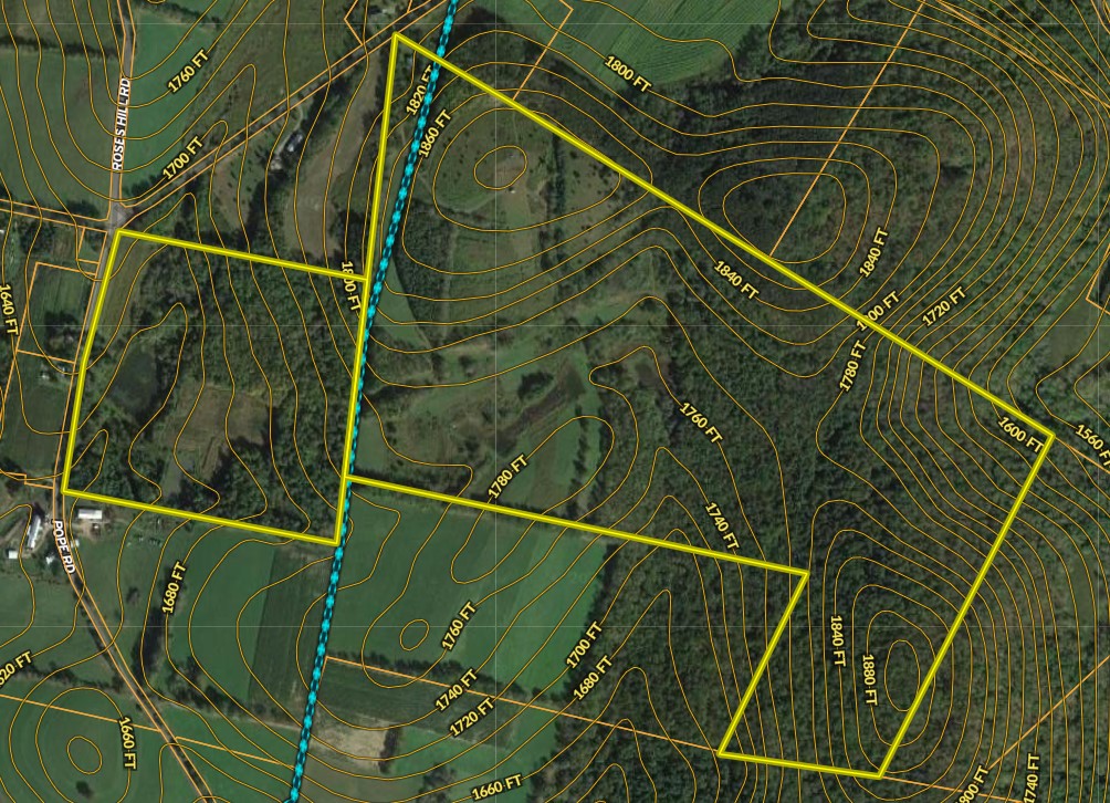 - Rolling topography with nice saddleback ridges with deer runs evident and turkey roosts