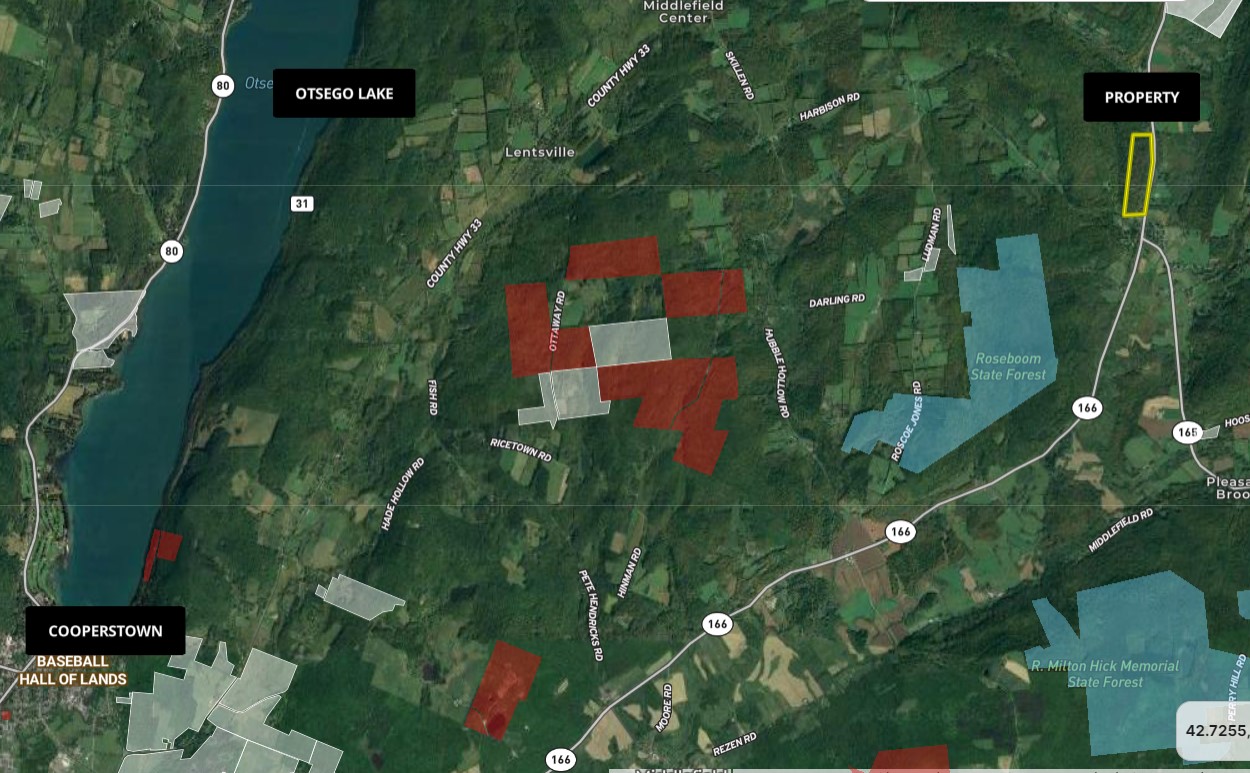 For additional hunting, hiking and outdoor recreational opportunities, the property is less than 1 mile from Roseboom State Forest, with 620 acres, and 4 miles to Cherry Valley State Forest, with 1,460 acres within easy reach. Only 8 miles to the amazing fishing and watersports are available on the pristine Otsego Lake, a 4046-acre lake renowned for lake trout, walleye, and perch and the Glimmerglass State Park, with a public beach with picnic areas and 593 acres for hiking, camping, and in the winter ice skating and cross country skiing on its many trails. Additional fishing is also close by in the renowned Susquehanna River, which is ideal for boating and fishing, including smallmouth bass, walleye, catfish and smaller panfish.
