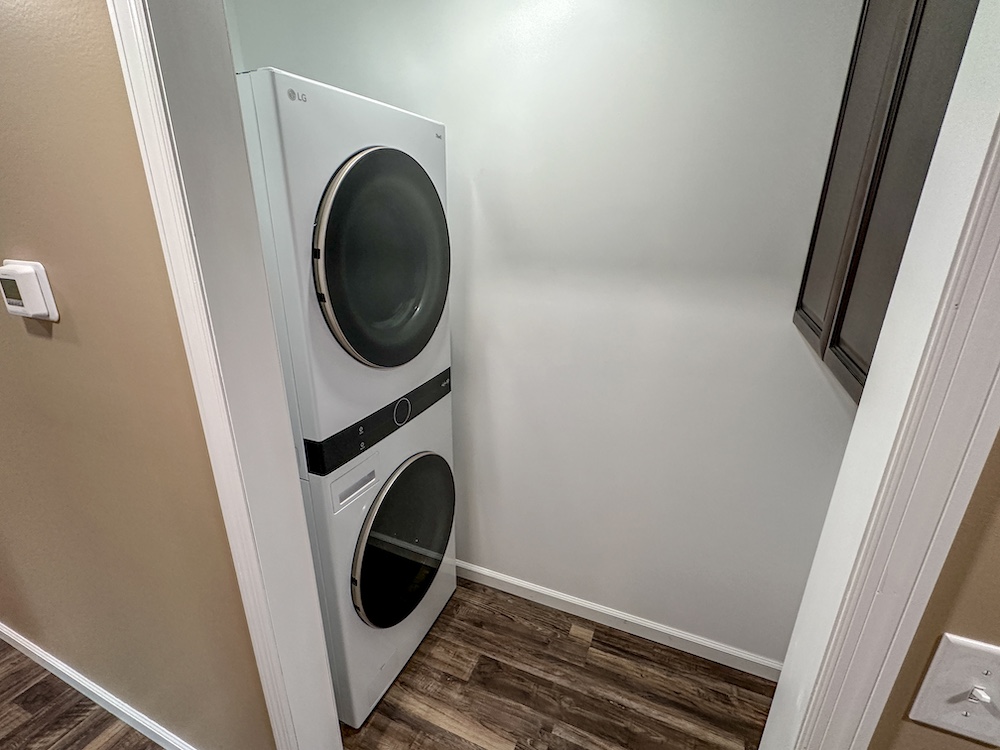 - Appliances included are stove, refrigerator, microwave, dishwasher, and stacked washer dryer