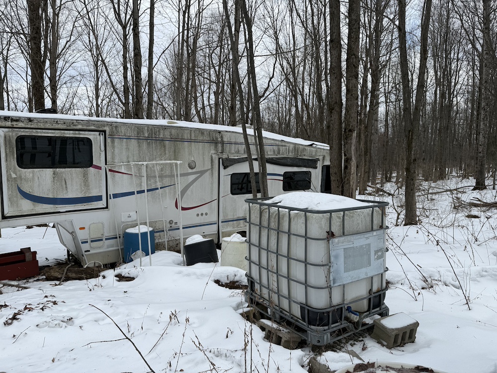 - Older fifth-wheel camper included with the property for seasonal or recreational use