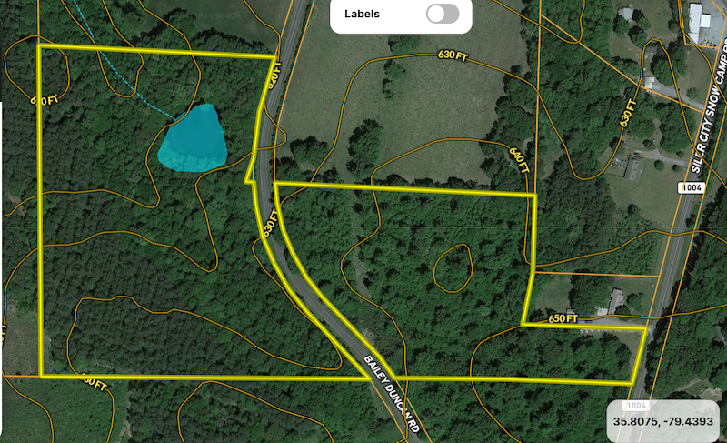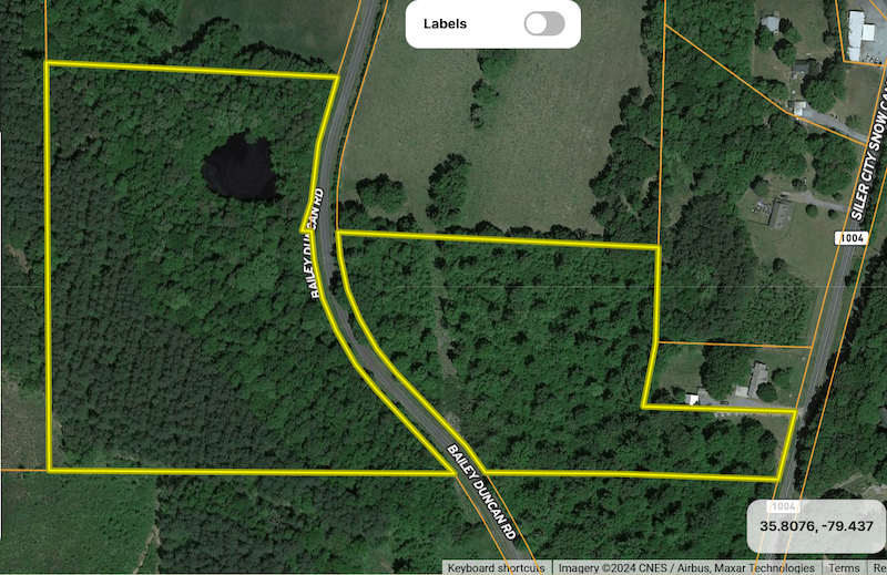 This one won't last long. This fully wooded Chatham County parcel offers the buyer multiple opportunities. Majestic hardwood and softwood trees abound on this property, along with your very own 1/2 acre pond. Thus, giving the buyer that perfect, quiet, country setting. Plenty of deer and turkey sign can be found. You can create your own mini farm. With road frontage on both sides of Bailey Duncan Rd. as well as Siler City Snow Camp Rd., access is easy. There are approximately 8 acres on the east side of Baily Duncan Rd that extend to Siler City Snow Camp Rd. and approximately 16 acres to the west of Baily Duncan Rd for 24.5 +/- acres total. You are within 20-30 minutes of the new industrial sites of Wolfspeed Manufacturing and Toyota Manufacturing, thus providing a great investment opportunity. Both sides of the road have had soil testing done, which shows good soils for conventional septic. A buyer would need to secure septic permits. The parcel is currently in a tax-deferred program for timber, and the buyer would need to continue that program or pay the taxes. This parcel is less than 10 minutes to Siler City, 25 minutes to Pittsboro, 30 minutes to Greensboro and 30 minutes to Jordan Lake. Call today for your private showing.