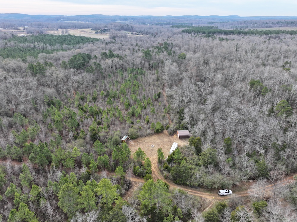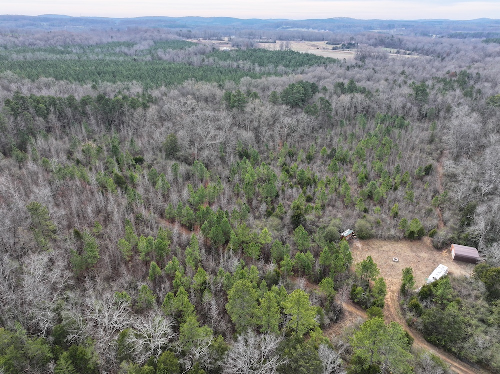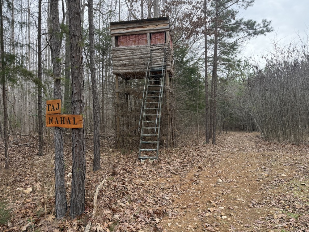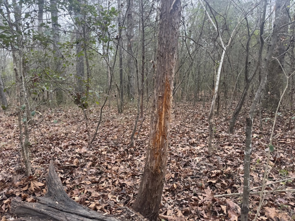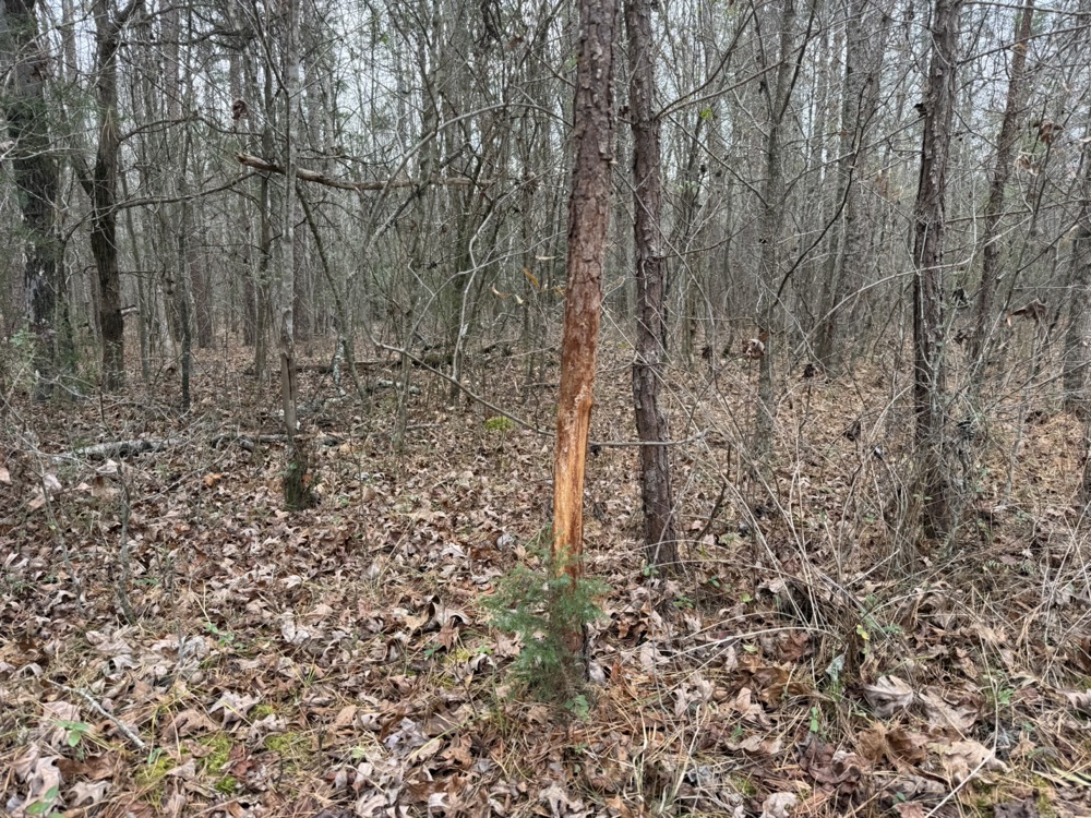 Improvements on the property include an established deer camp area that provides a functional base for hunting activities. A storage shed and a packed woodshed are also included and convey with the property. Two box blinds are strategically positioned and will remain with the land. The property shows consistent signs of deer activity, including scrapes and rubs observed throughout the tract. In addition to deer hunting, the habitat and terrain also support opportunities for turkey hunting.