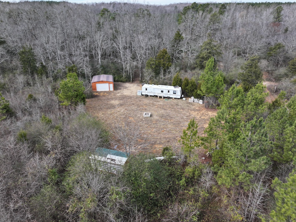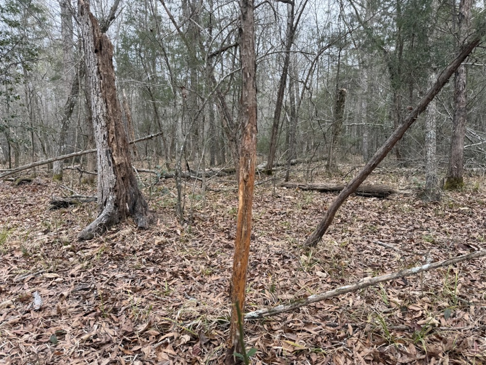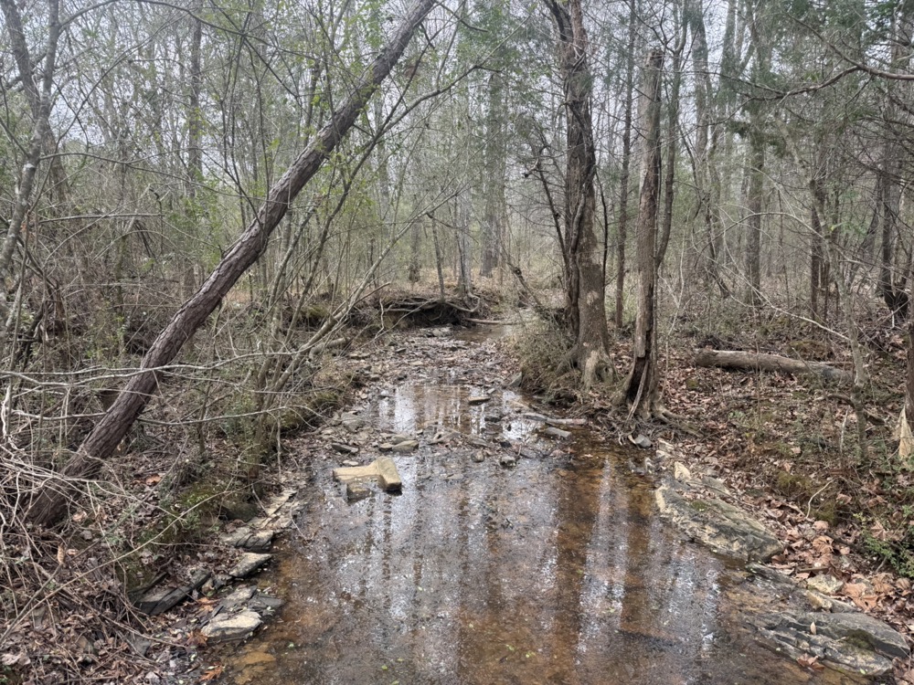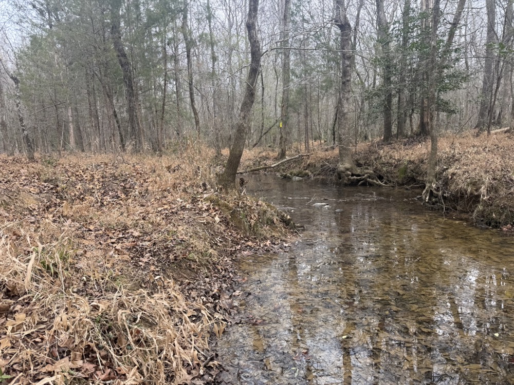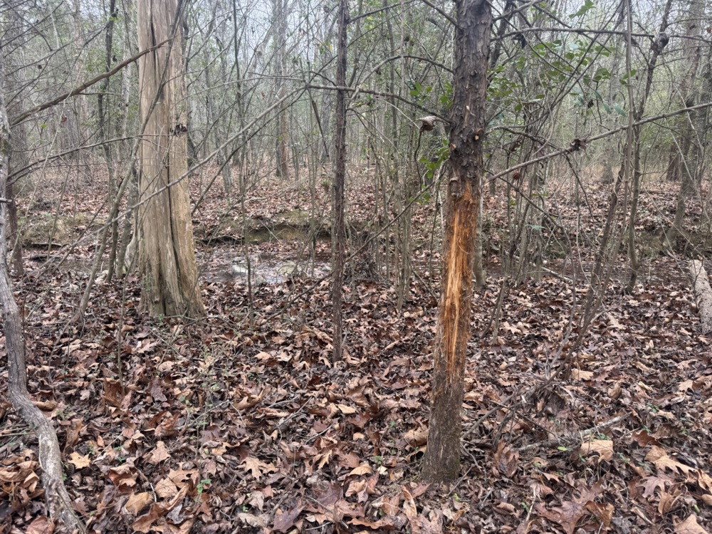 The property is primarily wooded and features mature timber mixed with areas of thick cover that provide natural habitat for wildlife. A rock-bottom, year-round creek flows through the property and serves as a consistent water source for game species. Several established food plots are already in place, contributing to the overall habitat management and usability of the land.
