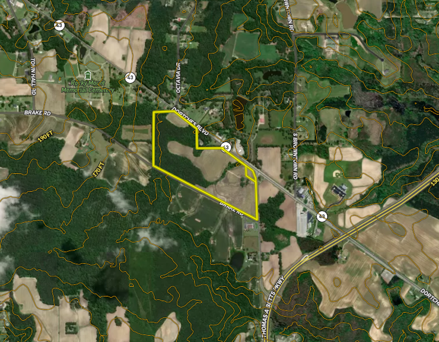 Massive investment potential! Take a look at this vast acreage located within the town limits of Dortches and within one mile of the City of Rocky Mount! Here, you will find over 2,300 feet of total road frontage from two directions, including the main thoroughfare between Rocky Mount and Red Oak, Highway 43. Nash County has been exploding with development lately, and the trend is not slowing down due to the close proximity to Wake County, Interstate 95 and US Highway 64. The NCDOT will soon begin widening Highway 43, allowing for more future growth. With county water available, power lines on all three roads and fiber optic cable, the opportunities are endless. Take advantage of this unique opportunity to be a part of the growth of this community! The entire property's soils have been tested by a licensed soil scientist, showing that over half of the property would be suitable for septic. This is a preliminary lot that has been virtually divided from a larger property. It will require a survey prior to settlement which will be the responsibility of the buyer. There is an active farm lease, and it will continue to be farmed in 2024. A licensed North Carolina Real Estate Agent must be present during all showings. If you are interested or have any questions, please contact Dillon Eckert at 252-717-9788 or Dillon.eckert@whitetailproperties.com.