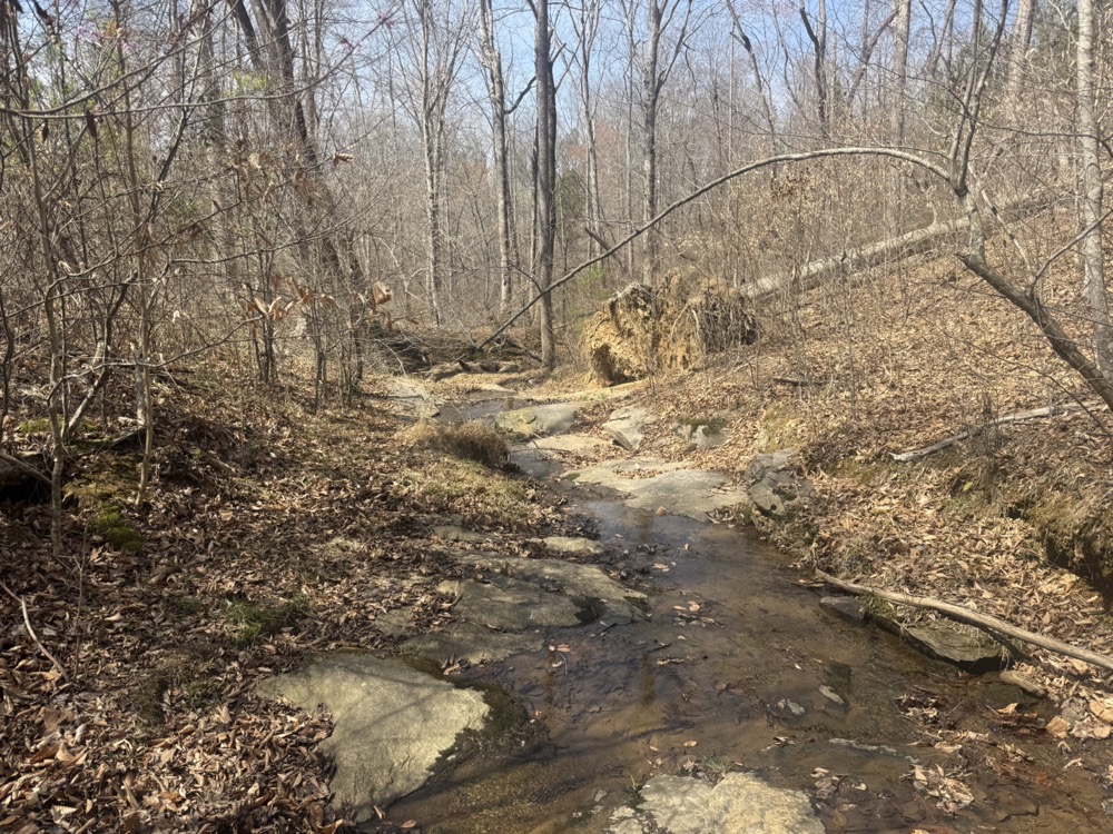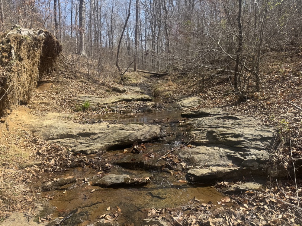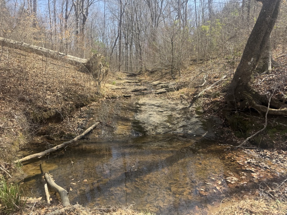 - Year-round rock-bottom creek with small waterfall