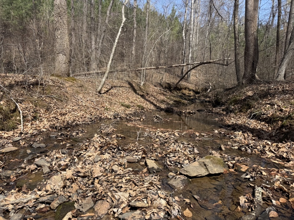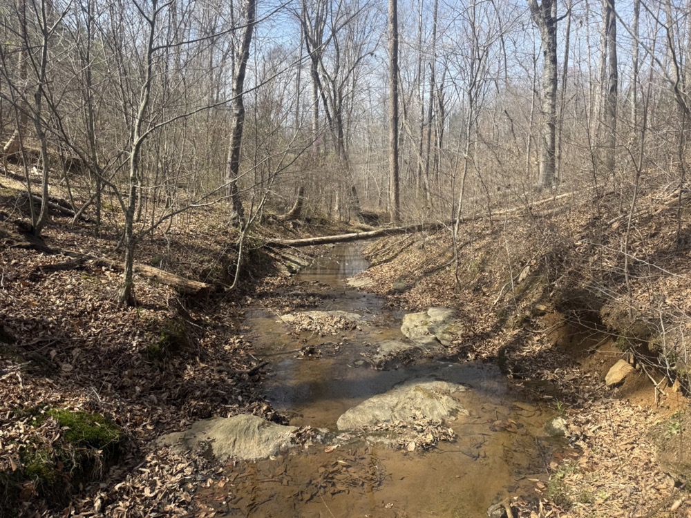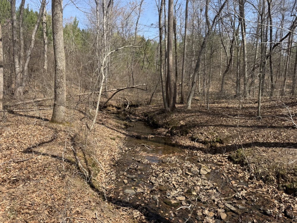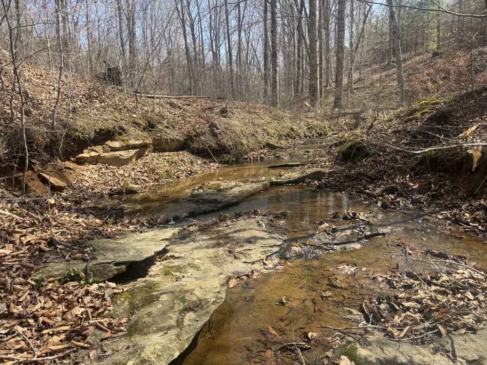 A year-round, rock-bottom creek winds through the property, adding both aesthetic and functional value. Along the creek, a small waterfall feature provides a unique natural element. The presence of water enhances the usability of the land for recreation and contributes to the overall landscape.