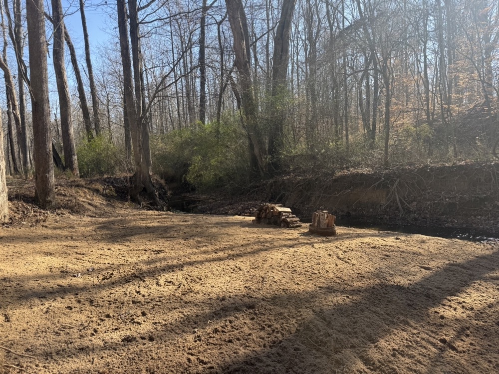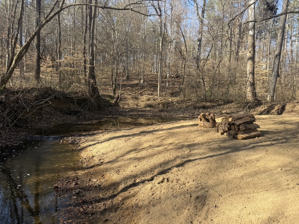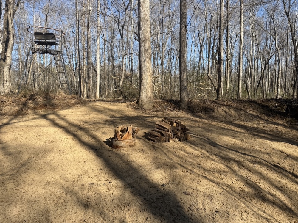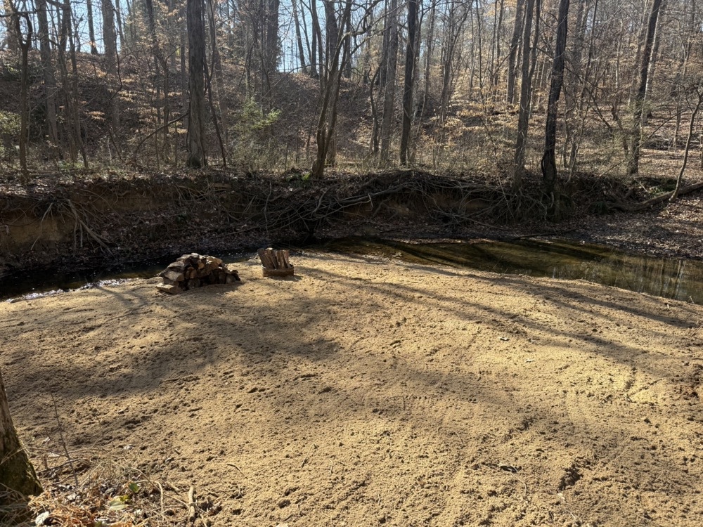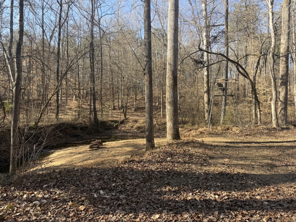 The land includes maintained perimeter trails suitable for riding and recreation, including a bridge crossing a creek. A private beach area is located along the creek, and a tower deer stand overlooks a small food plot, creek, and beach area. The property also includes a dirt bike track and a shooting range with the ability to accommodate distances exceeding 200 yards. Wildlife is present throughout the property, including deer and turkey.