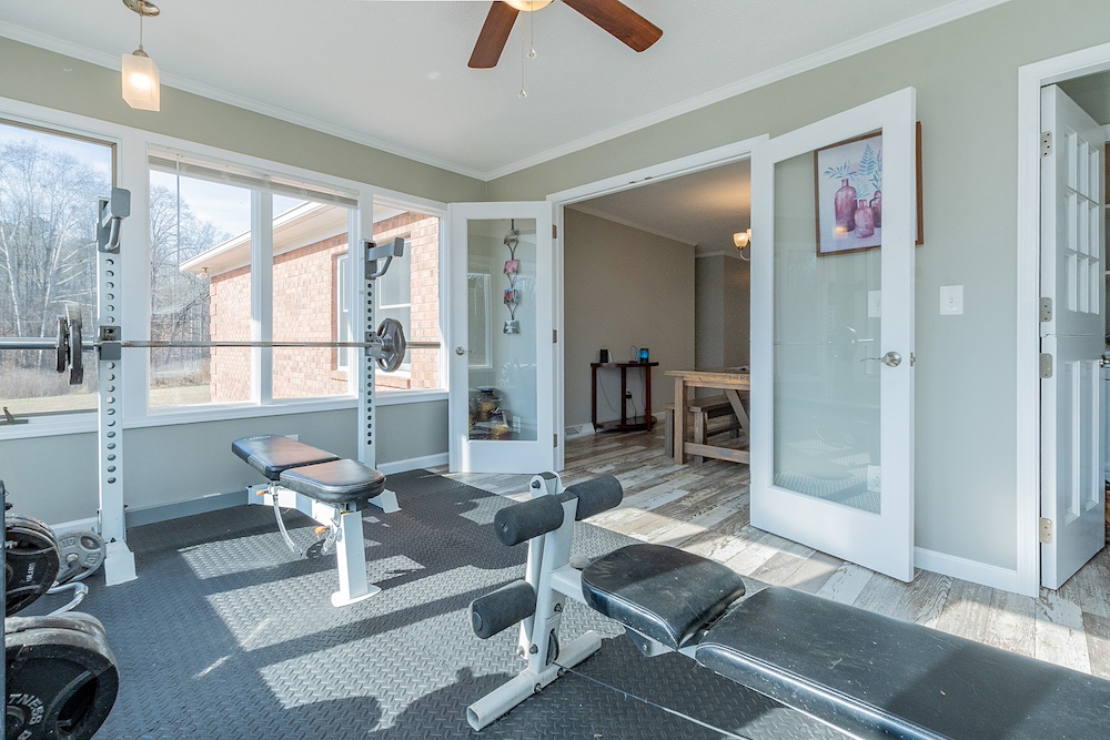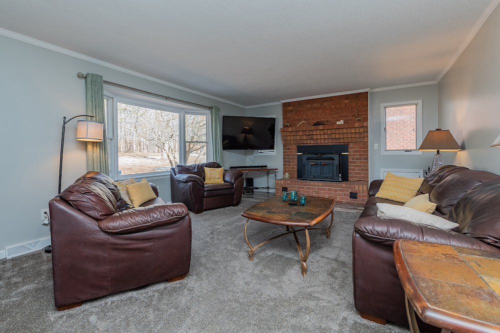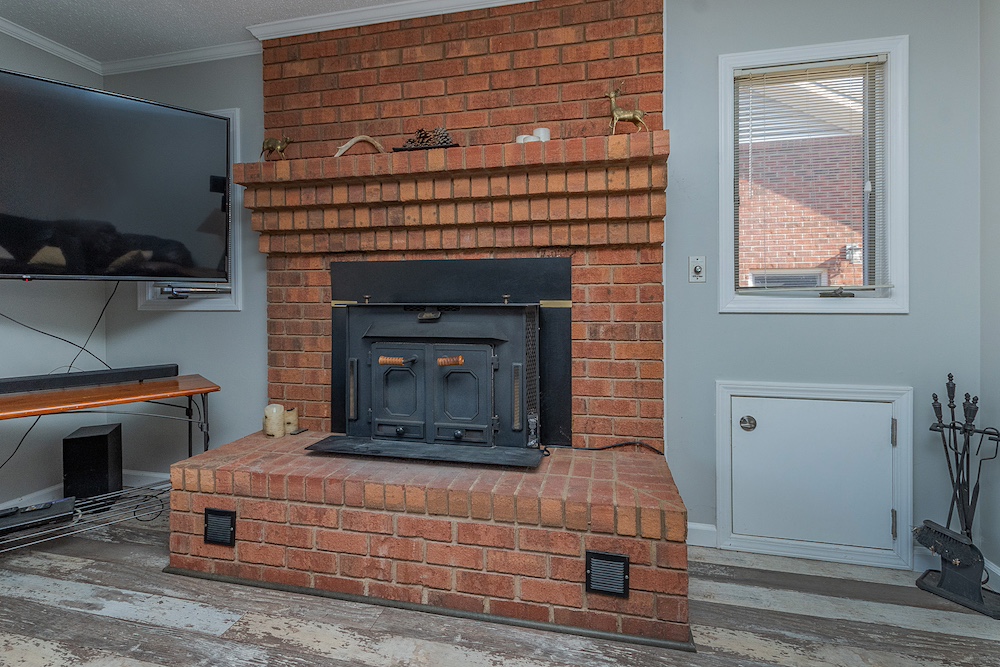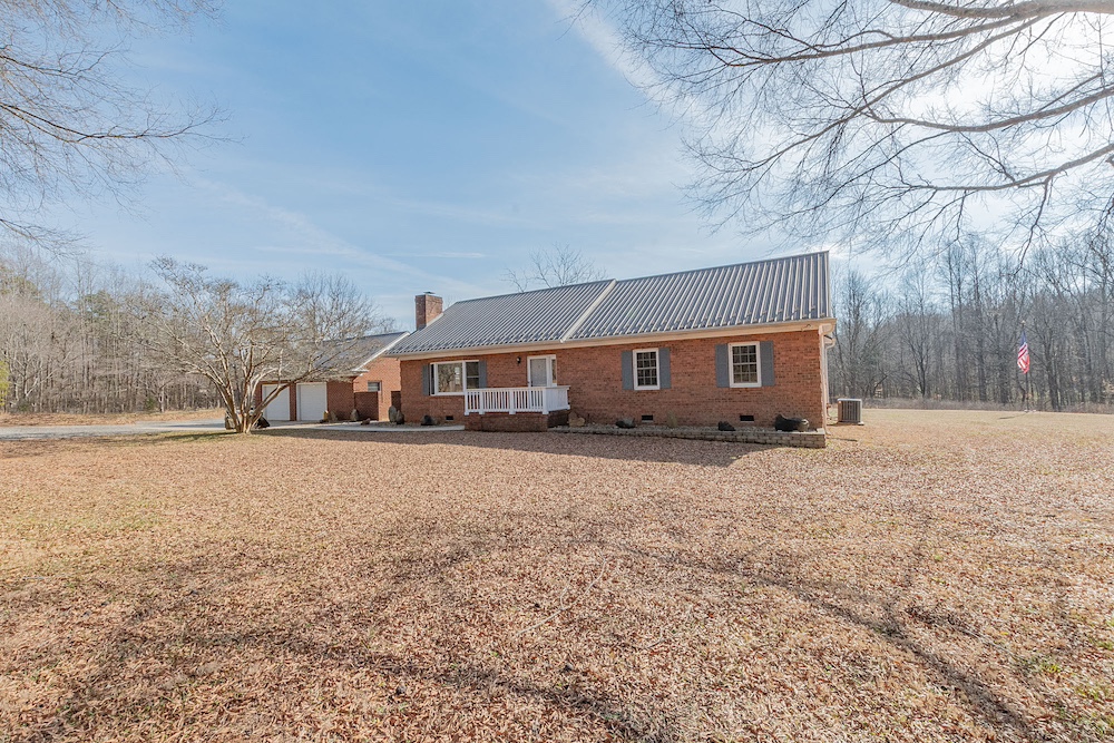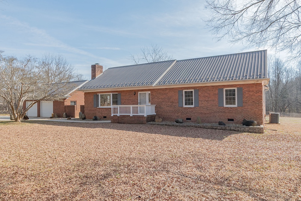 The primary residence is a three-bedroom, two-bathroom brick ranch home with a fully remodeled interior. Interior improvements include an updated kitchen with ample cabinetry and workspace, a designated dining area, a sunroom with exterior views, and a living room featuring a wood-burning fireplace. The primary bathroom includes a walk-in tile shower. A new HVAC system was installed in 2023, and the home has a metal roof with all fasteners replaced in 2022. Appliances have been updated within the past five years.