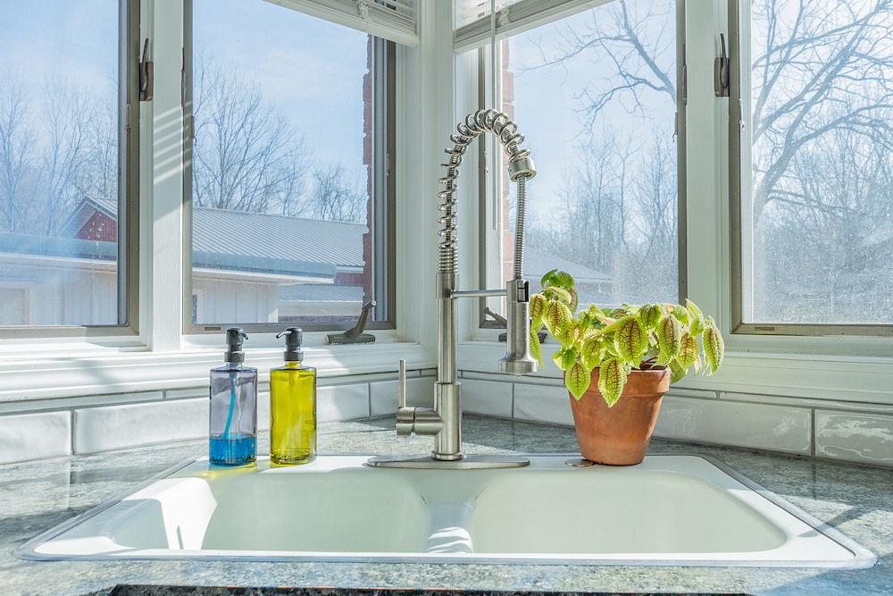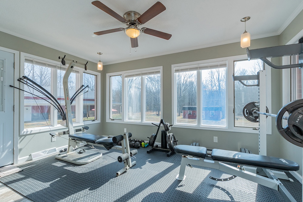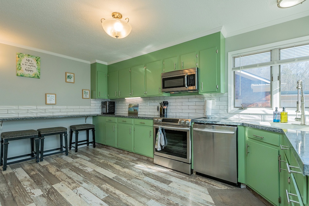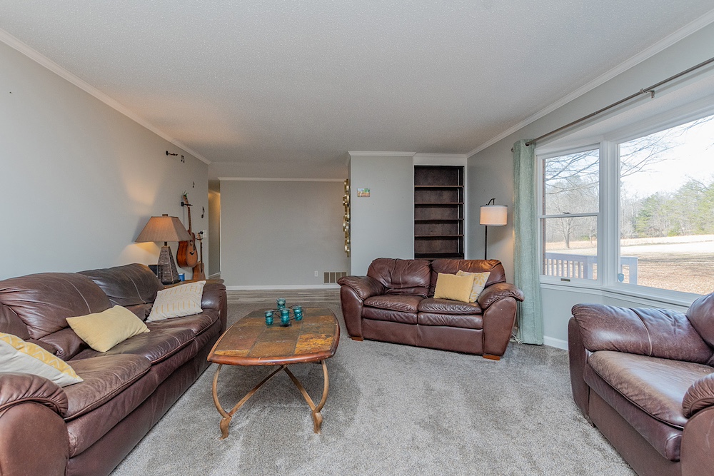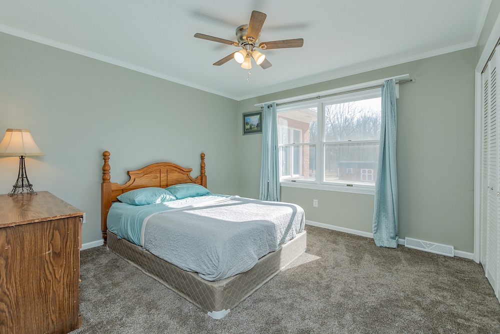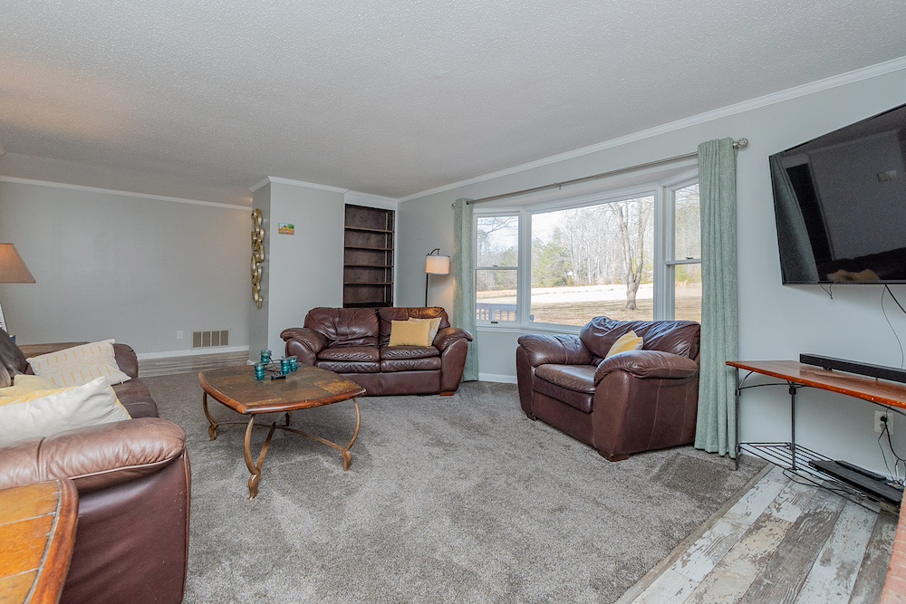 The primary residence is a three-bedroom, two-bathroom brick ranch home with a fully remodeled interior. Interior improvements include an updated kitchen with ample cabinetry and workspace, a designated dining area, a sunroom with exterior views, and a living room featuring a wood-burning fireplace. The primary bathroom includes a walk-in tile shower. A new HVAC system was installed in 2023, and the home has a metal roof with all fasteners replaced in 2022. Appliances have been updated within the past five years.