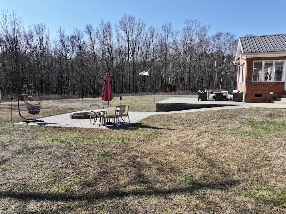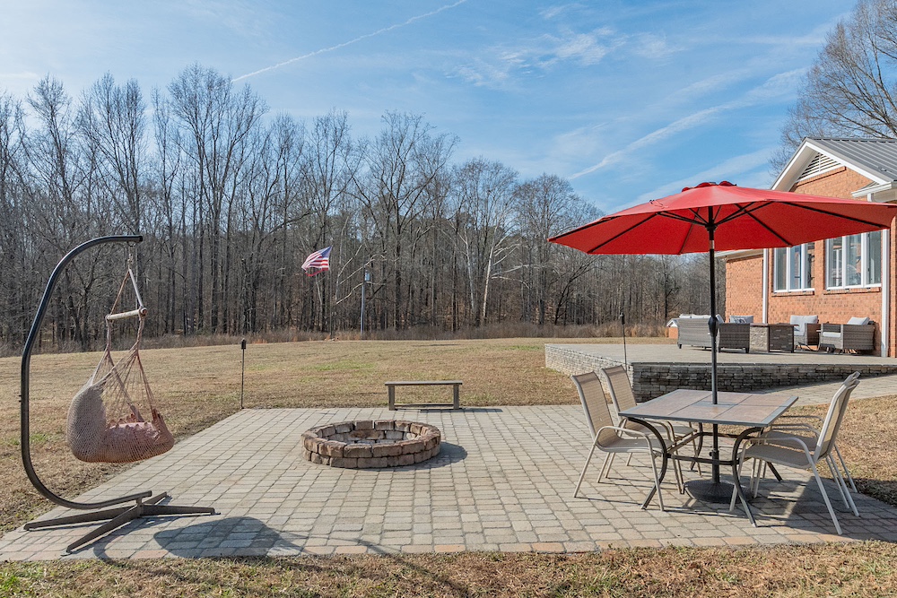 The outdoor living space includes two large backyard patios. One patio is elevated and supported by retaining walls, while the lower patio includes a built-in firepit. These areas offer space for gatherings and outdoor activities. A security camera system is installed on the property.