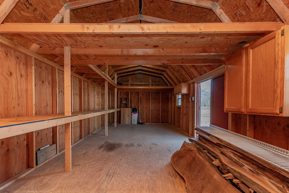 Additional structures include a 2.5 stall detached garage, a 12 by 28 workshop connected to the garage with overhead and service doors, built-in workbenches, and wall storage. There is also a 12 by 28 shed with a 16 by 28 partially enclosed lean-to.
