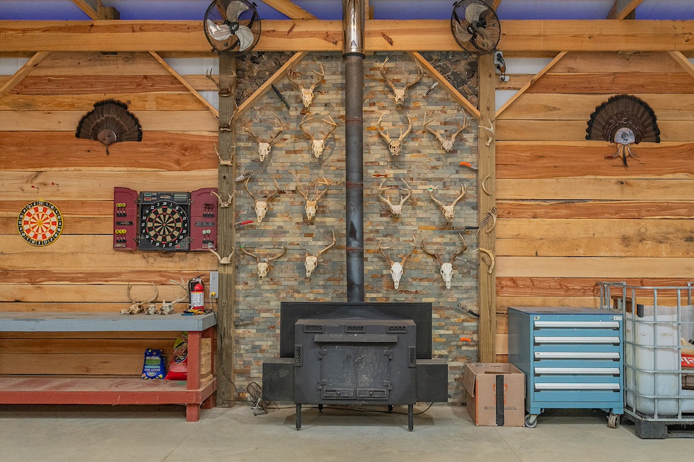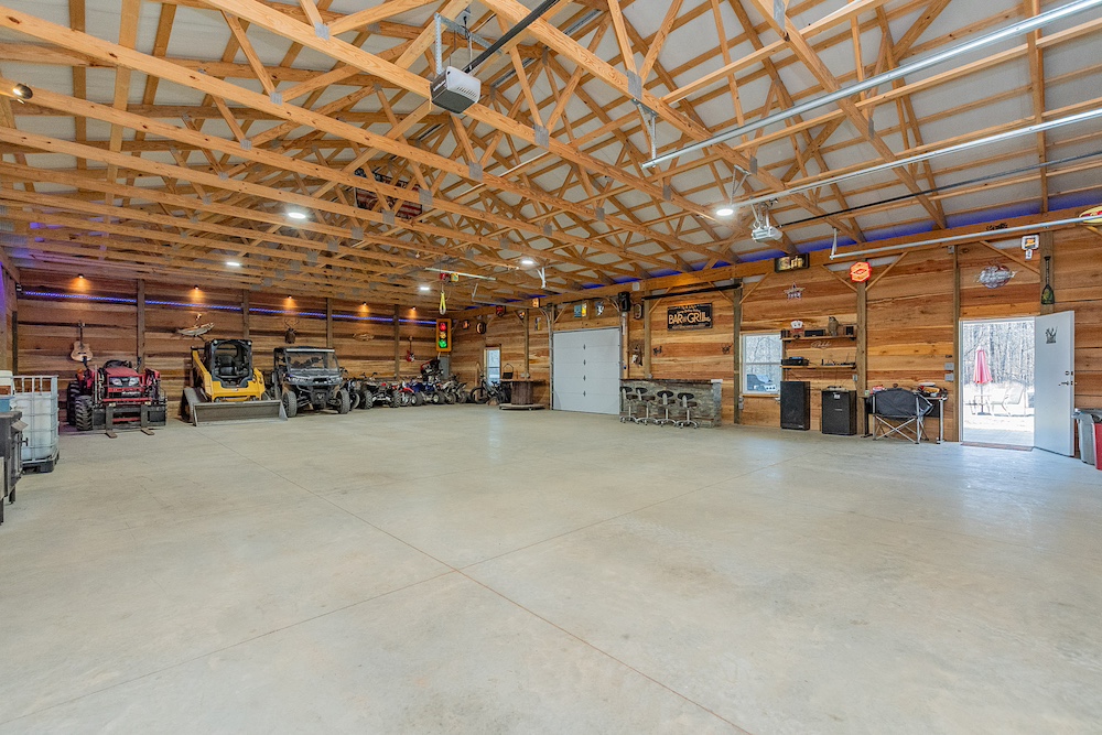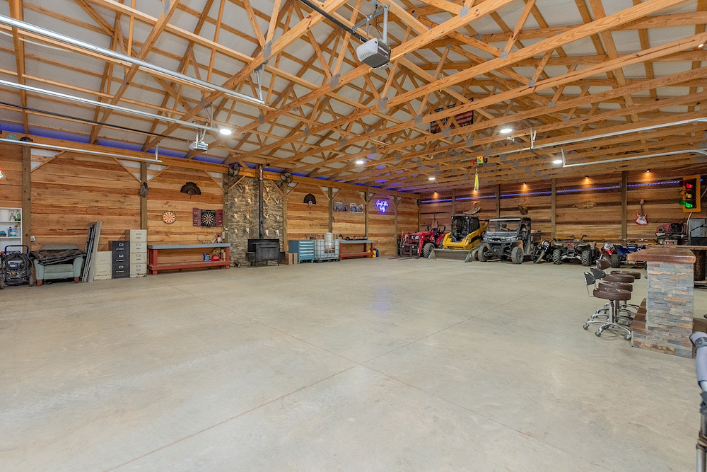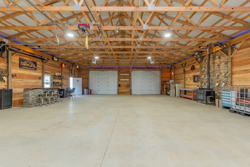 A significant feature of the property is the multi-purpose metal siding pole barn. The building measures approximately 50 by 60 feet with a 40 by 60 feet insulated interior and an attached 10 by 60 feet lighted lean-to. Three insulated overhead doors are equipped with WiFi openers, including one door with battery backup. The interior features custom wood finishes using 10+ tree species and includes a rock wall fireplace with a wood stove. The concrete floor is constructed with 4,000 PSI concrete, fiber reinforcement, mesh, and a thickness of approximately five to six inches. It was built to handle various sorts of equipment and weight.