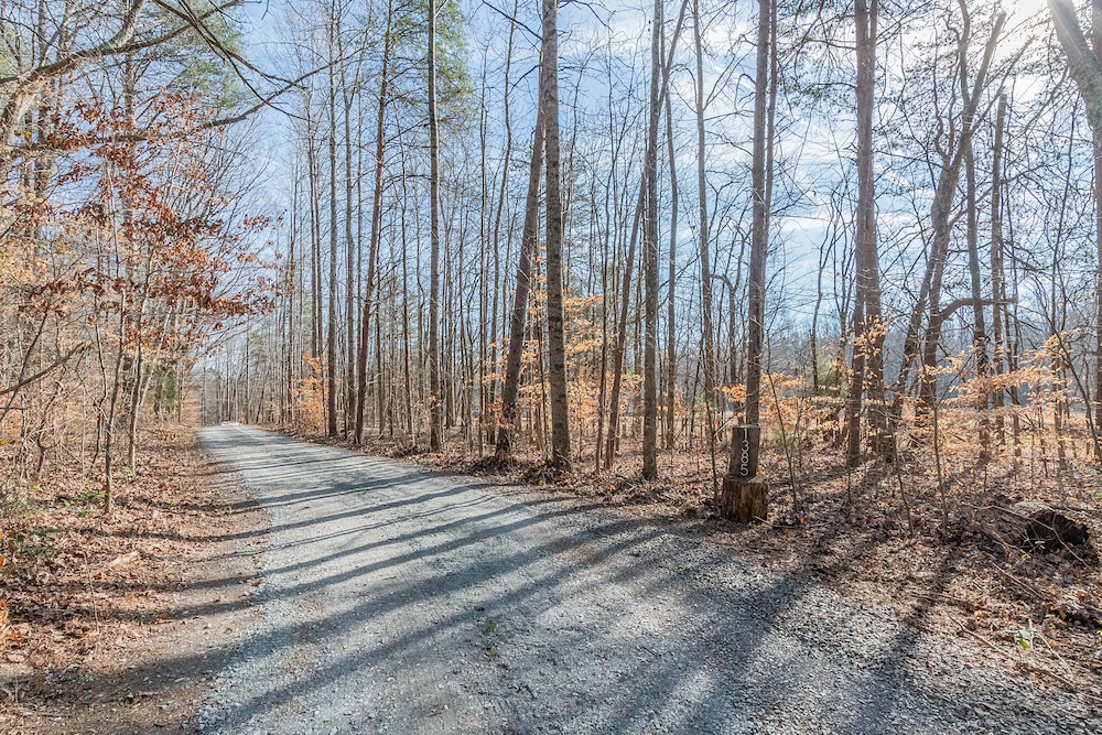 - Long private gravel driveway with wooded approach