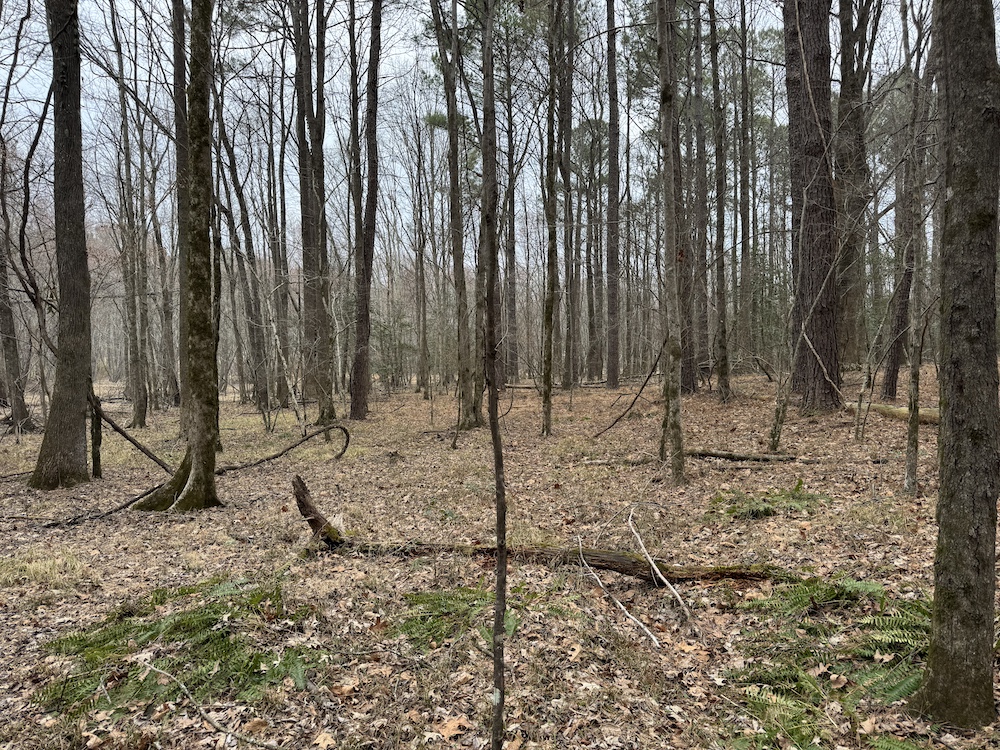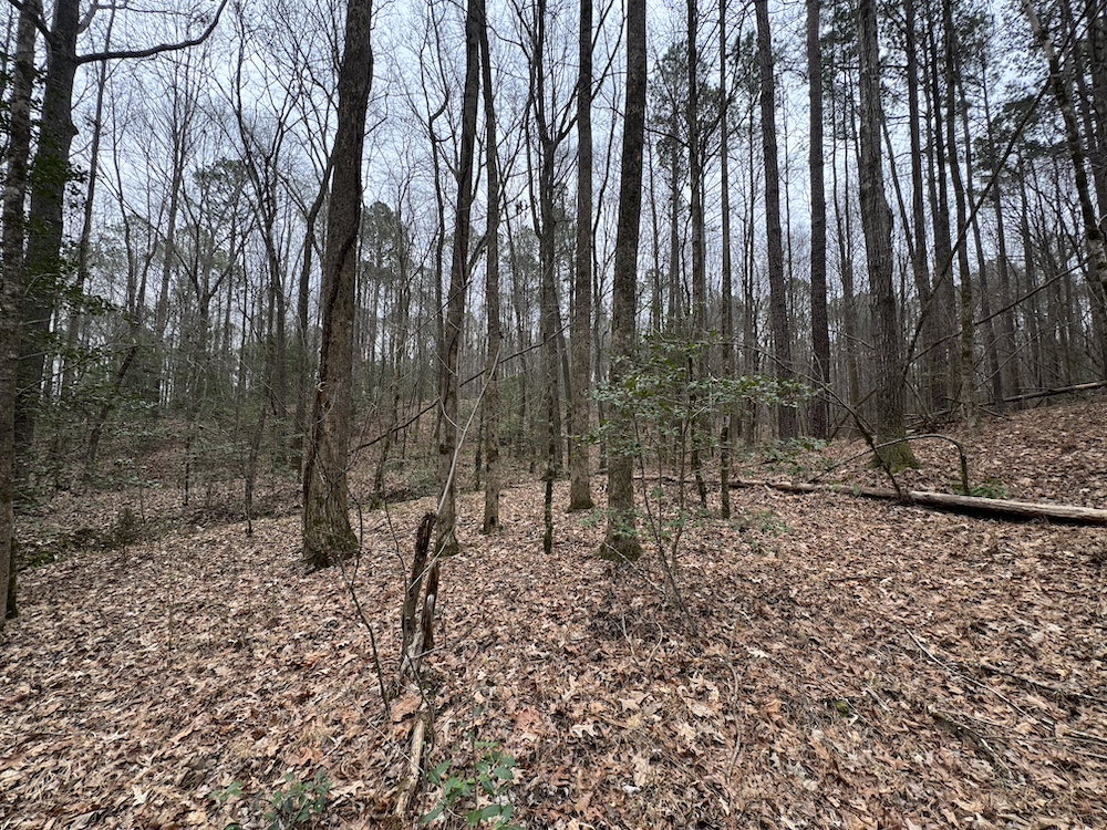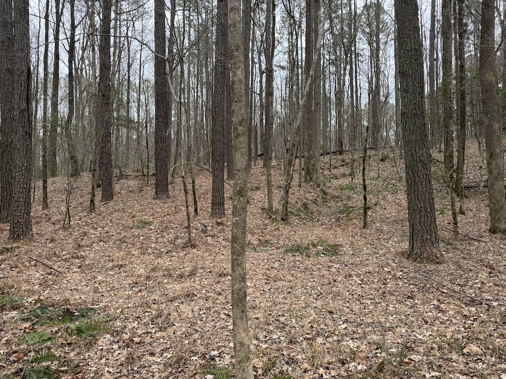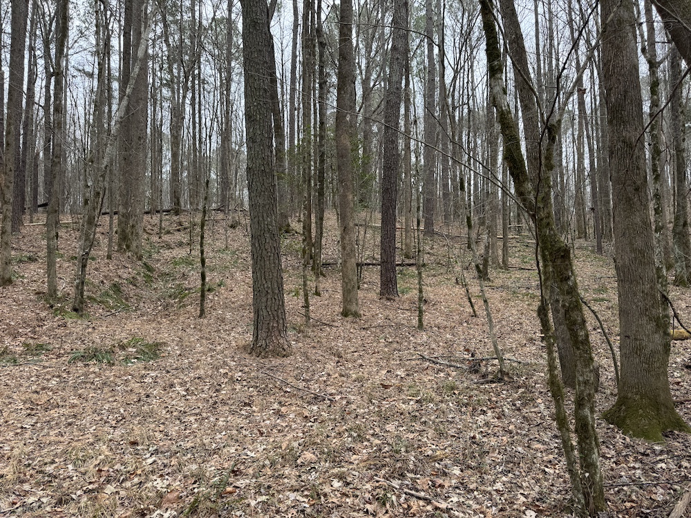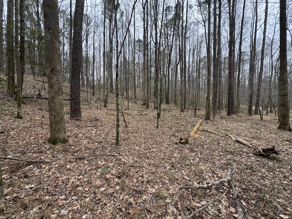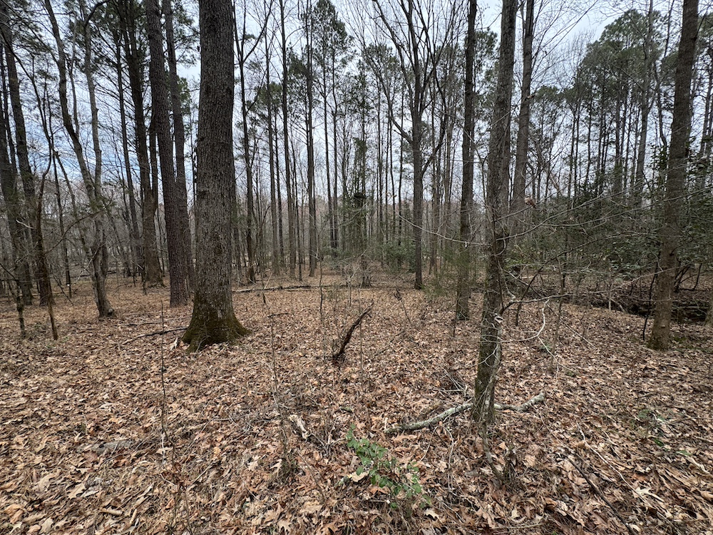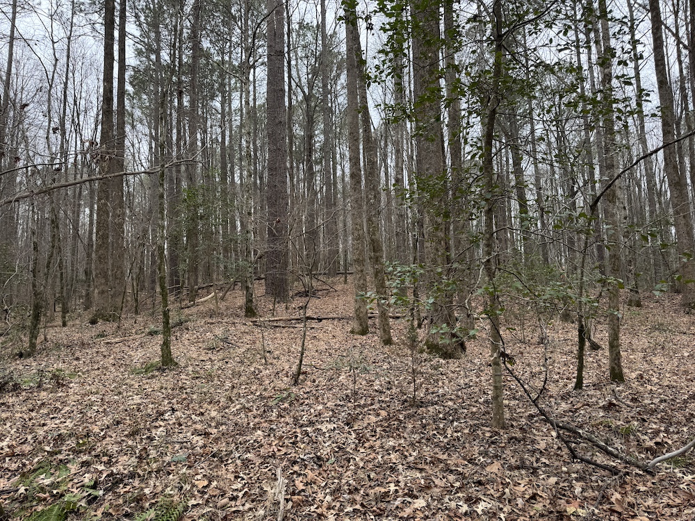 From there, the land rises steadily to the south, topping out on a prominent knoll that sits roughly 60 feet higher than the creek bottom. This elevated ridge is where I immediately envisioned a future homesite. It lays out nicely for either a traditional graded foundation or a custom home with a walkout basement that would look back toward the stream and wetland bottom. Mature pines and mixed hardwoods cover the ridgeline, offering the option to selectively open up the canopy for a yard and long‑range views, or keep things tucked and private among the trees.