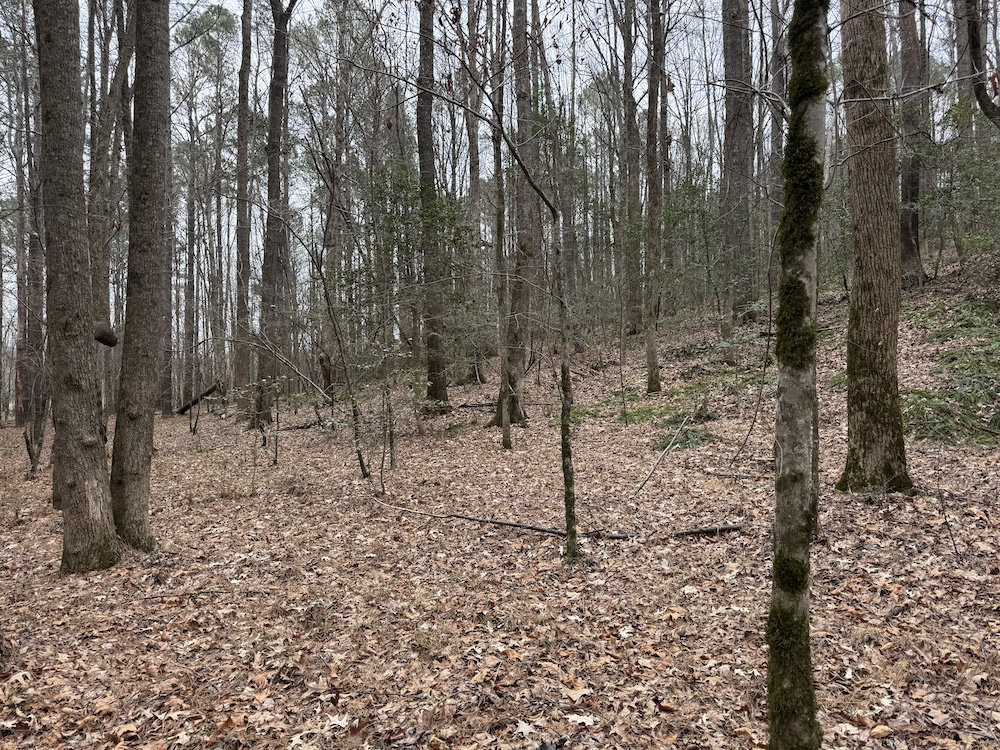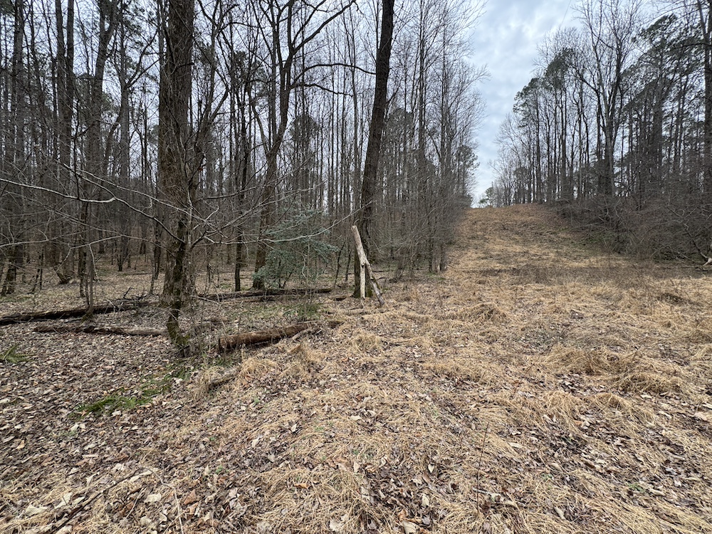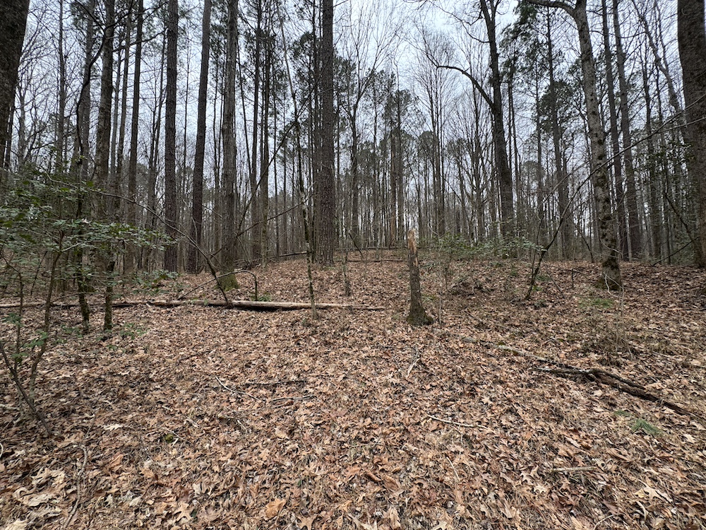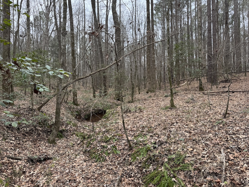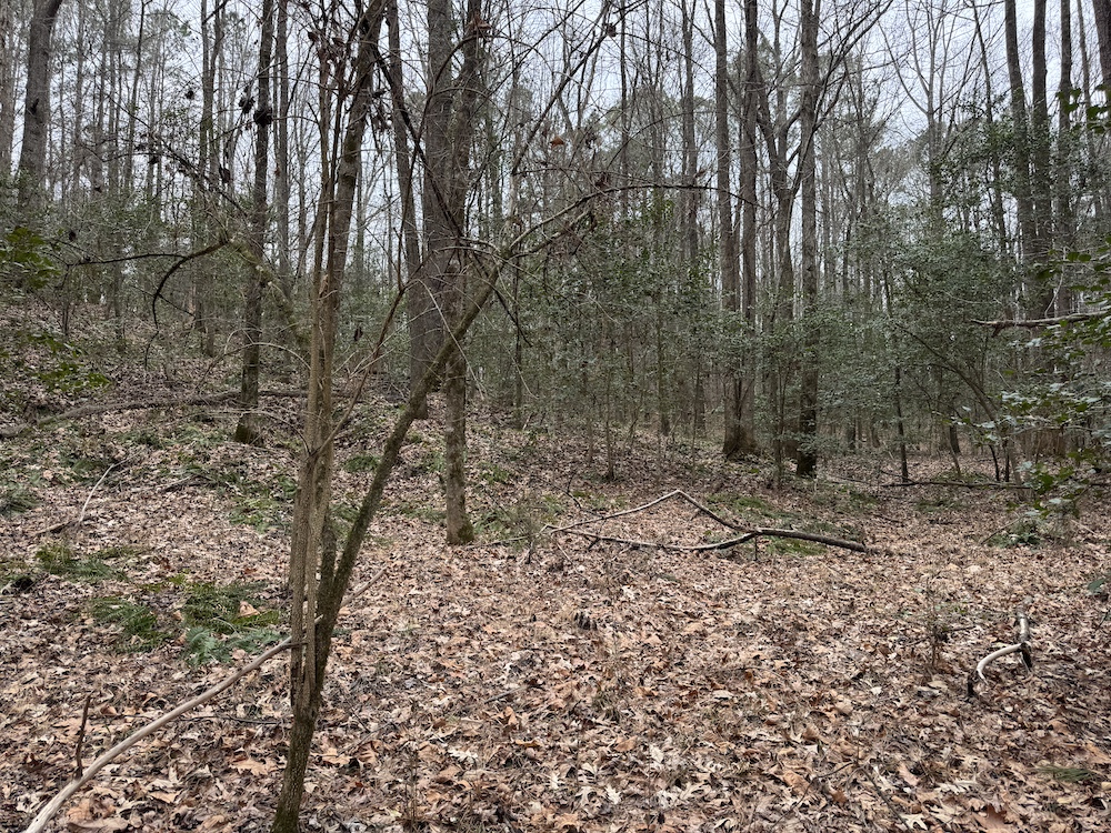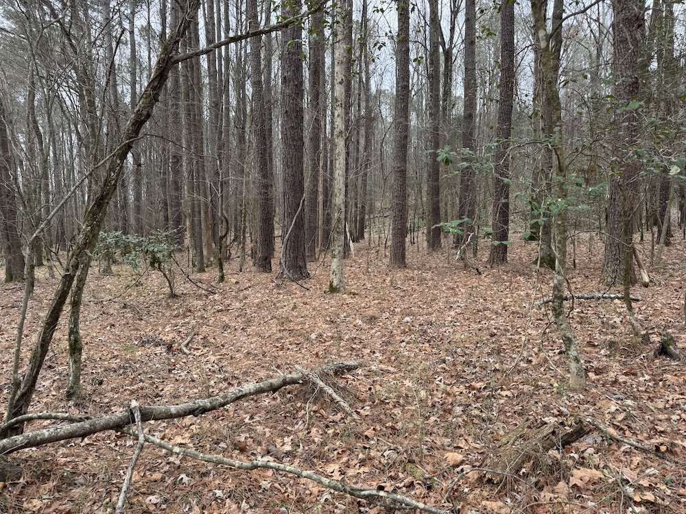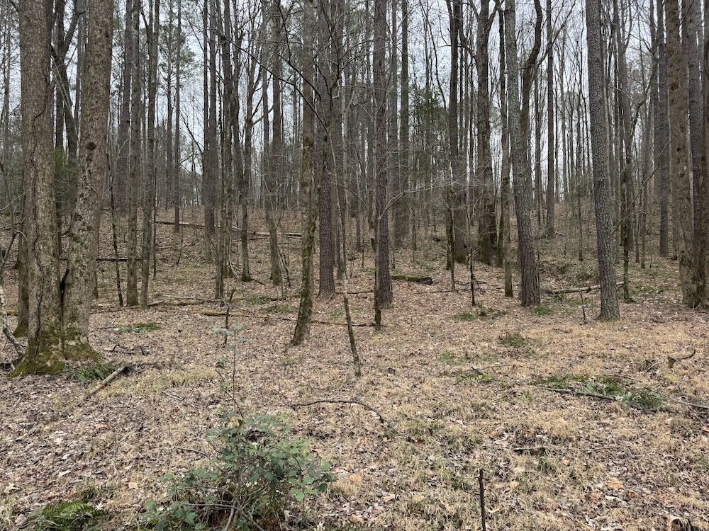 From there, the land rises steadily to the south, topping out on a prominent knoll that sits roughly 60 feet higher than the creek bottom. This elevated ridge is where I immediately envisioned a future homesite. It lays out nicely for either a traditional graded foundation or a custom home with a walkout basement that would look back toward the stream and wetland bottom. Mature pines and mixed hardwoods cover the ridgeline, offering the option to selectively open up the canopy for a yard and long‑range views, or keep things tucked and private among the trees.