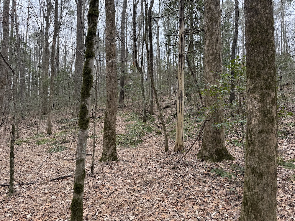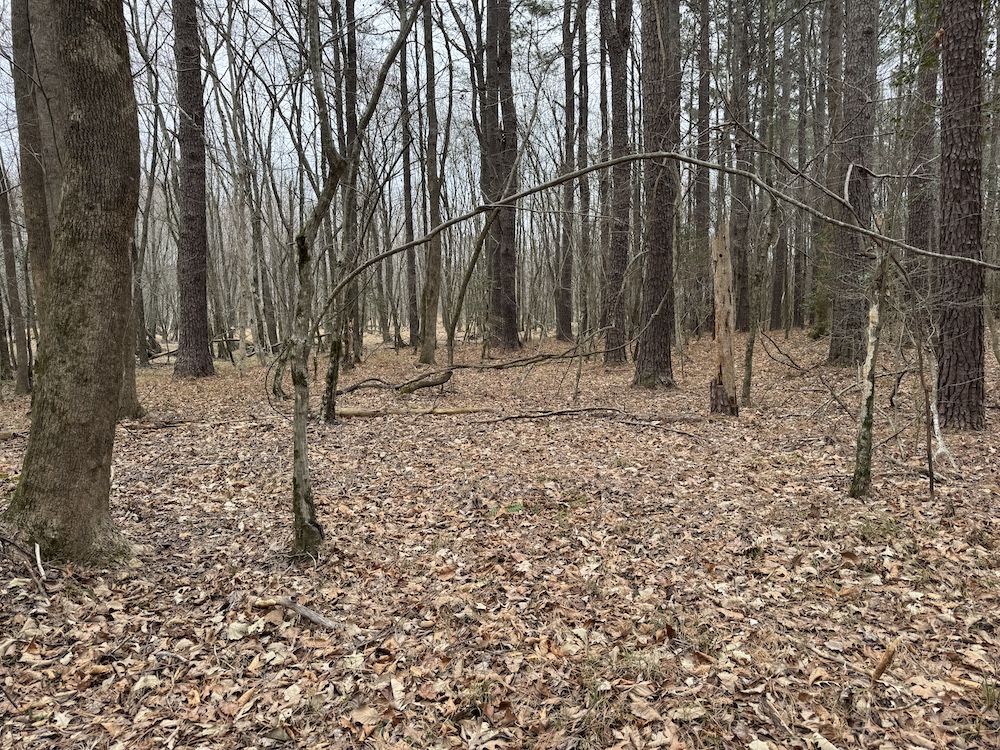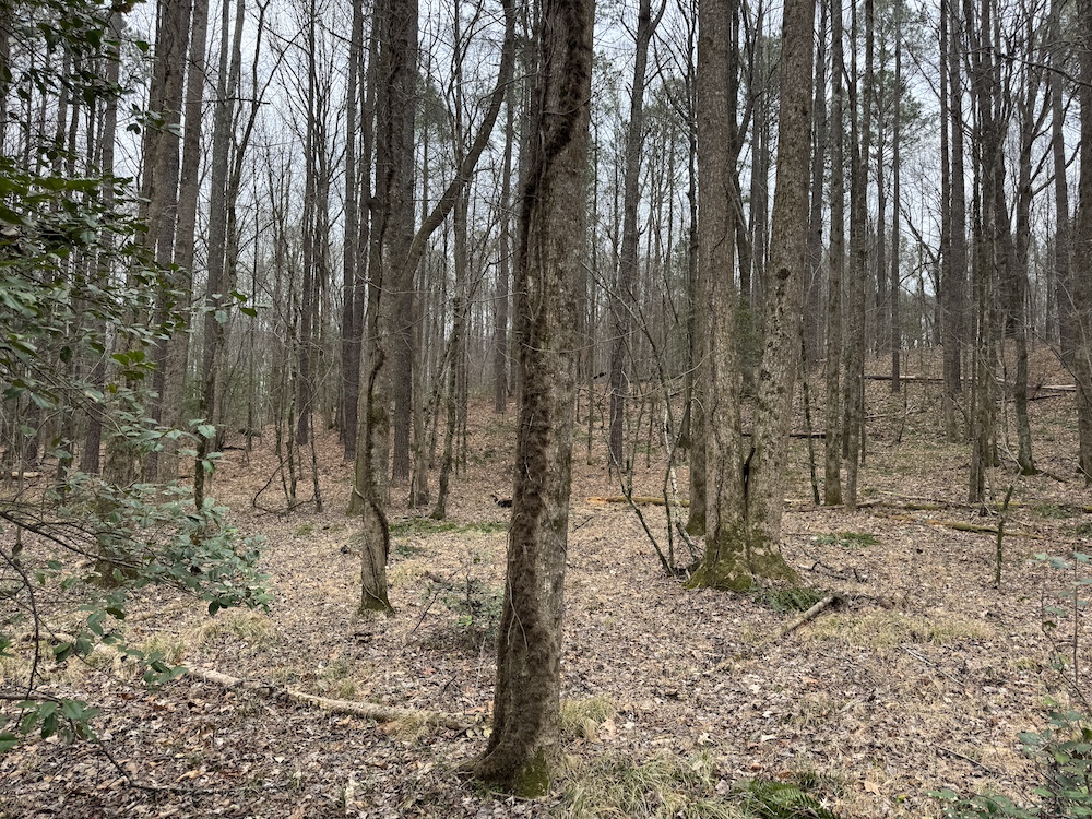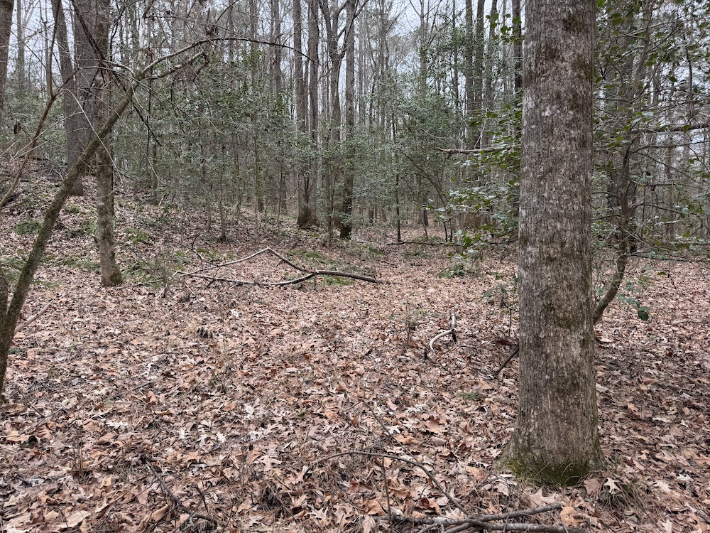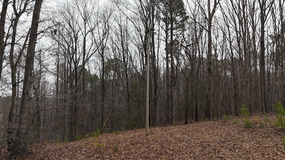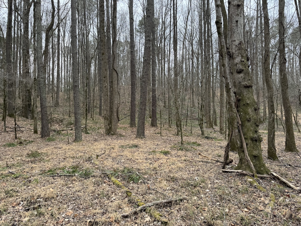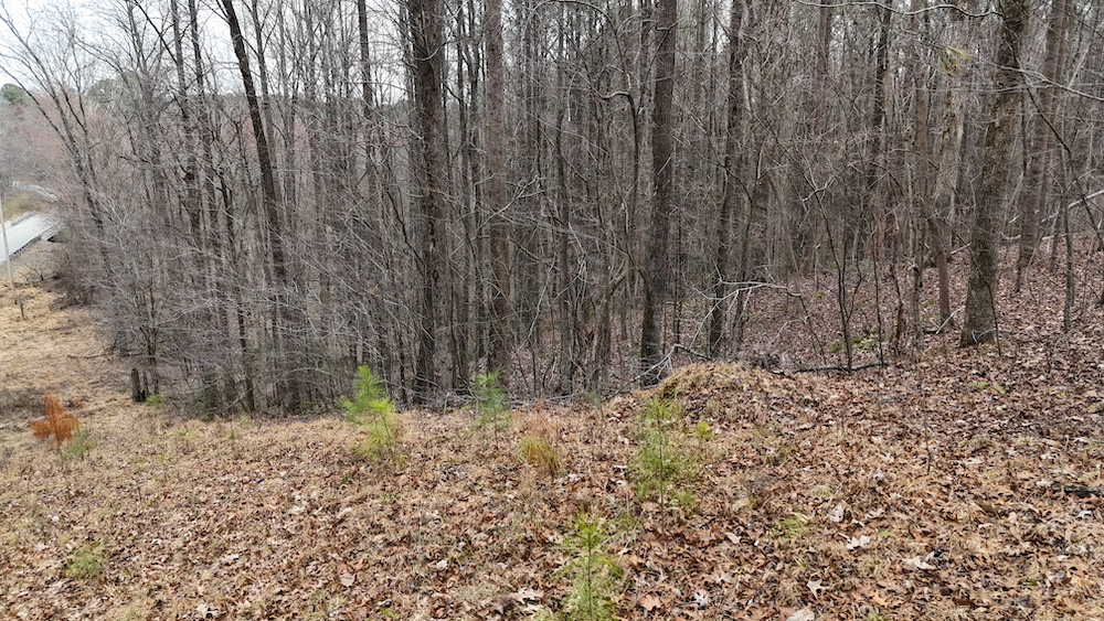 From there, the land rises steadily to the south, topping out on a prominent knoll that sits roughly 60 feet higher than the creek bottom. This elevated ridge is where I immediately envisioned a future homesite. It lays out nicely for either a traditional graded foundation or a custom home with a walkout basement that would look back toward the stream and wetland bottom. Mature pines and mixed hardwoods cover the ridgeline, offering the option to selectively open up the canopy for a yard and long‑range views, or keep things tucked and private among the trees.