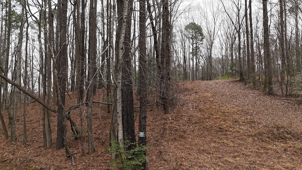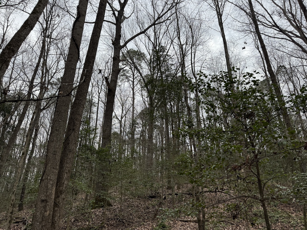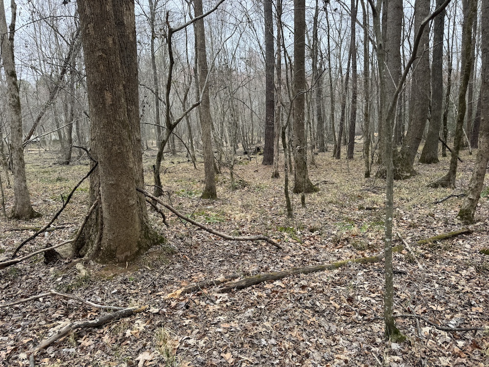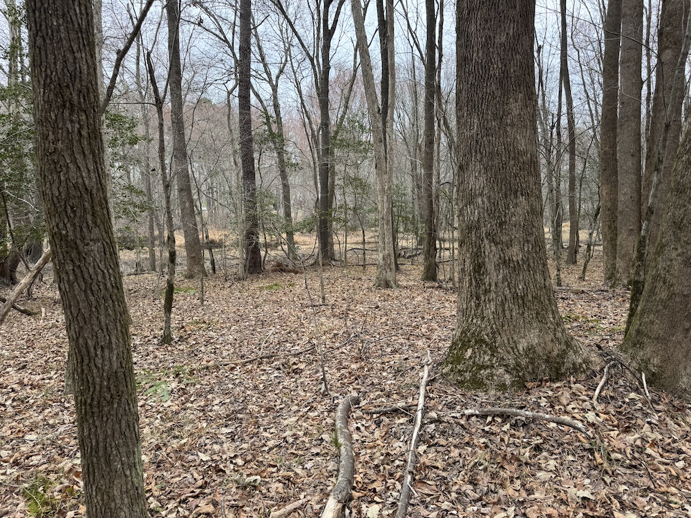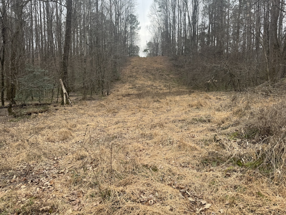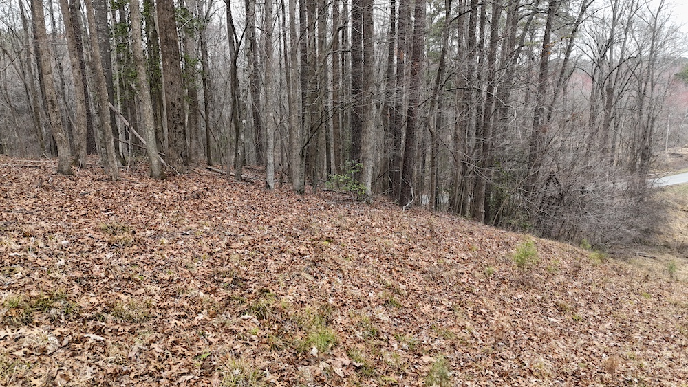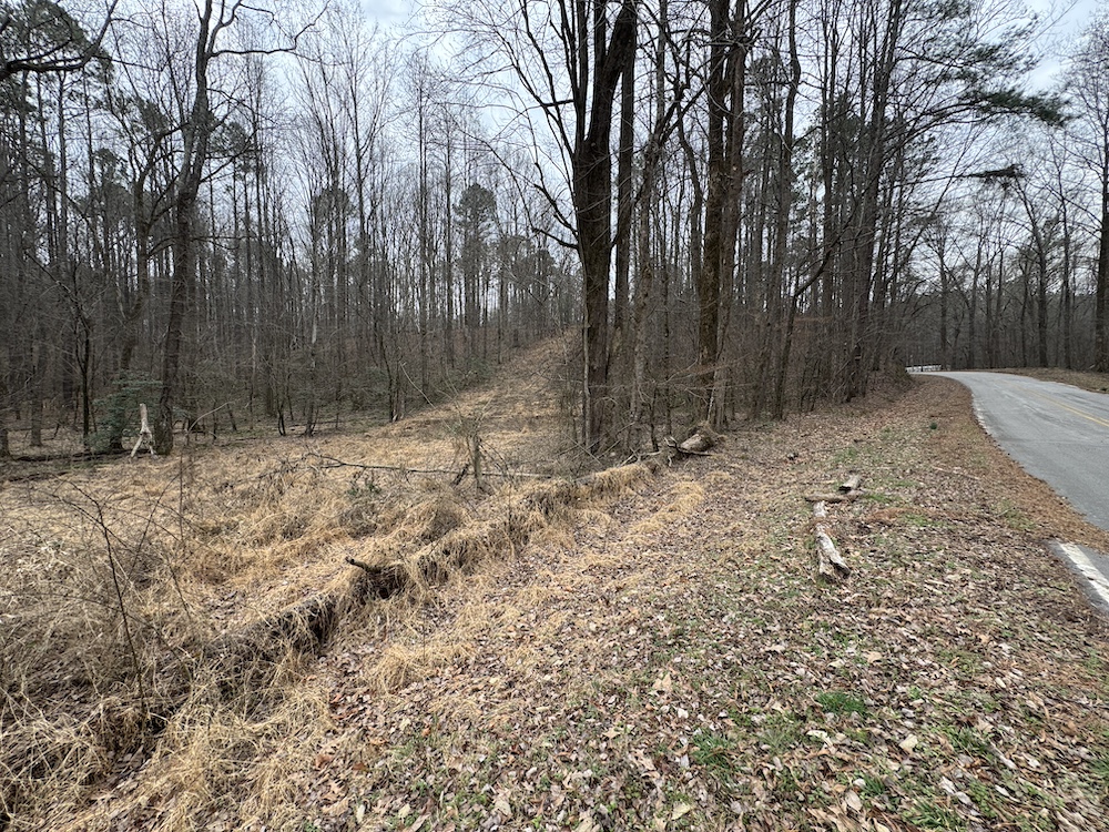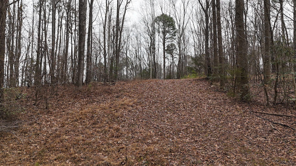 From there, the land rises steadily to the south, topping out on a prominent knoll that sits roughly 60 feet higher than the creek bottom. This elevated ridge is where I immediately envisioned a future homesite. It lays out nicely for either a traditional graded foundation or a custom home with a walkout basement that would look back toward the stream and wetland bottom. Mature pines and mixed hardwoods cover the ridgeline, offering the option to selectively open up the canopy for a yard and long‑range views, or keep things tucked and private among the trees.