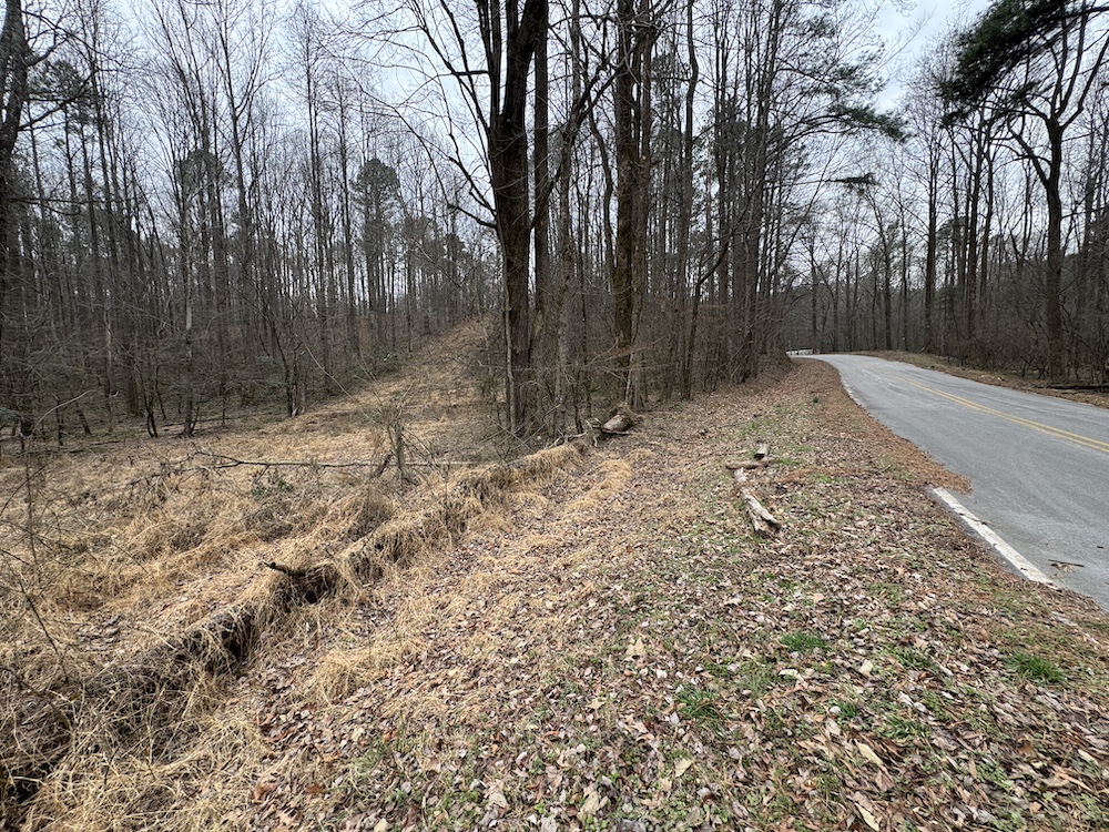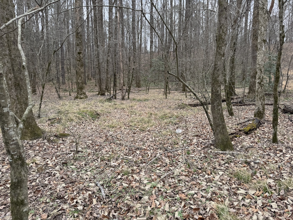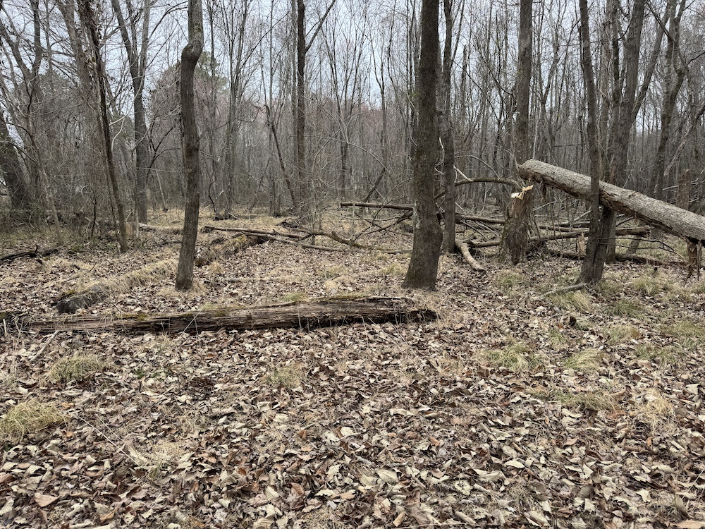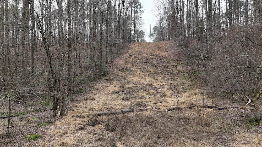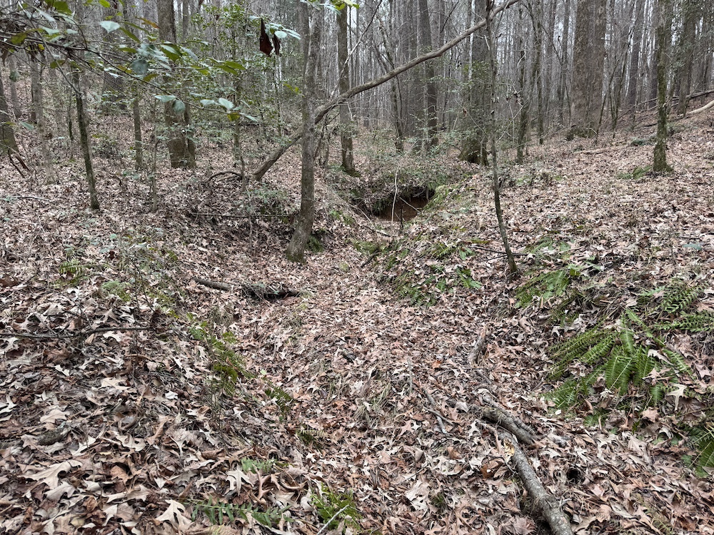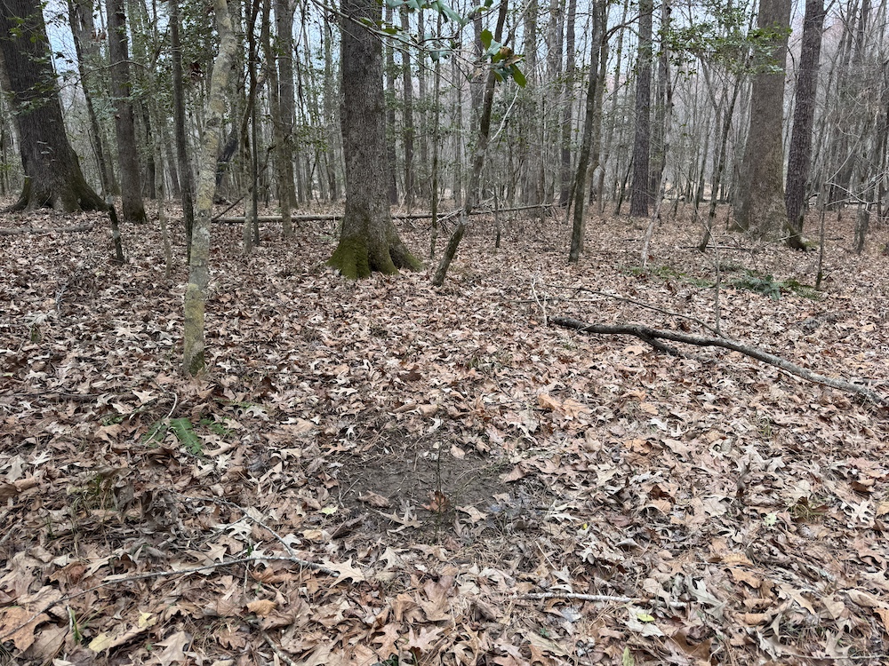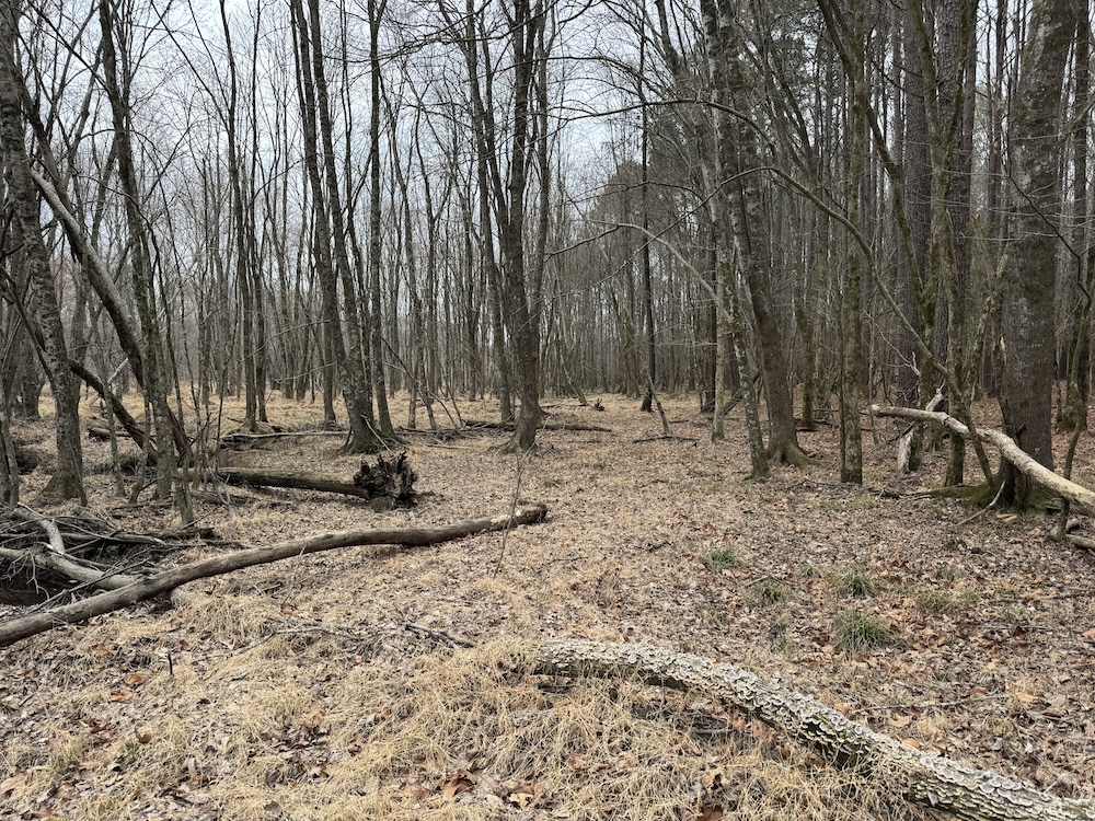From there, the land rises steadily to the south, topping out on a prominent knoll that sits roughly 60 feet higher than the creek bottom. This elevated ridge is where I immediately envisioned a future homesite. It lays out nicely for either a traditional graded foundation or a custom home with a walkout basement that would look back toward the stream and wetland bottom. Mature pines and mixed hardwoods cover the ridgeline, offering the option to selectively open up the canopy for a yard and long‑range views, or keep things tucked and private among the trees.