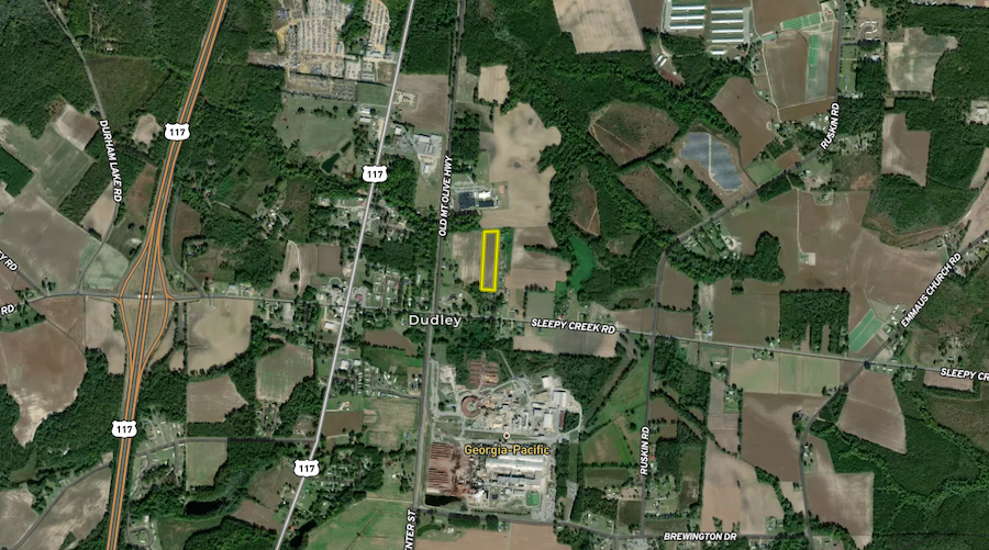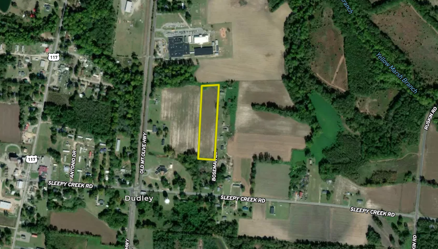 Accessed via dirt path, this vacant lot in Dudley, Wayne County, offers a strategic location just under a mile from US-117, making it accessible and close to local amenities. Positioned 9 miles south of Goldsboro and 6 miles north of Mount Olive, the lot is currently used for agriculture but presents great potential for more. The property is bordered by residential homes, indicating that power and water lines are nearby. Although it doesn't have road frontage, its proximity to highways, a local gas station, and nearby eateries enhances its value. Additionally, Brogden Primary School is located just north of the property, making it a potential residential site or continuing agricultural investment. This site could be a great investment due to its vicinity to Goldsboro.