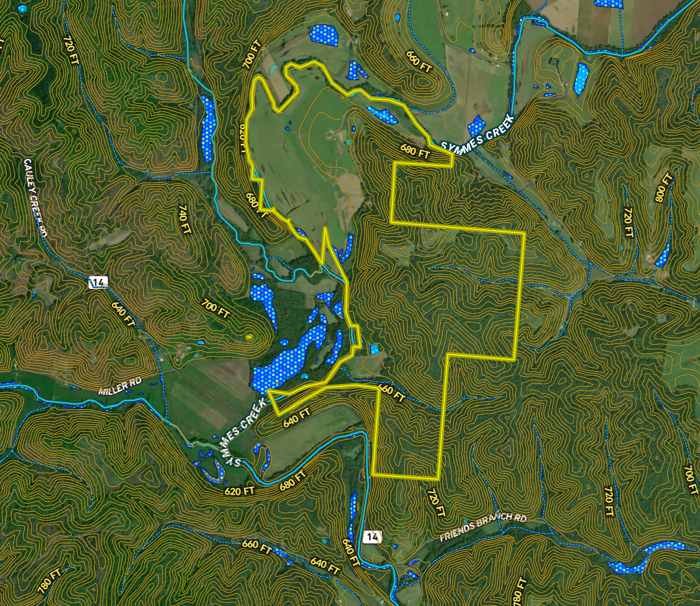 Small Game, Big Game, Predators, Waterfowl, Fish, Creek/Spring, Food Plot, Tree Stands/Blinds, Trail Network, Grain Storage