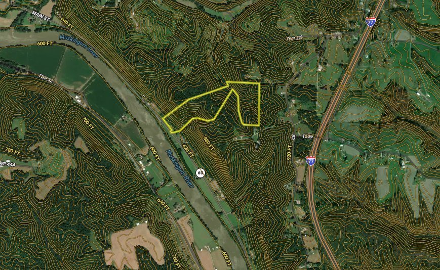 This unique hunting property borders State Route 60 and overlooks the nearby Muskingum River. Ample parking for vehicles and/or a camper is provided at the entrance to the property, along with electricity. An ATV/UTV trail system will lead through the elongated property that offers multiple hunting locations, including an ideal food plot location on top of the ridge. Also, there's a gas pipeline right-of-way near the top of the hardwood ridge that offers greater visibility of the property, as well as an ideal travel route for all sorts of wild game, including deer and turkey.