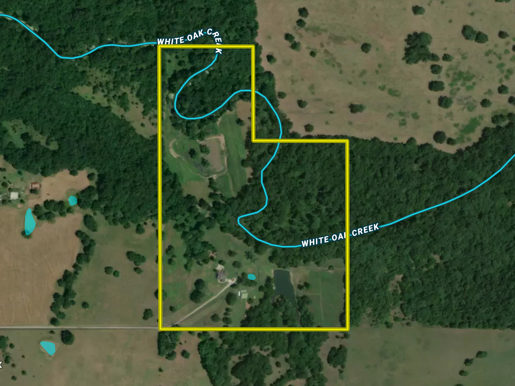WATER: There is no shortage of water on this tract with multiple ponds and the beautiful White Oak Creek. The creek winds through ½ mile of the property and offers a great year-round source of water for wildlife, and even the chance to catch some crawdads or cool off during the hot summer days. There are two ponds that are both visible from the house and offer a great place to sit and relax. Toss a line and catch some crappie for a great night of grilling out, or hop in the duck blinds during the winter and shoot some ducks and geese.