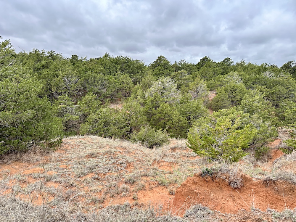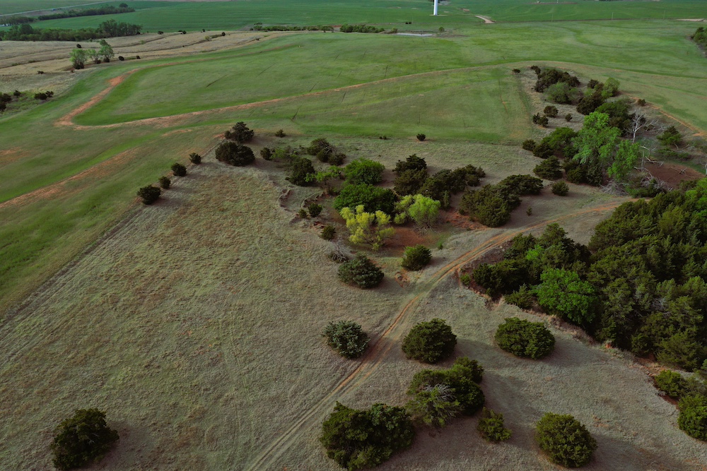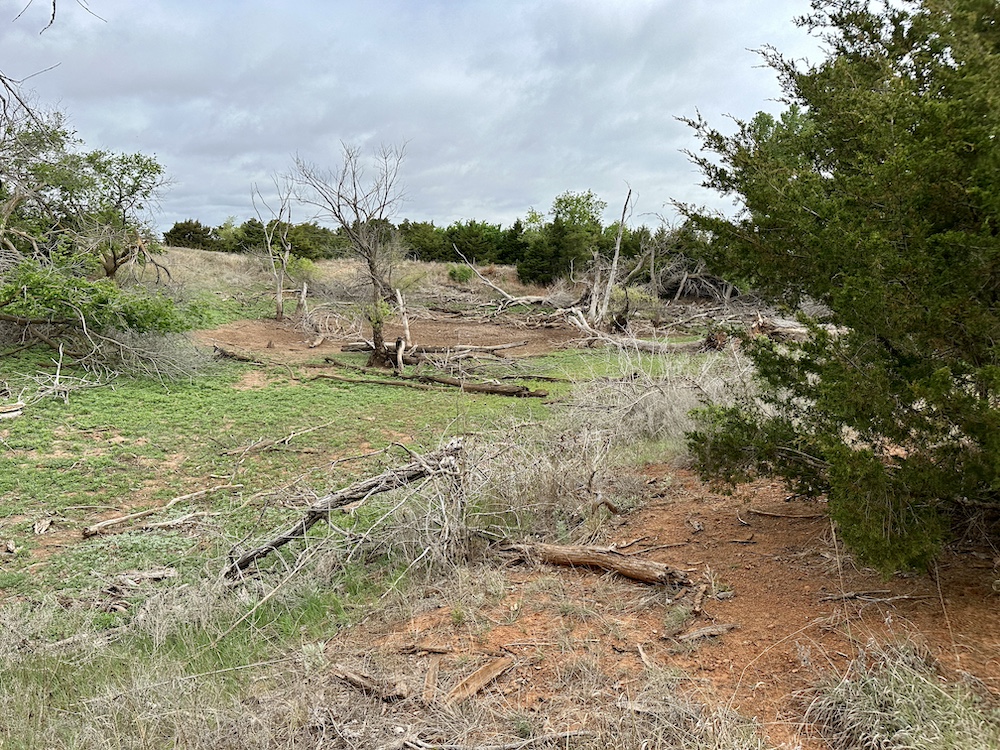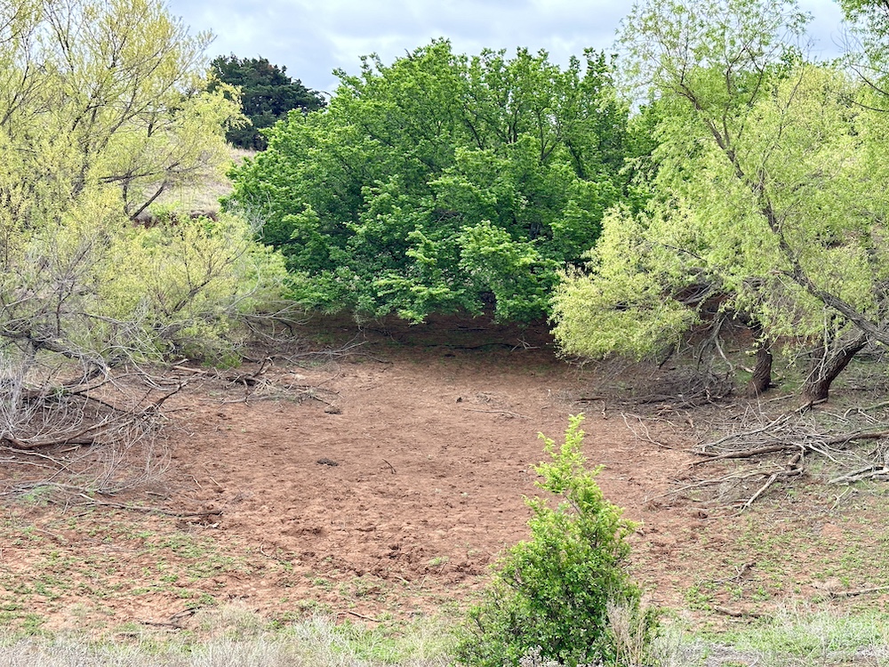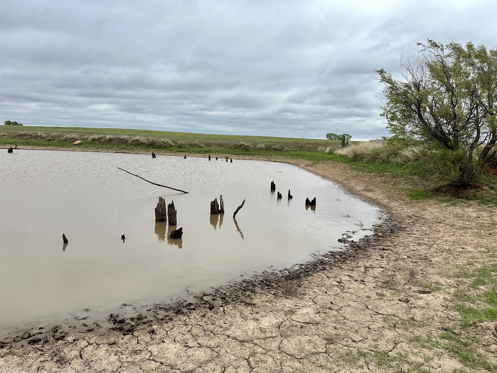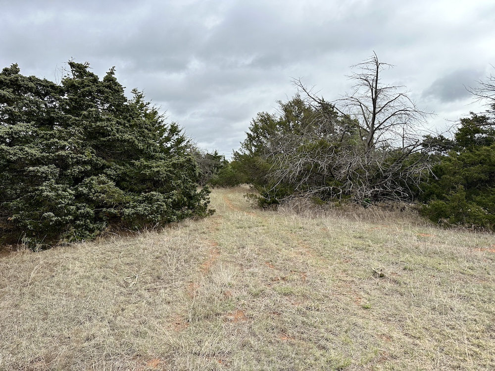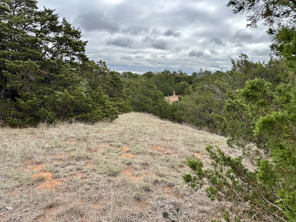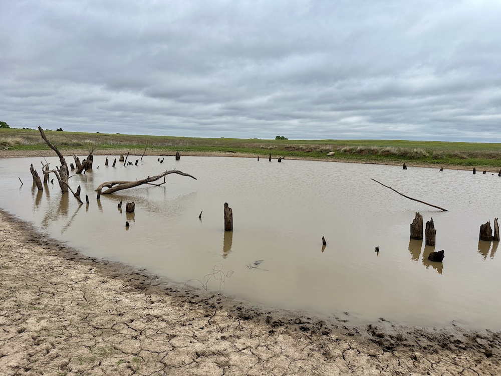 It has a scenic creek bottom with cedars and hardwoods. This draw feeds two small catch ponds, which could be made into a much larger pond with a little dozer work. There’s also a small catch pond along the road holding water.