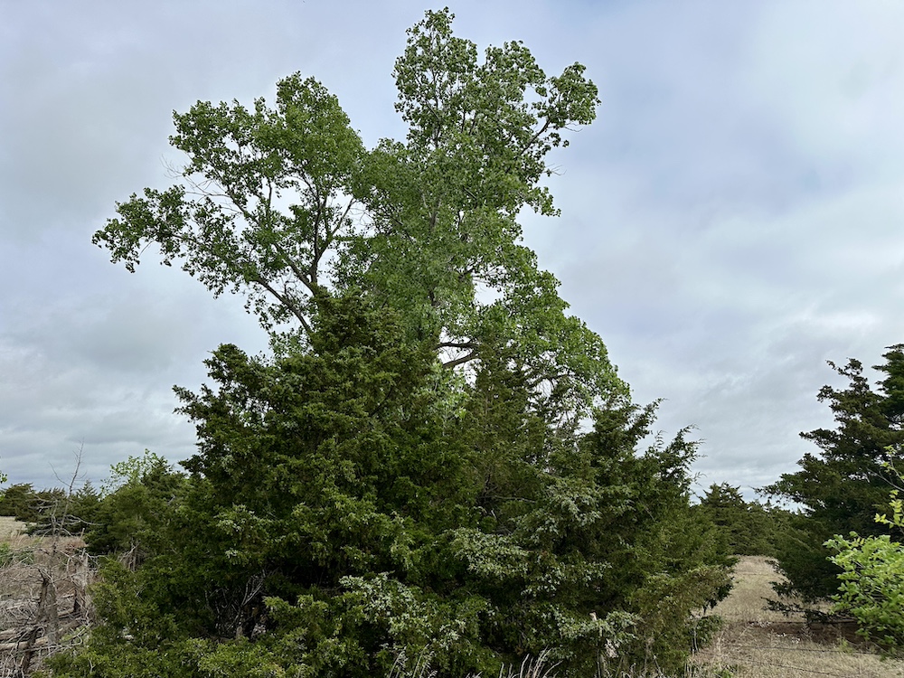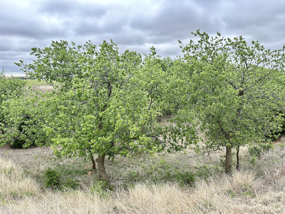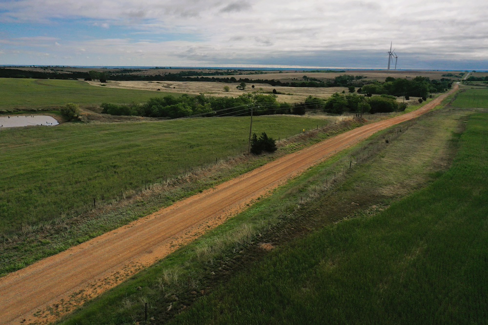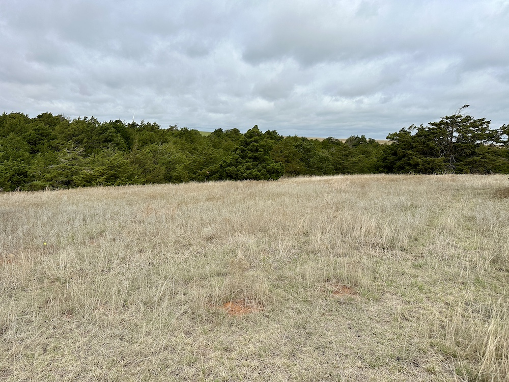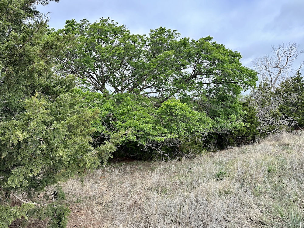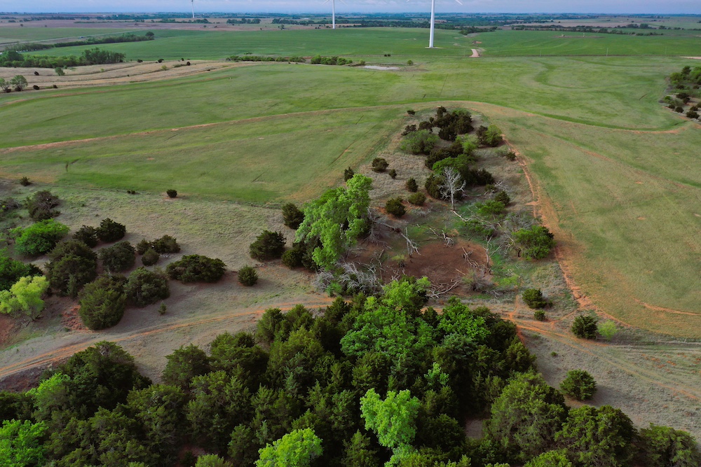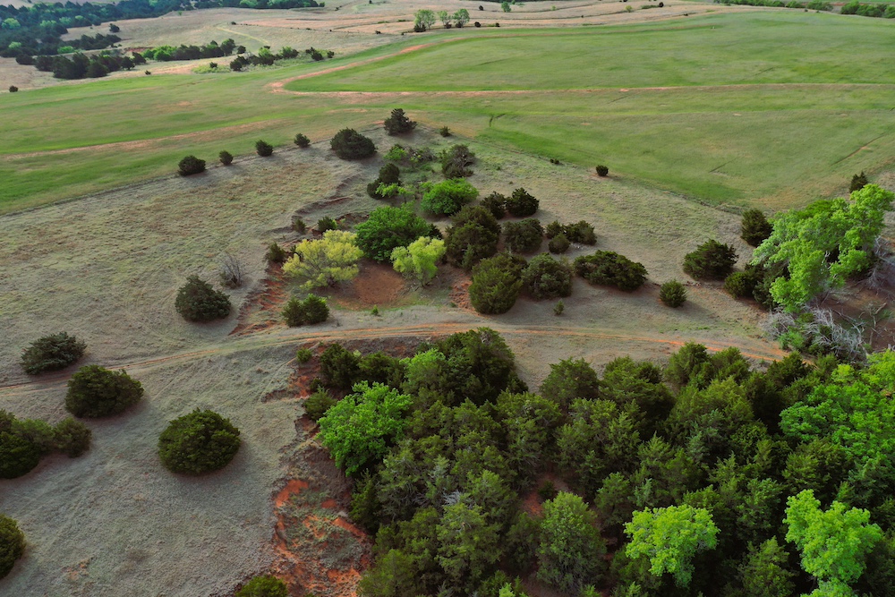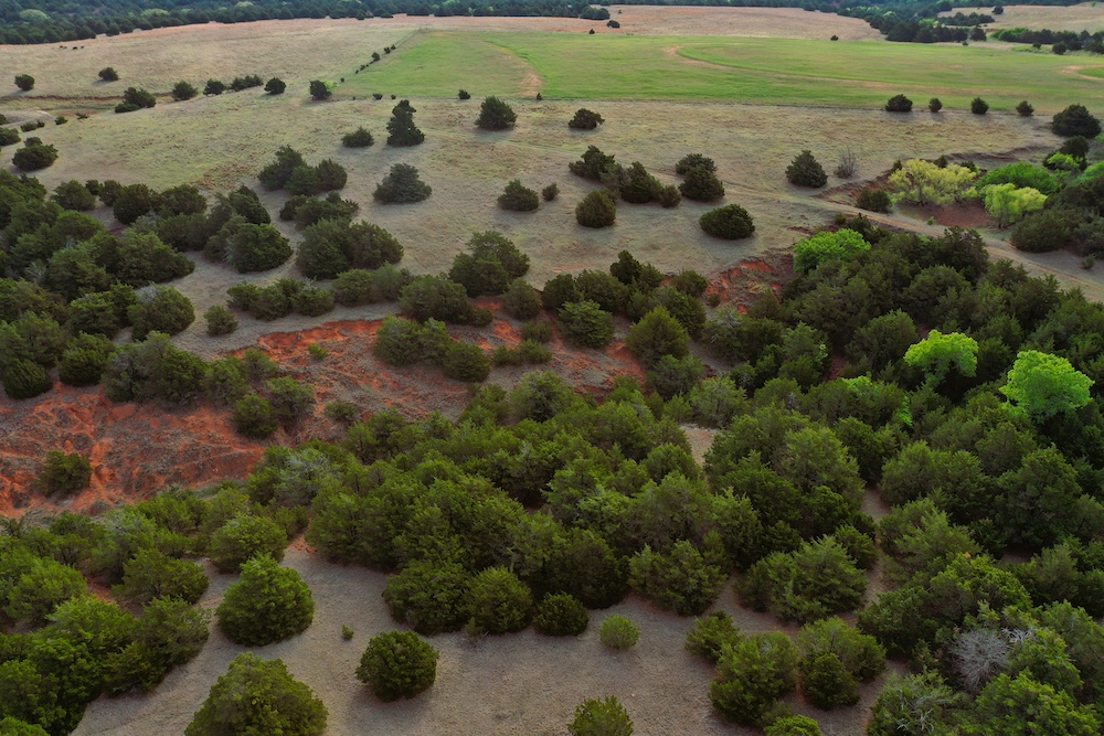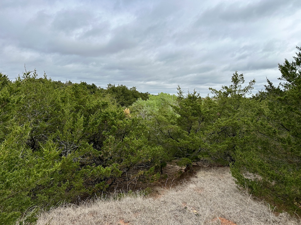 It has a scenic creek bottom with cedars and hardwoods. This draw feeds two small catch ponds, which could be made into a much larger pond with a little dozer work. There’s also a small catch pond along the road holding water.