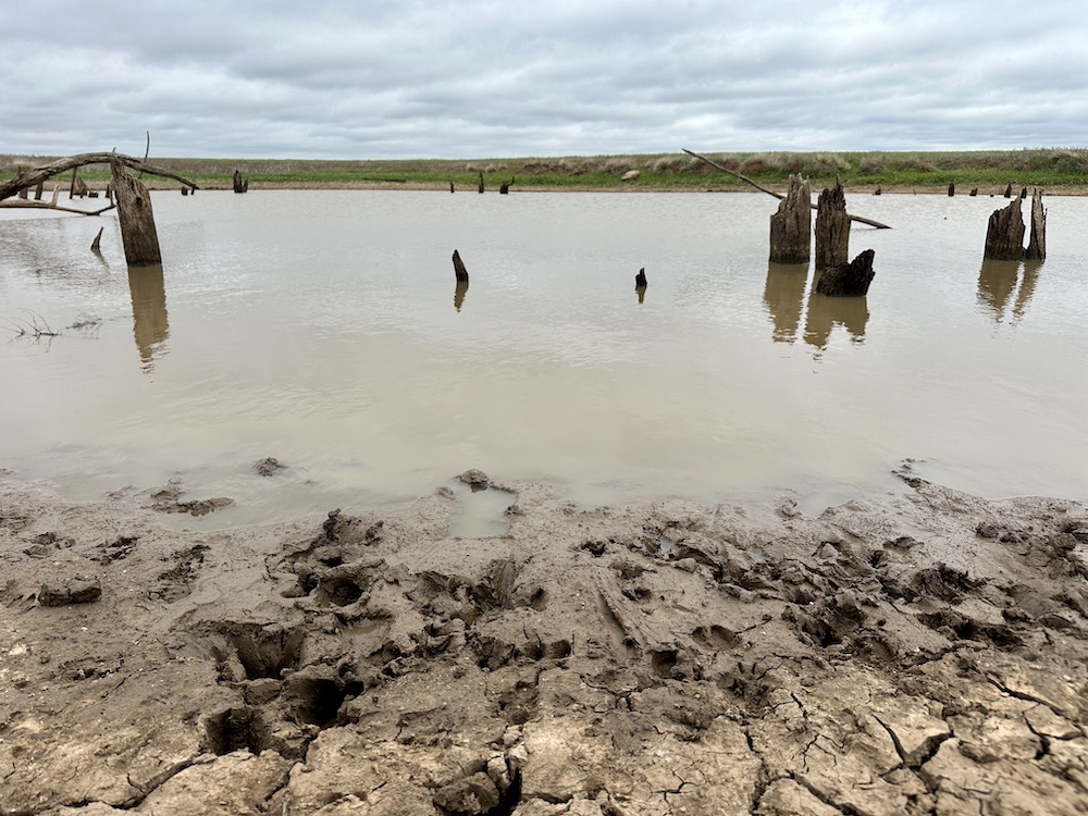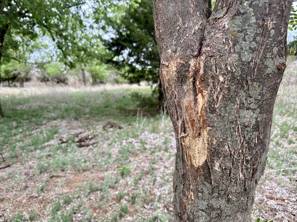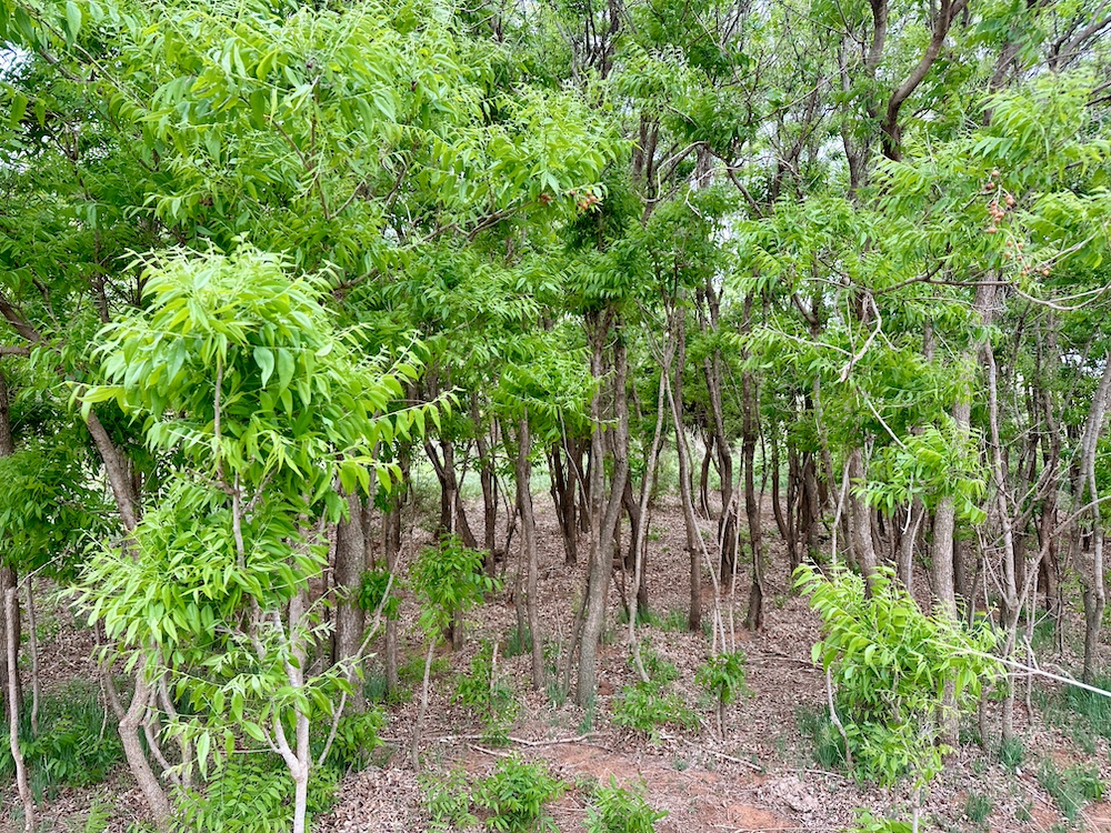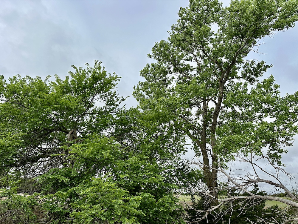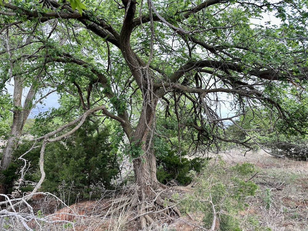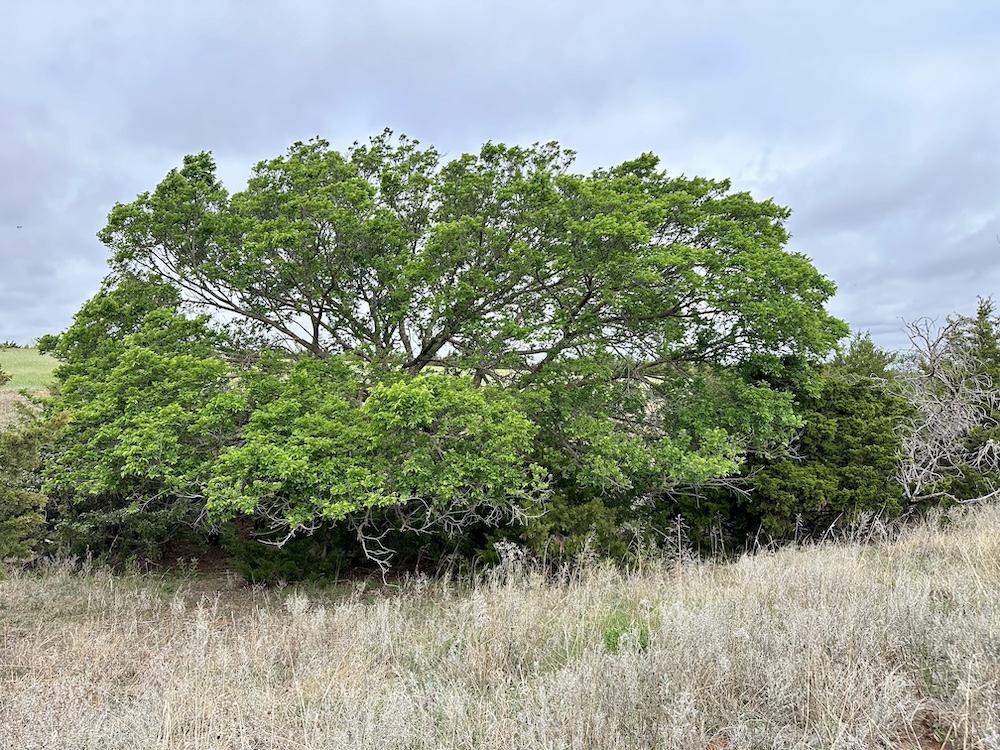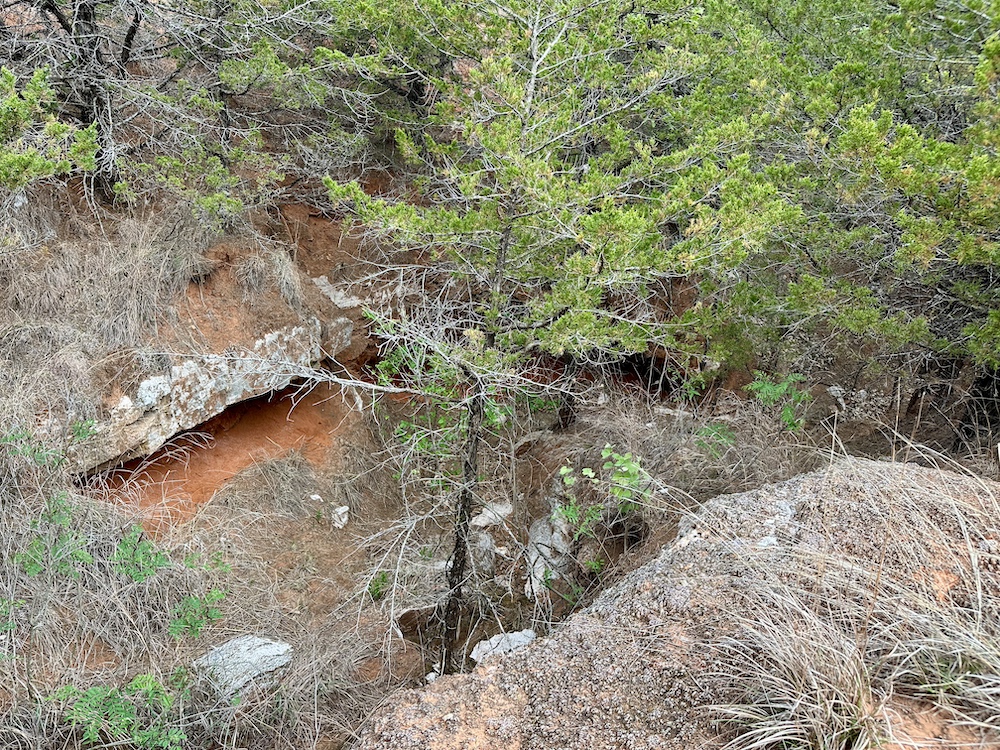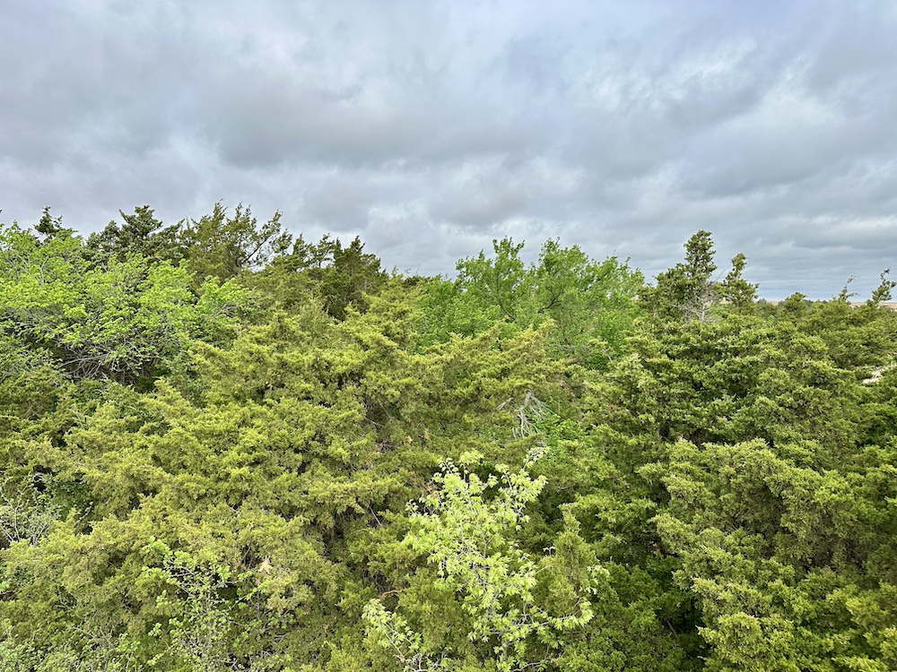 It has a scenic creek bottom with cedars and hardwoods. This draw feeds two small catch ponds, which could be made into a much larger pond with a little dozer work. There’s also a small catch pond along the road holding water.
