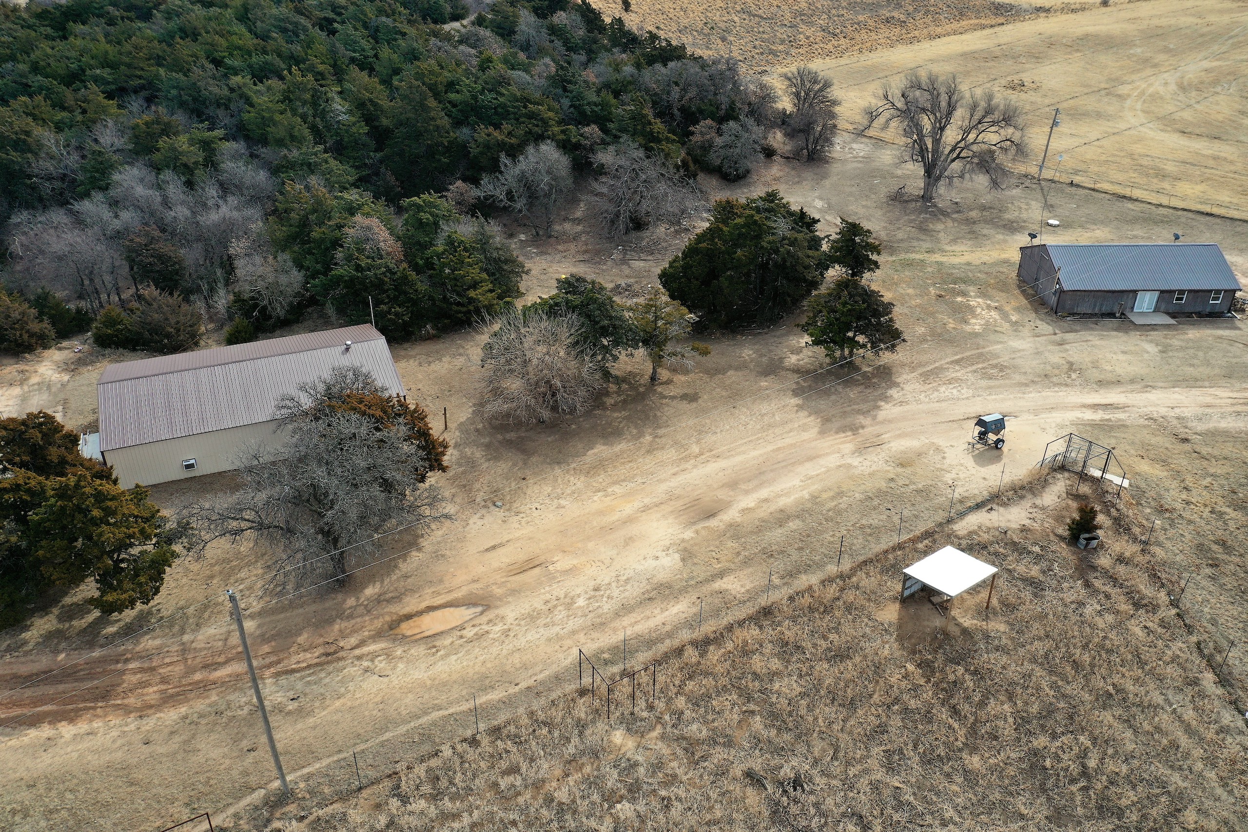 Overlooking the pond and main canyon, and only steps away from the bank, is a newly remodeled cabin that includes all the amenities of home. It has 2 bedrooms, 1 bathroom, and is set up to sleep 7. There’s a garage/lean-to next to the Cabin for storing all the equipment needed for enjoying and maintaining the property. On the southeast corner of the tract is a Tenant’s home along with an insulated, heated/cooled, metal building. The building had previously been set up as a Cannabis grow-house. It still has all the equipment and materials inside. It has 3 Grow-rooms(each with cooling and special lighting), a Harvest-room, Drying-room, and Office.