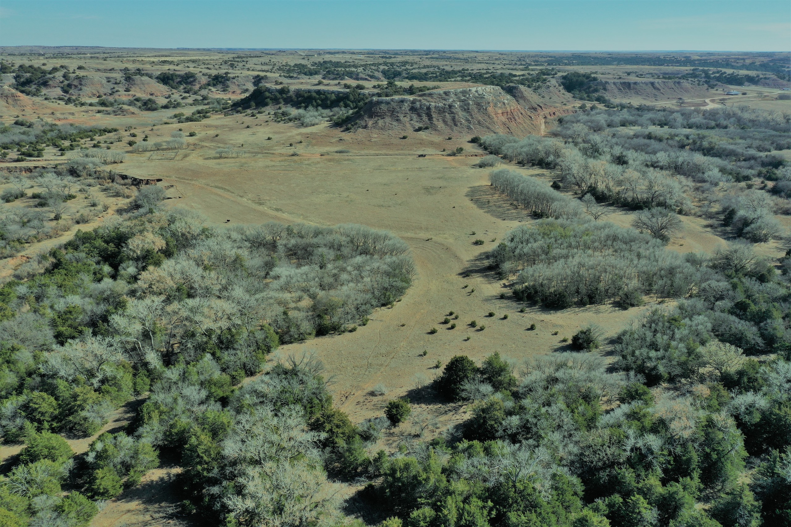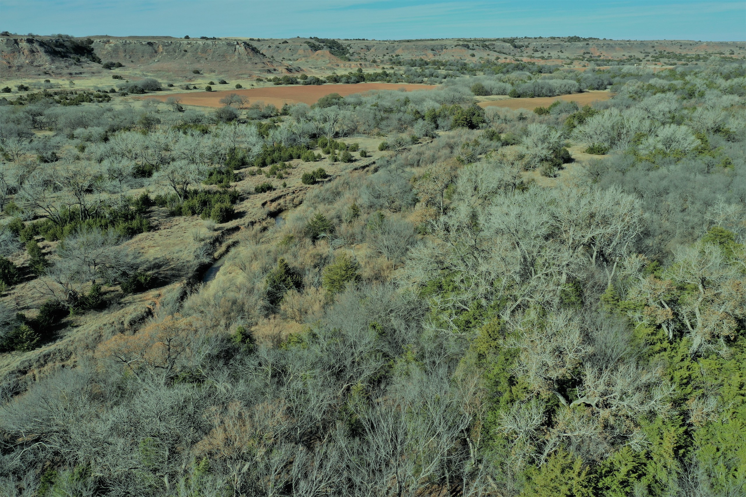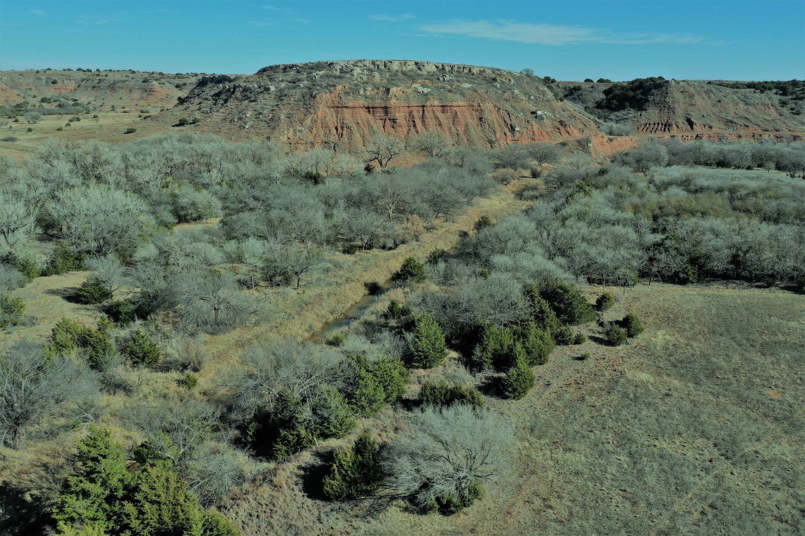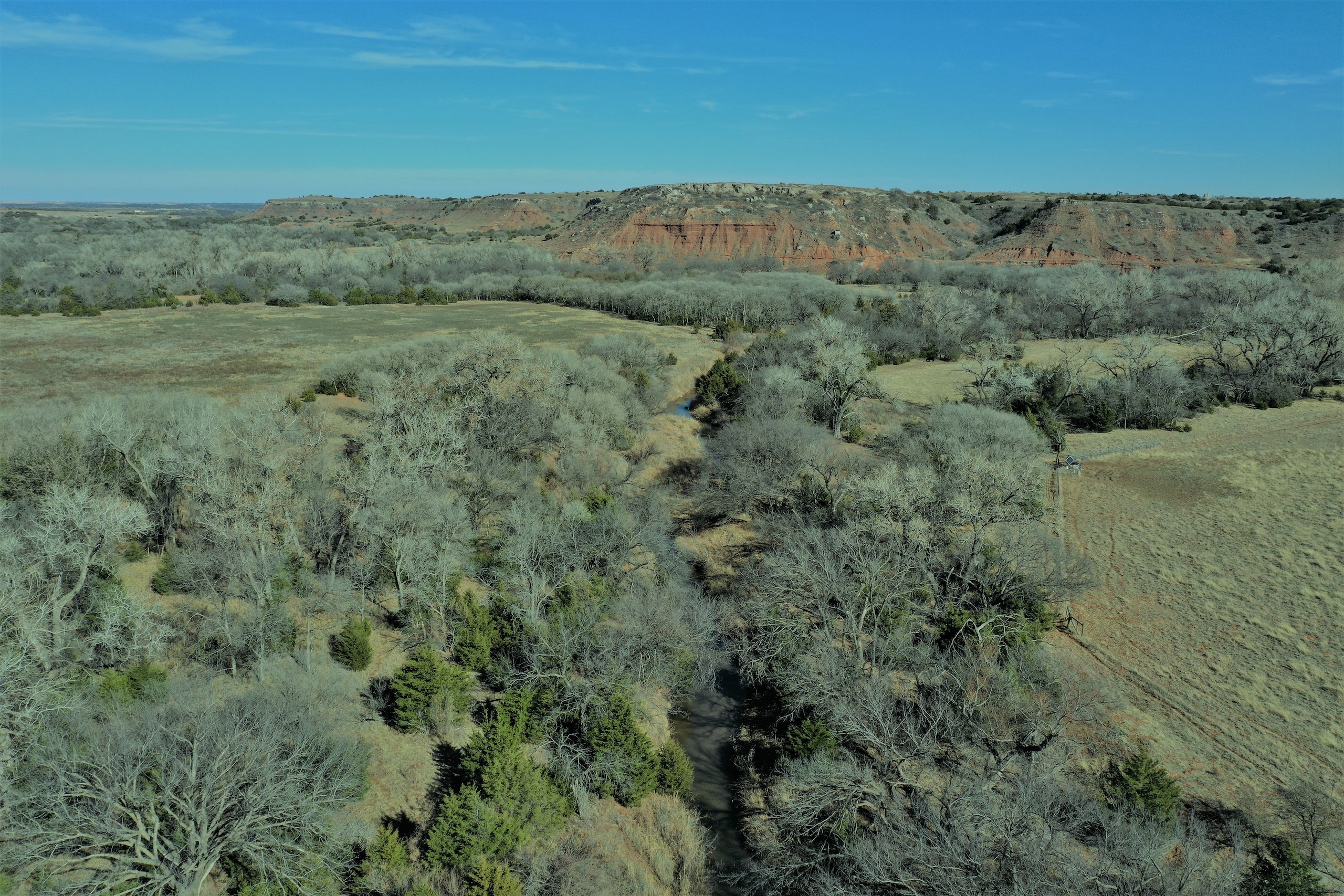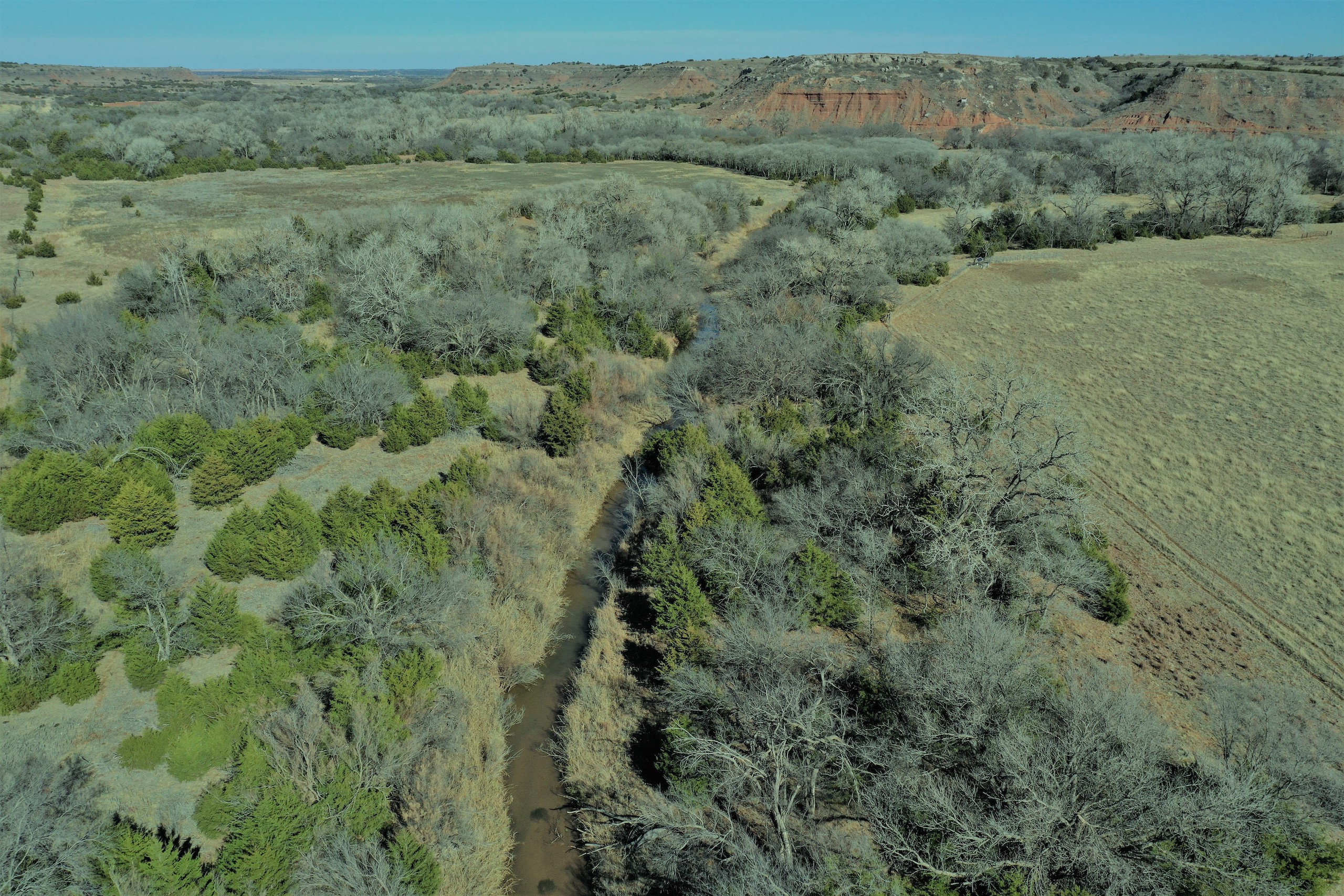 The Property itself is loaded with cover and trees, with meandering meadow openings along its banks for over a mile. You’ll be hard-pressed to find a more beautiful and ascetically-pleasing property. Main Creek is one of the few Live creeks that feed the Cimarron River in Northwest Oklahoma. As the creek meanders its way through the wide canyon, it is fed by several finger draws and drainages. The bottom is overlooked by impressive Cap-Rock outcroppings reaching 150ft. above the bottom. The creek supports beautiful and healthy hardwoods, these included century-old Cottonwoods, Chinaberry, Hackberry, Elms, Locusts, and Oaks. The Creek has a constant flow of clear spring water from up above. Plus, it has numerous pools of water in various spots as it makes its way through the property.