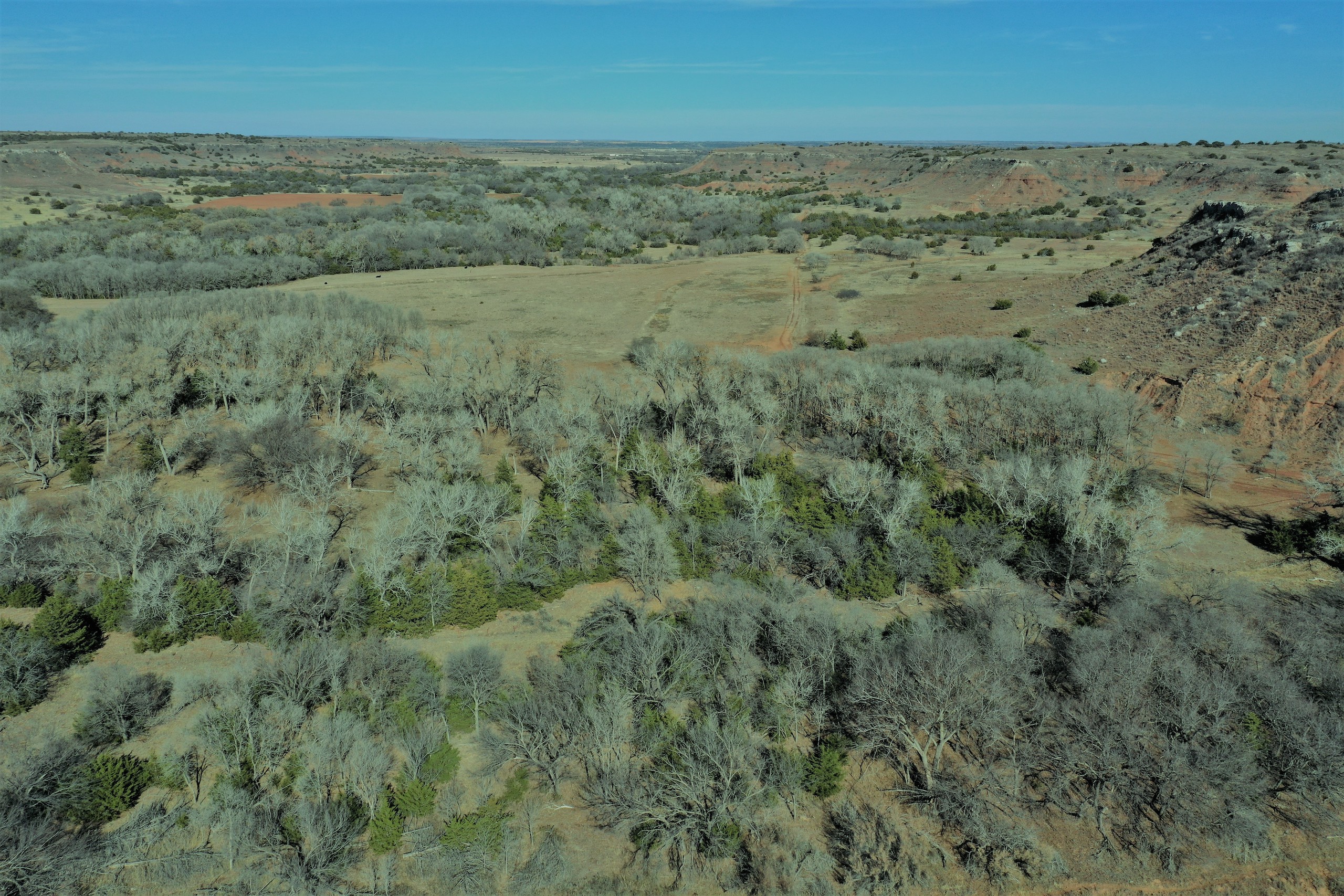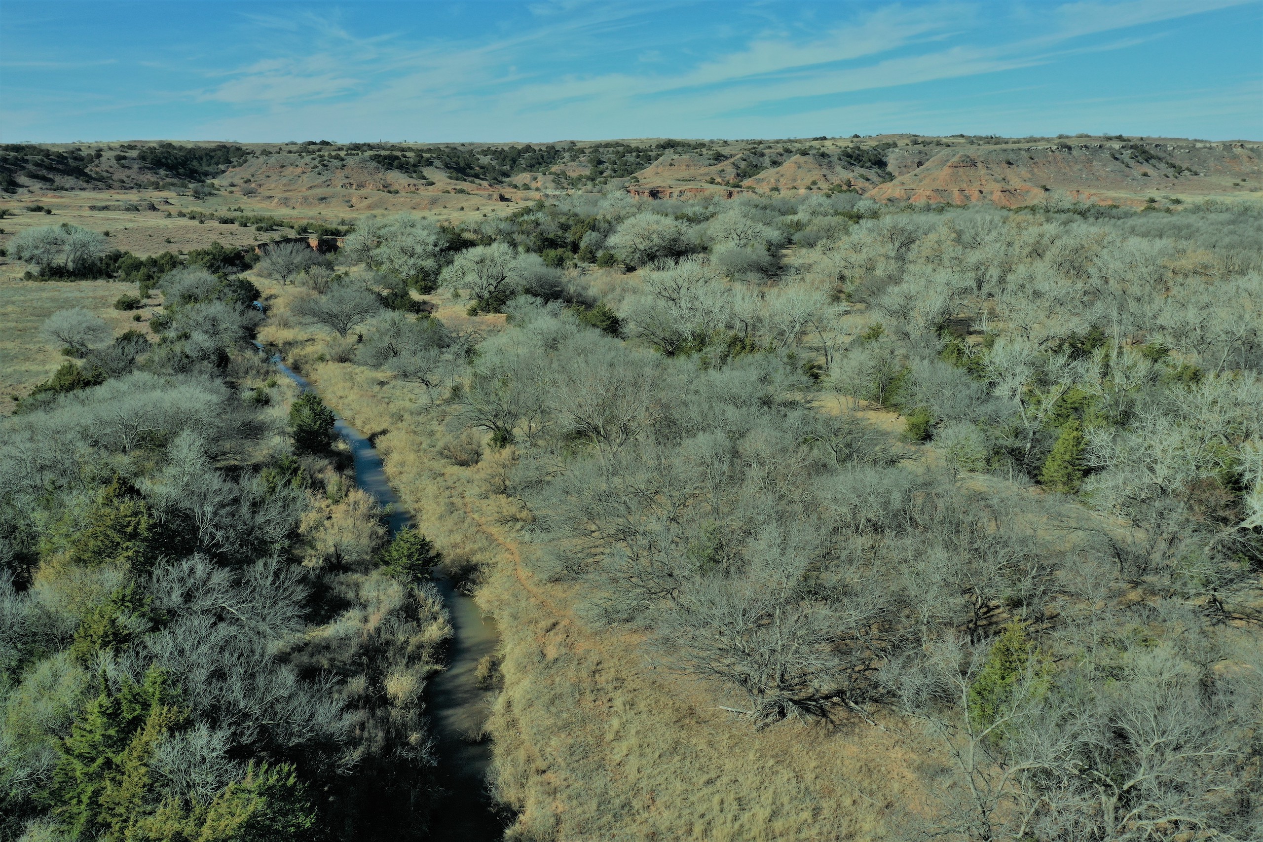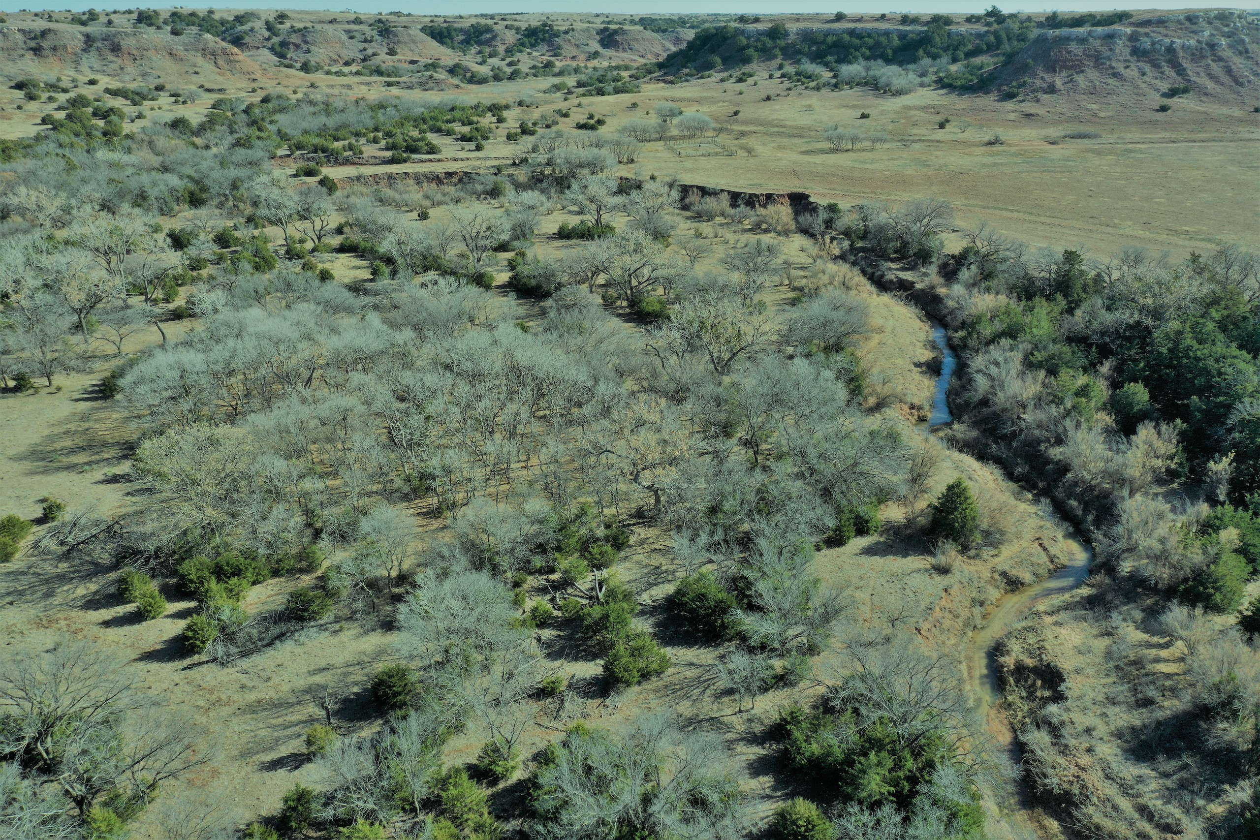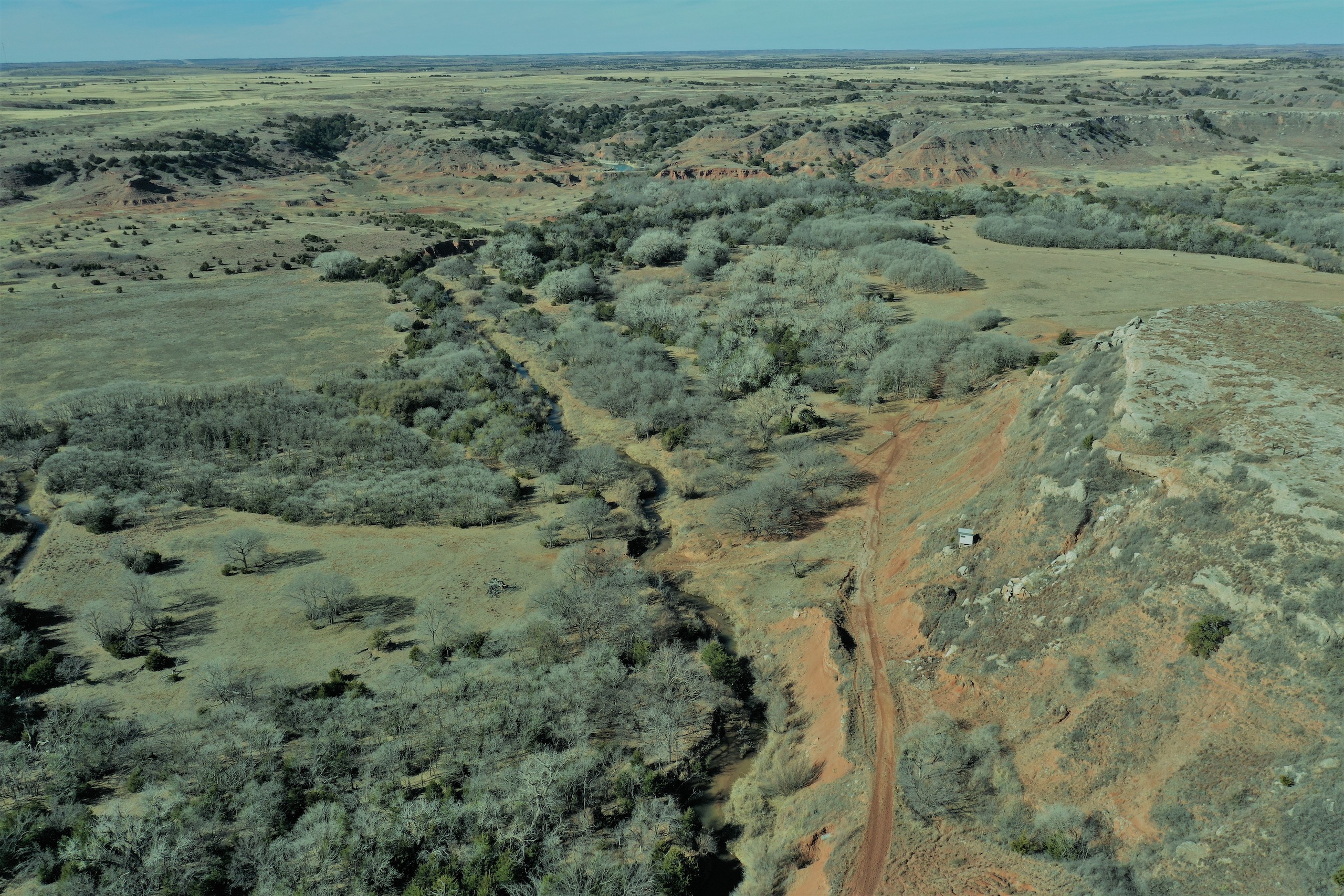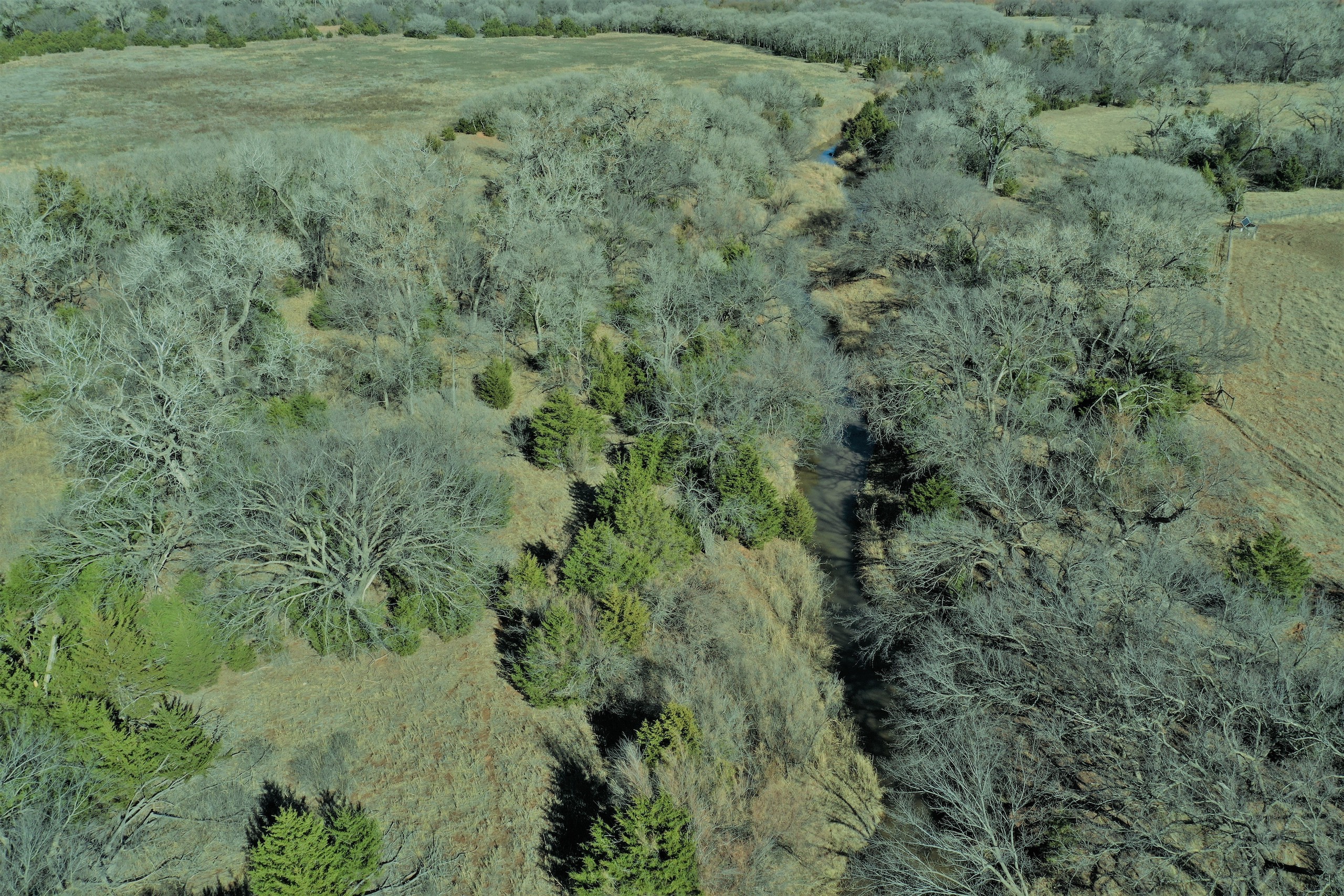 The Property itself is loaded with cover and trees, with meandering meadow openings along its banks for over a mile. You’ll be hard-pressed to find a more beautiful and ascetically-pleasing property. Main Creek is one of the few Live creeks that feed the Cimarron River in Northwest Oklahoma. As the creek meanders its way through the wide canyon, it is fed by several finger draws and drainages. The bottom is overlooked by impressive Cap-Rock outcroppings reaching 150ft. above the bottom. The creek supports beautiful and healthy hardwoods, these included century-old Cottonwoods, Chinaberry, Hackberry, Elms, Locusts, and Oaks. The Creek has a constant flow of clear spring water from up above. Plus, it has numerous pools of water in various spots as it makes its way through the property.