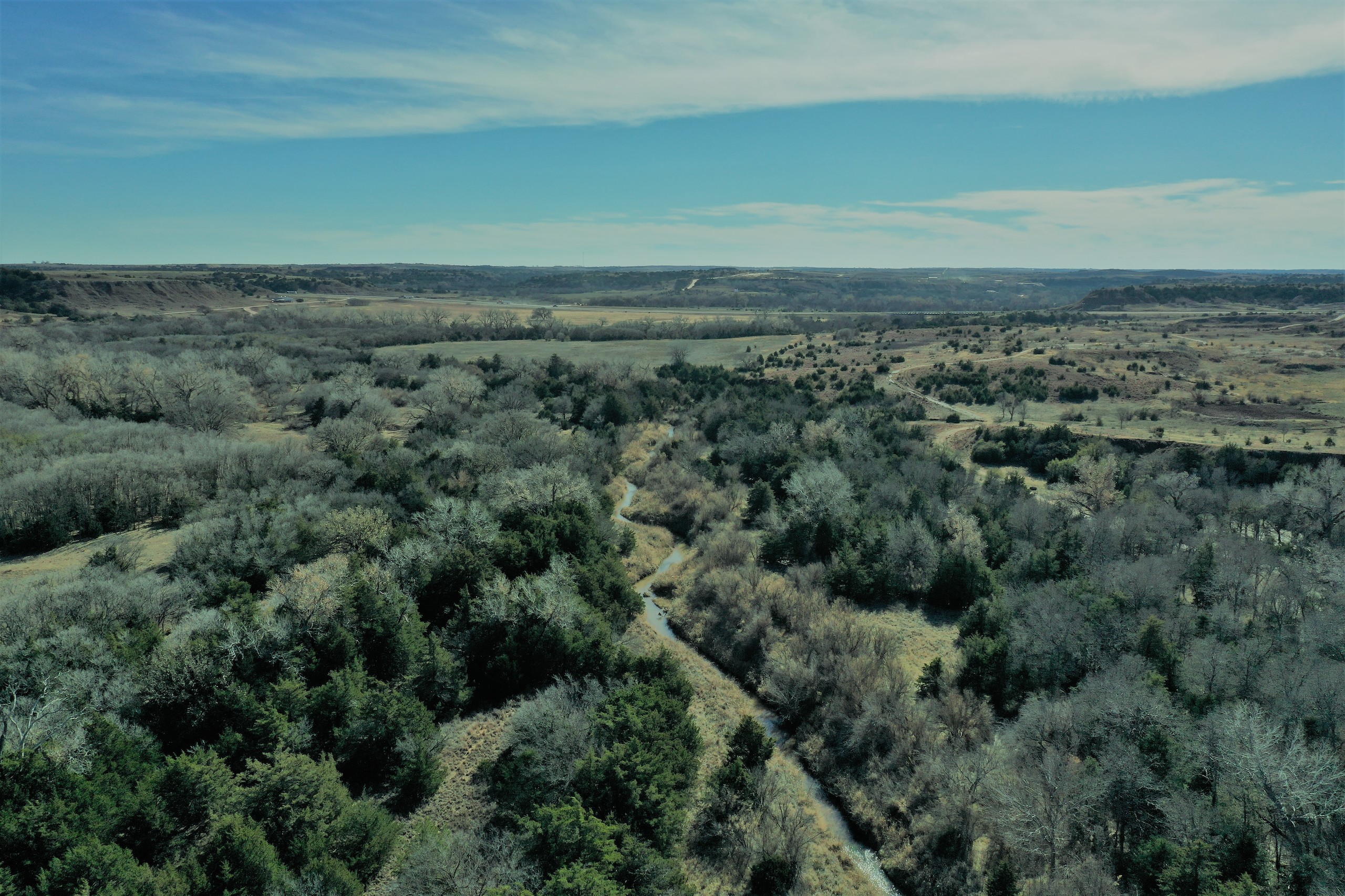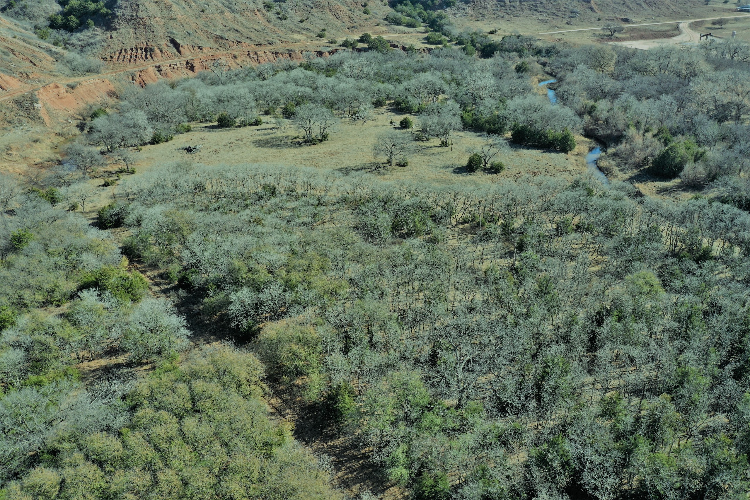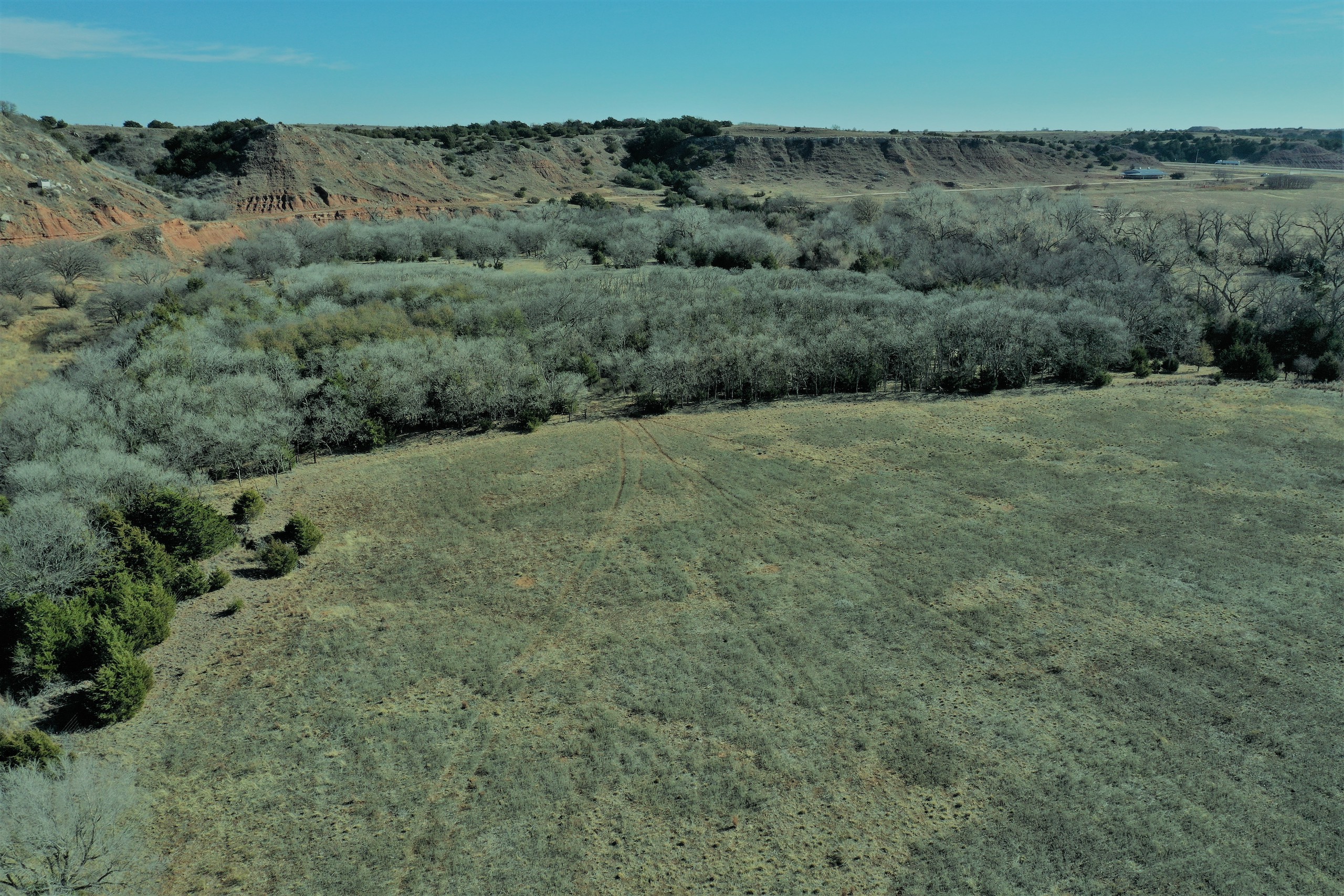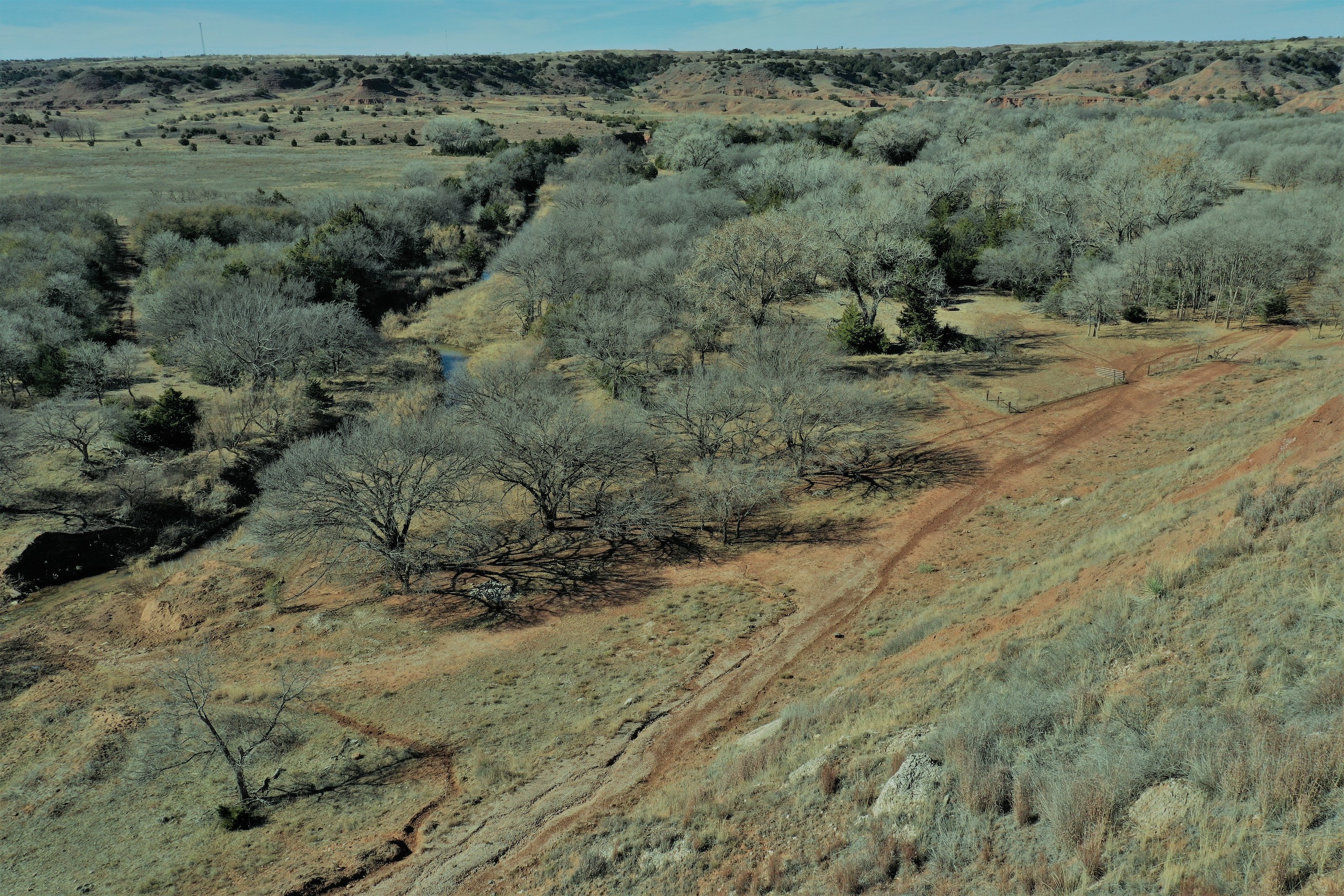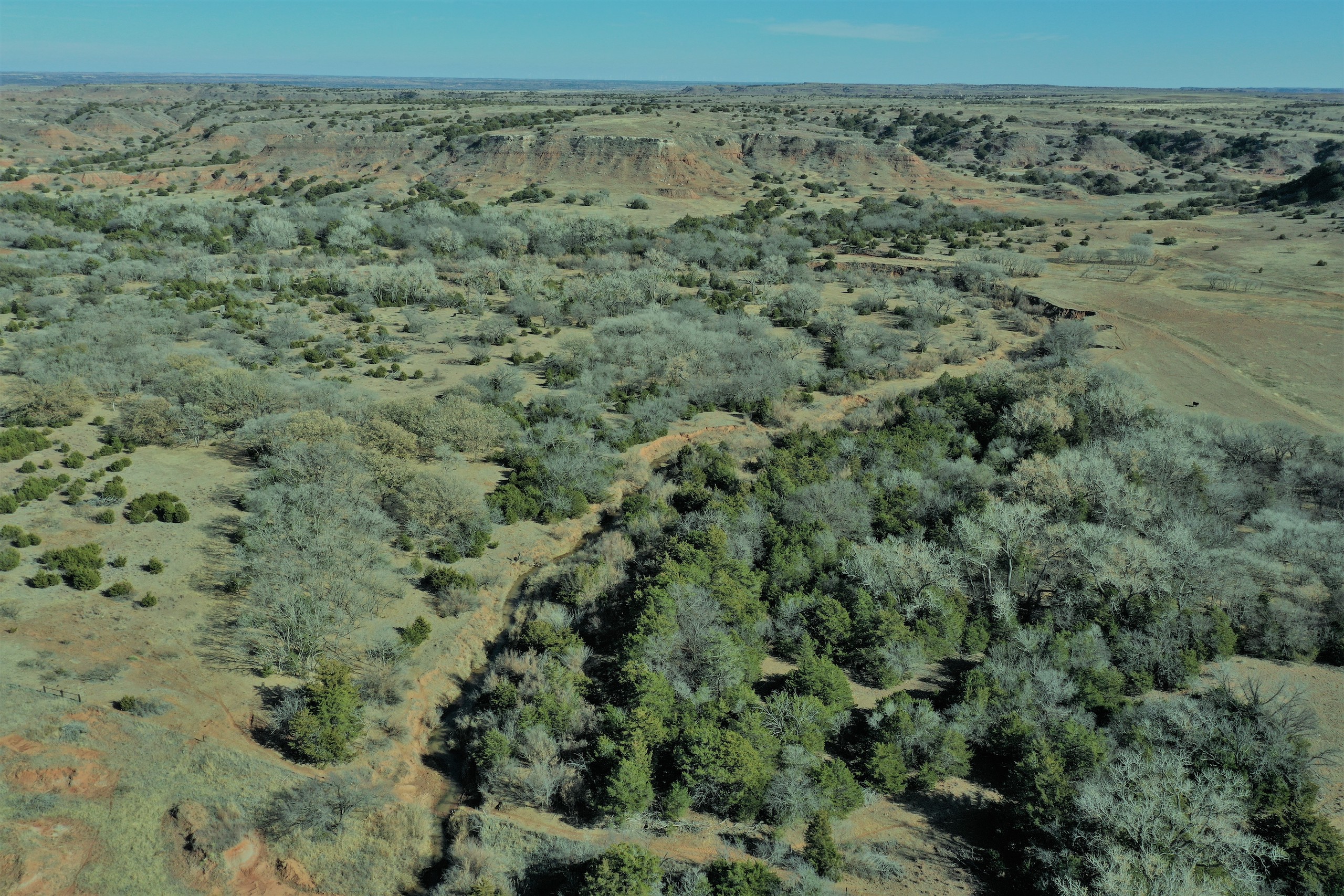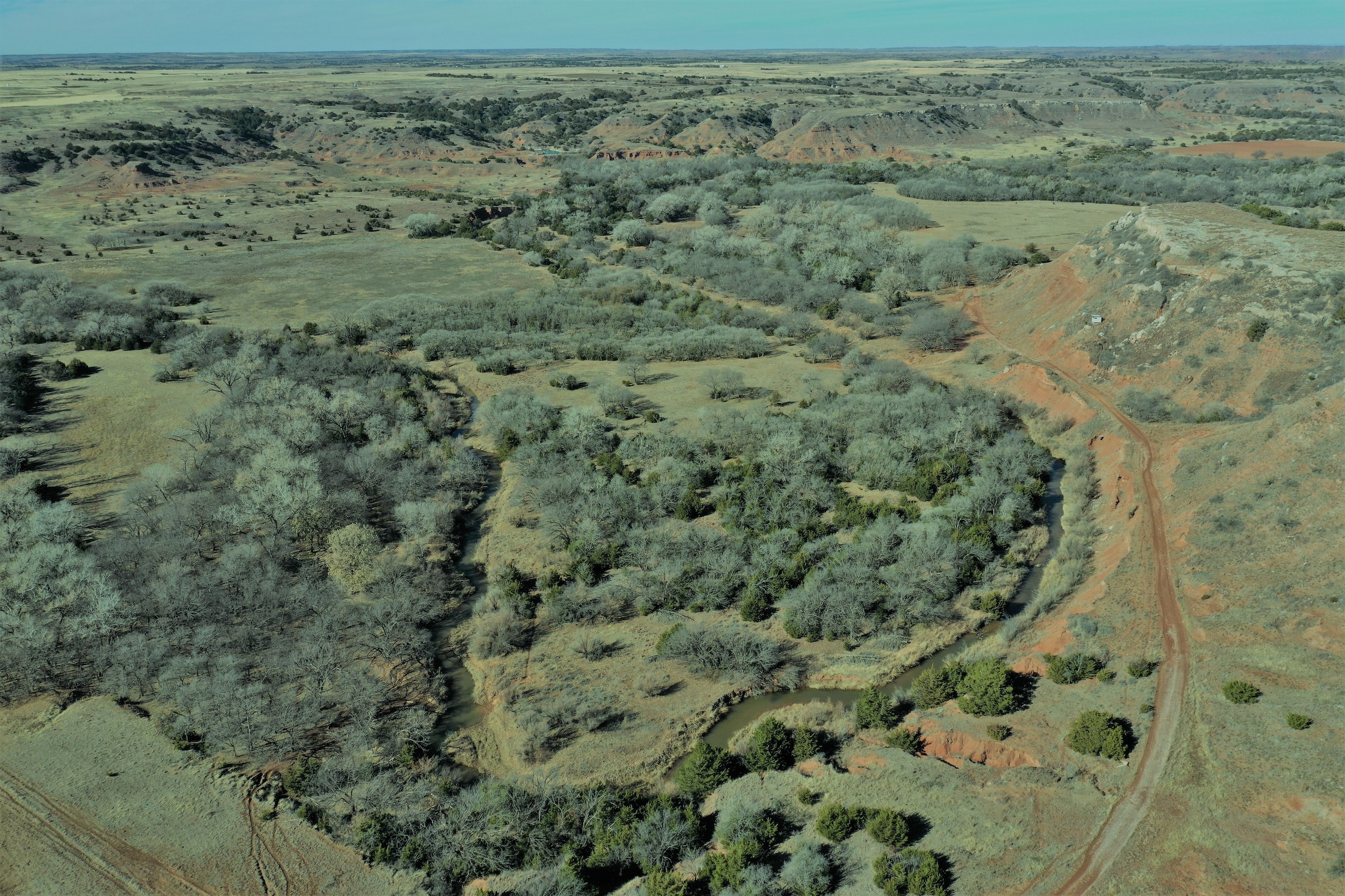The Property itself is loaded with cover and trees, with meandering meadow openings along its banks for over a mile. You’ll be hard-pressed to find a more beautiful and ascetically-pleasing property. Main Creek is one of the few Live creeks that feed the Cimarron River in Northwest Oklahoma. As the creek meanders its way through the wide canyon, it is fed by several finger draws and drainages. The bottom is overlooked by impressive Cap-Rock outcroppings reaching 150ft. above the bottom. The creek supports beautiful and healthy hardwoods, these included century-old Cottonwoods, Chinaberry, Hackberry, Elms, Locusts, and Oaks. The Creek has a constant flow of clear spring water from up above. Plus, it has numerous pools of water in various spots as it makes its way through the property.