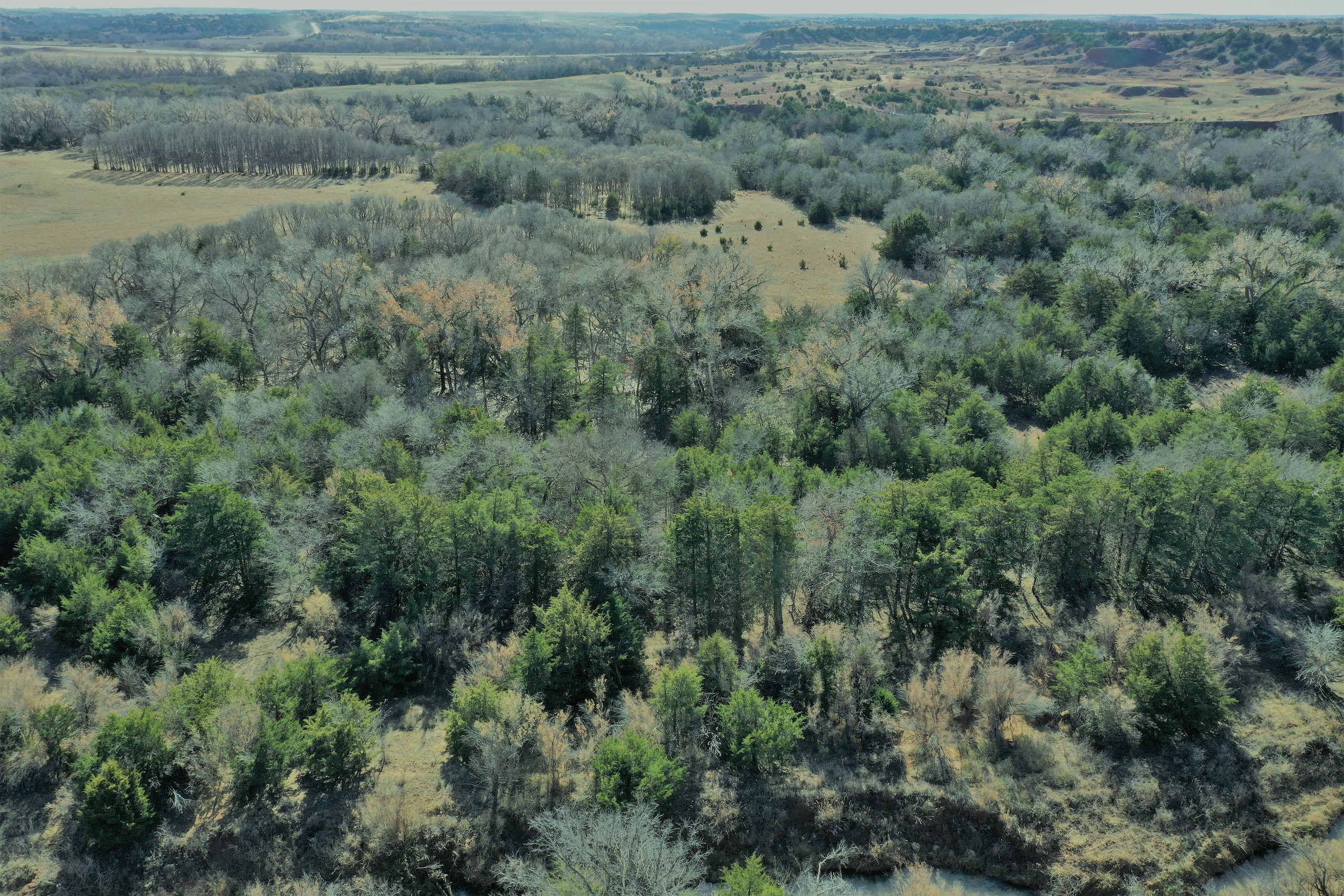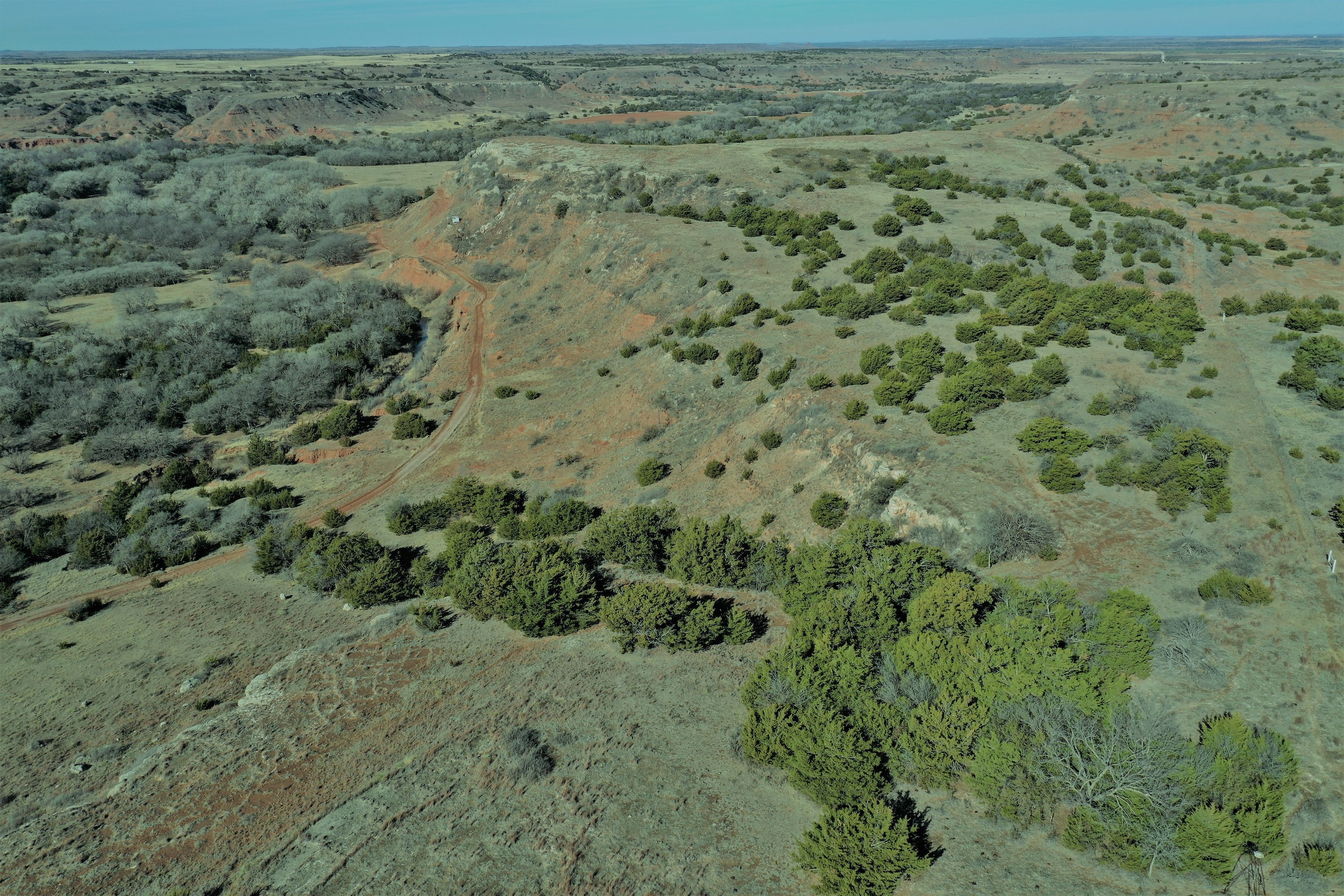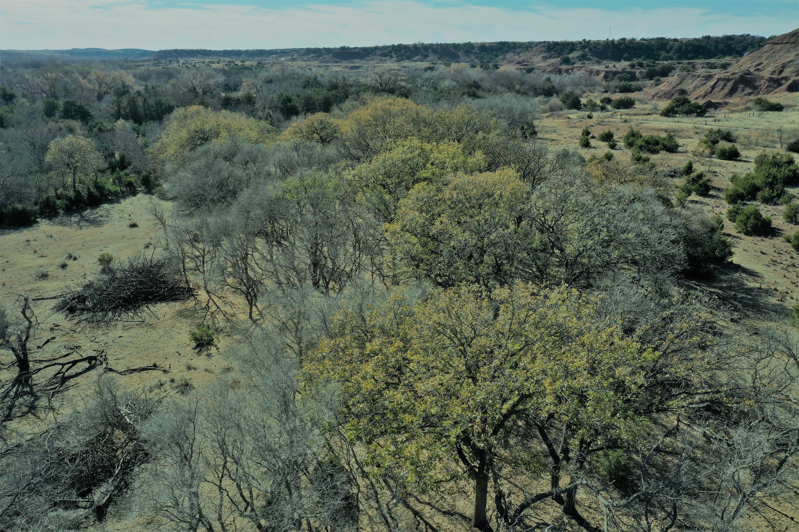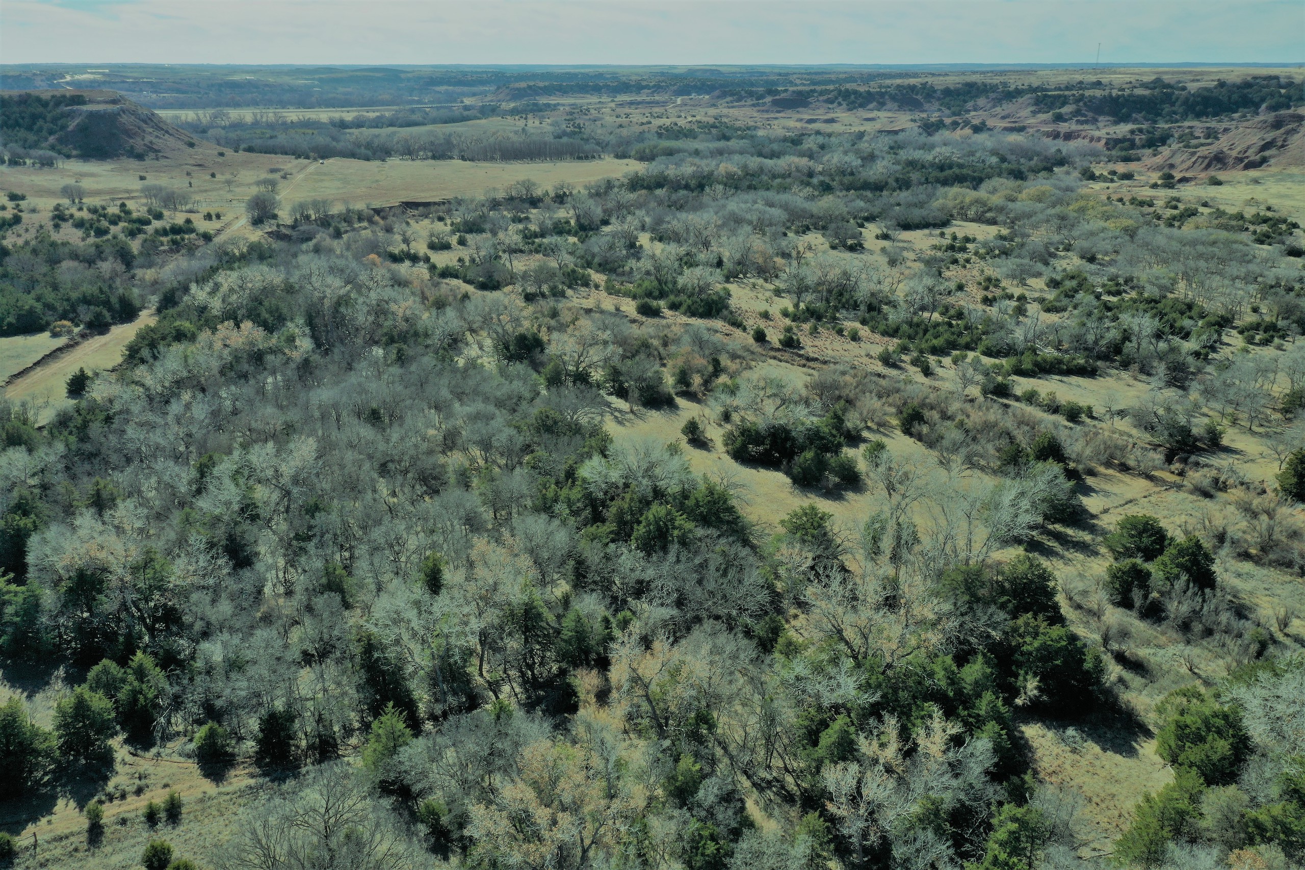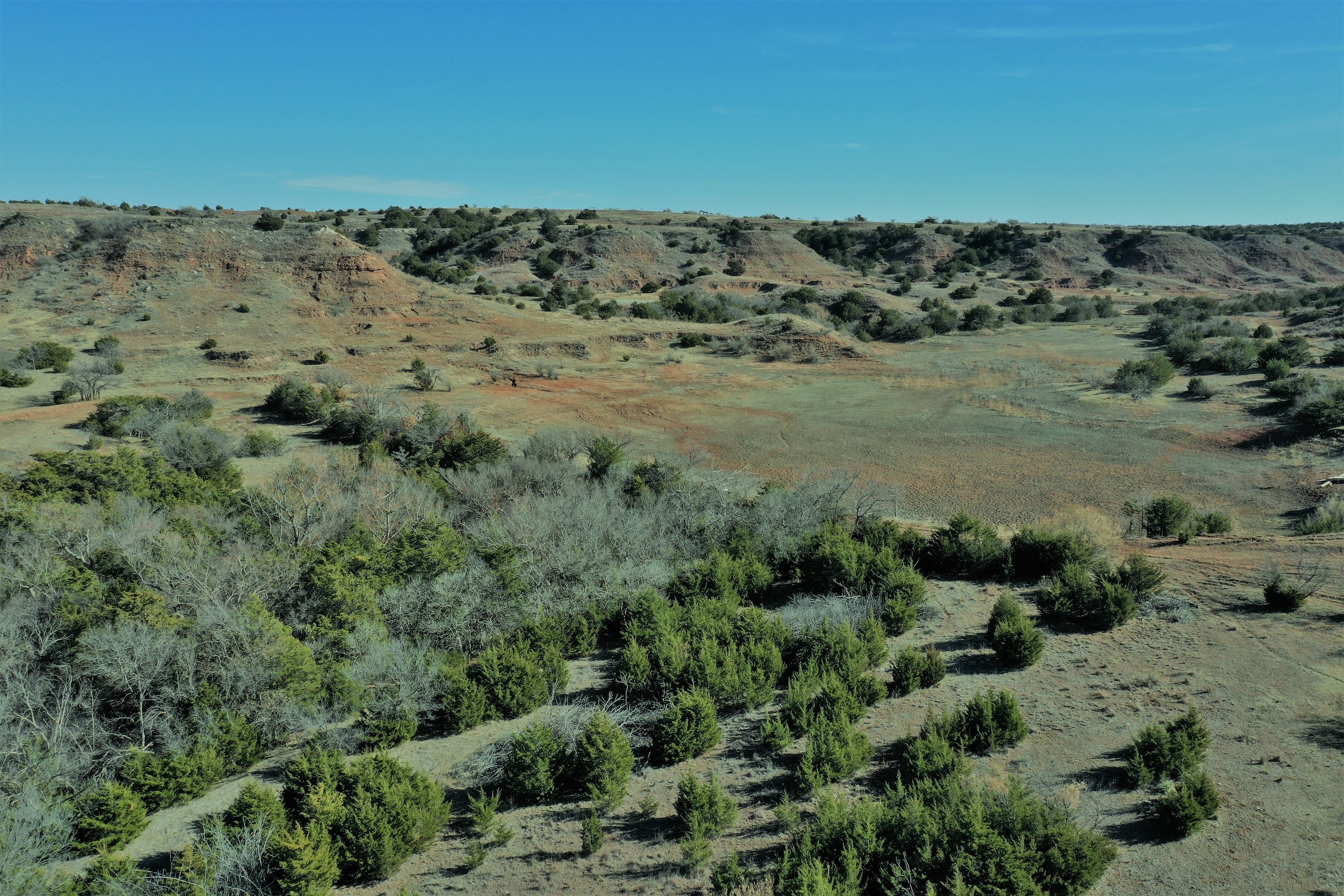 The Property itself is loaded with cover and trees, with meandering meadow openings along its banks for over a mile. You’ll be hard-pressed to find a more beautiful and ascetically-pleasing property. Main Creek is one of the few Live creeks that feed the Cimarron River in Northwest Oklahoma. As the creek meanders its way through the wide canyon, it is fed by several finger draws and drainages. The bottom is overlooked by impressive Cap-Rock outcroppings reaching 150ft. above the bottom. The creek supports beautiful and healthy hardwoods, these included century-old Cottonwoods, Chinaberry, Hackberry, Elms, Locusts, and Oaks. The Creek has a constant flow of clear spring water from up above. Plus, it has numerous pools of water in various spots as it makes its way through the property.