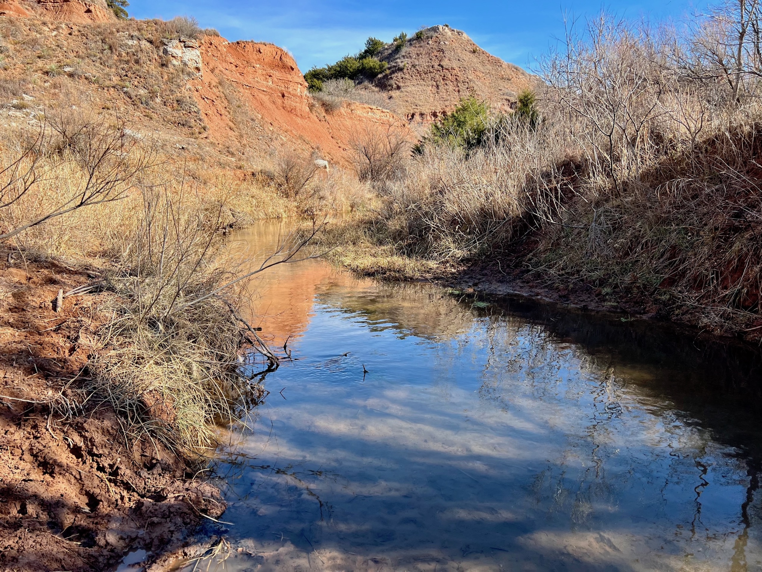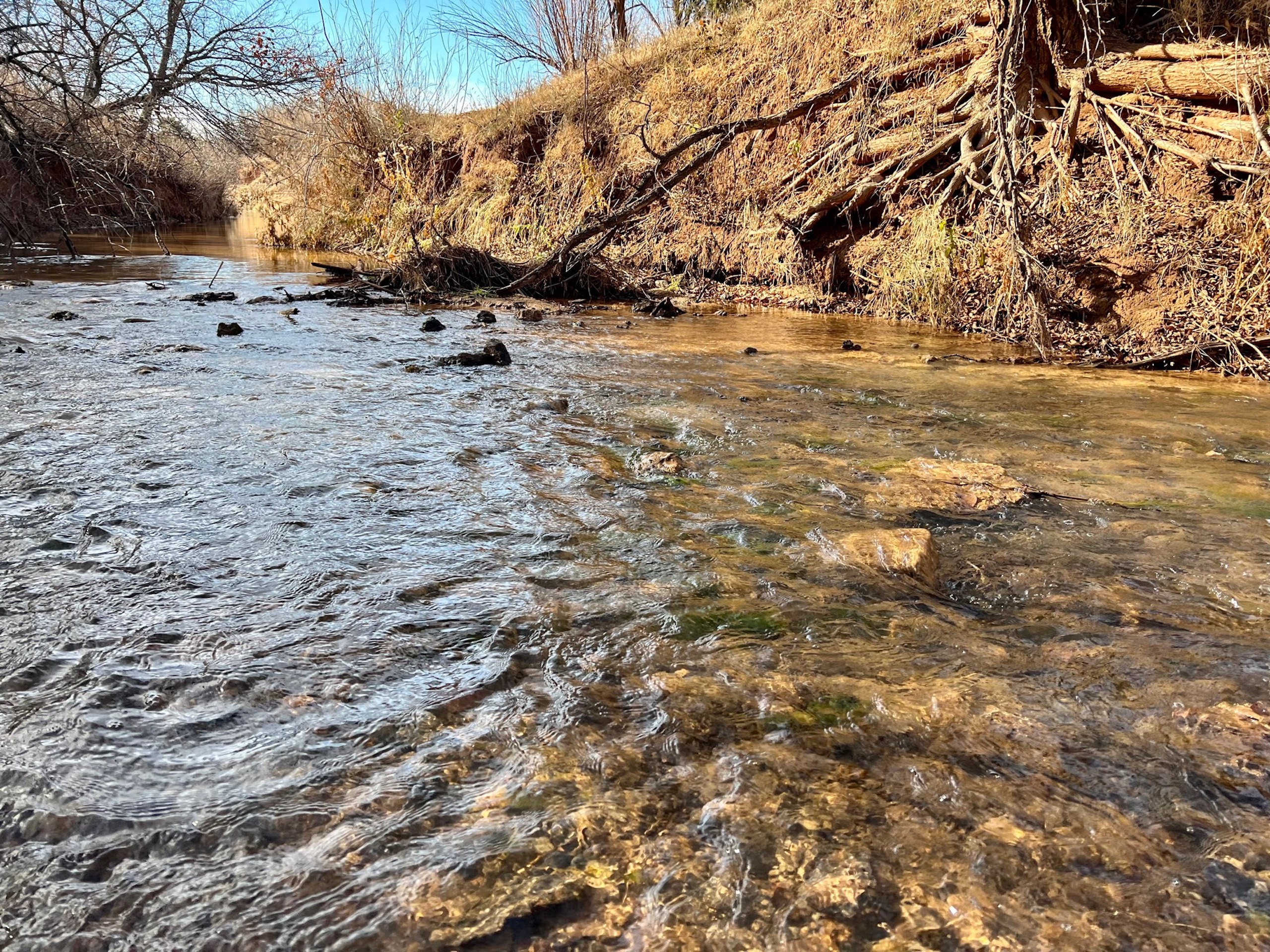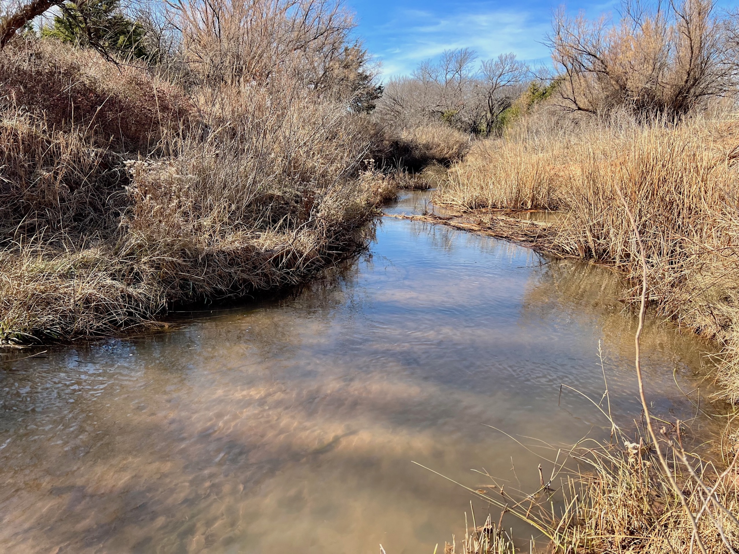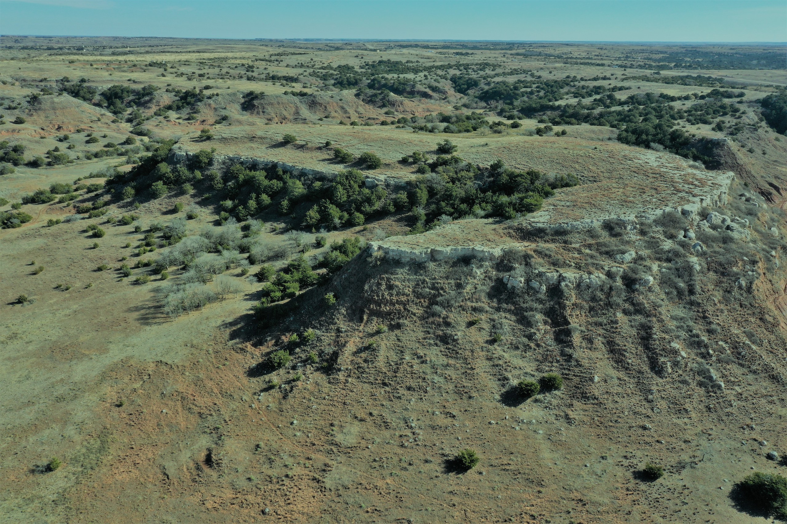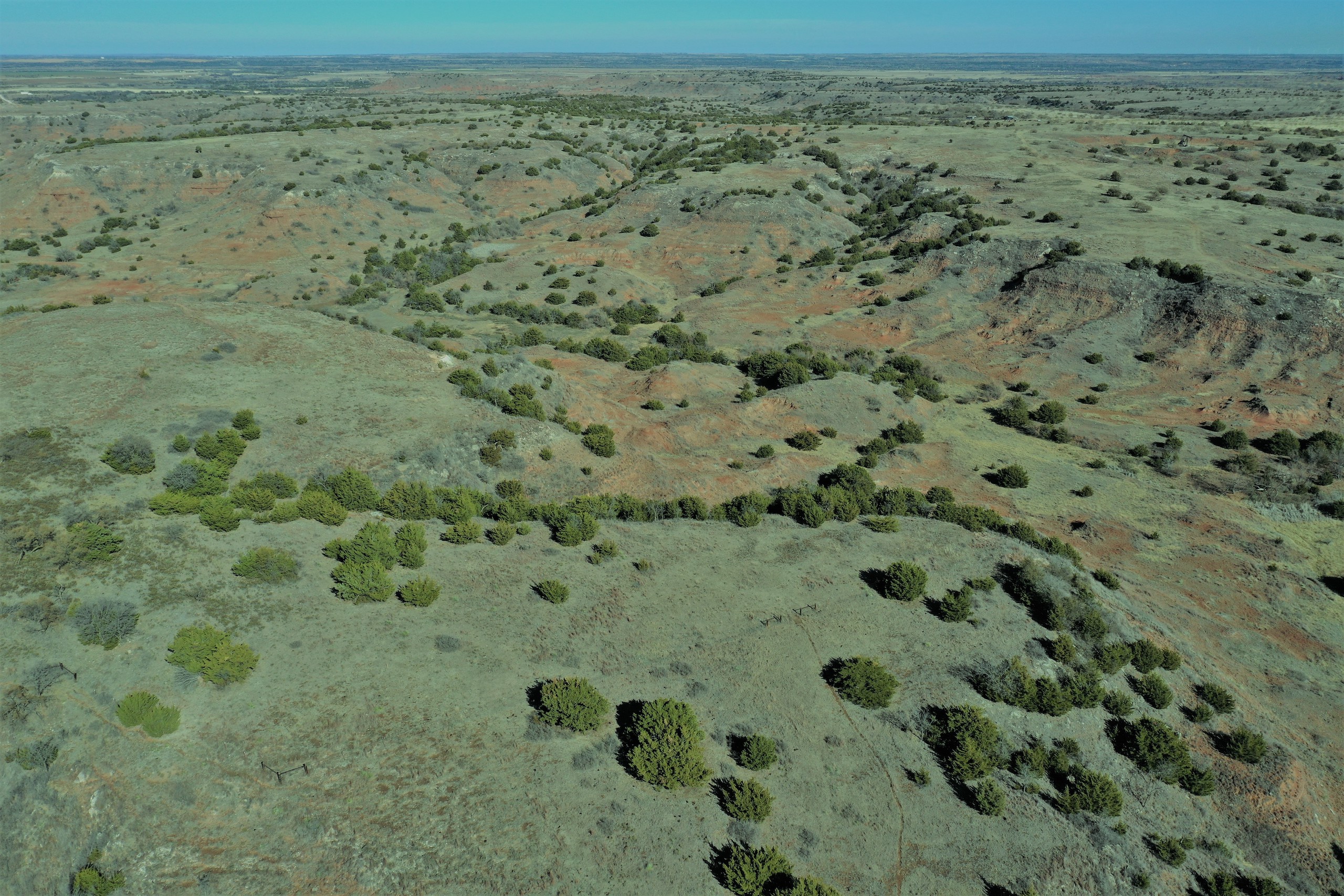 The Property itself is loaded with cover and trees, with meandering meadow openings along its banks for over a mile. You’ll be hard-pressed to find a more beautiful and ascetically-pleasing property. Main Creek is one of the few Live creeks that feed the Cimarron River in Northwest Oklahoma. As the creek meanders its way through the wide canyon, it is fed by several finger draws and drainages. The bottom is overlooked by impressive Cap-Rock outcroppings reaching 150ft. above the bottom. The creek supports beautiful and healthy hardwoods, these included century-old Cottonwoods, Chinaberry, Hackberry, Elms, Locusts, and Oaks. The Creek has a constant flow of clear spring water from up above. Plus, it has numerous pools of water in various spots as it makes its way through the property.