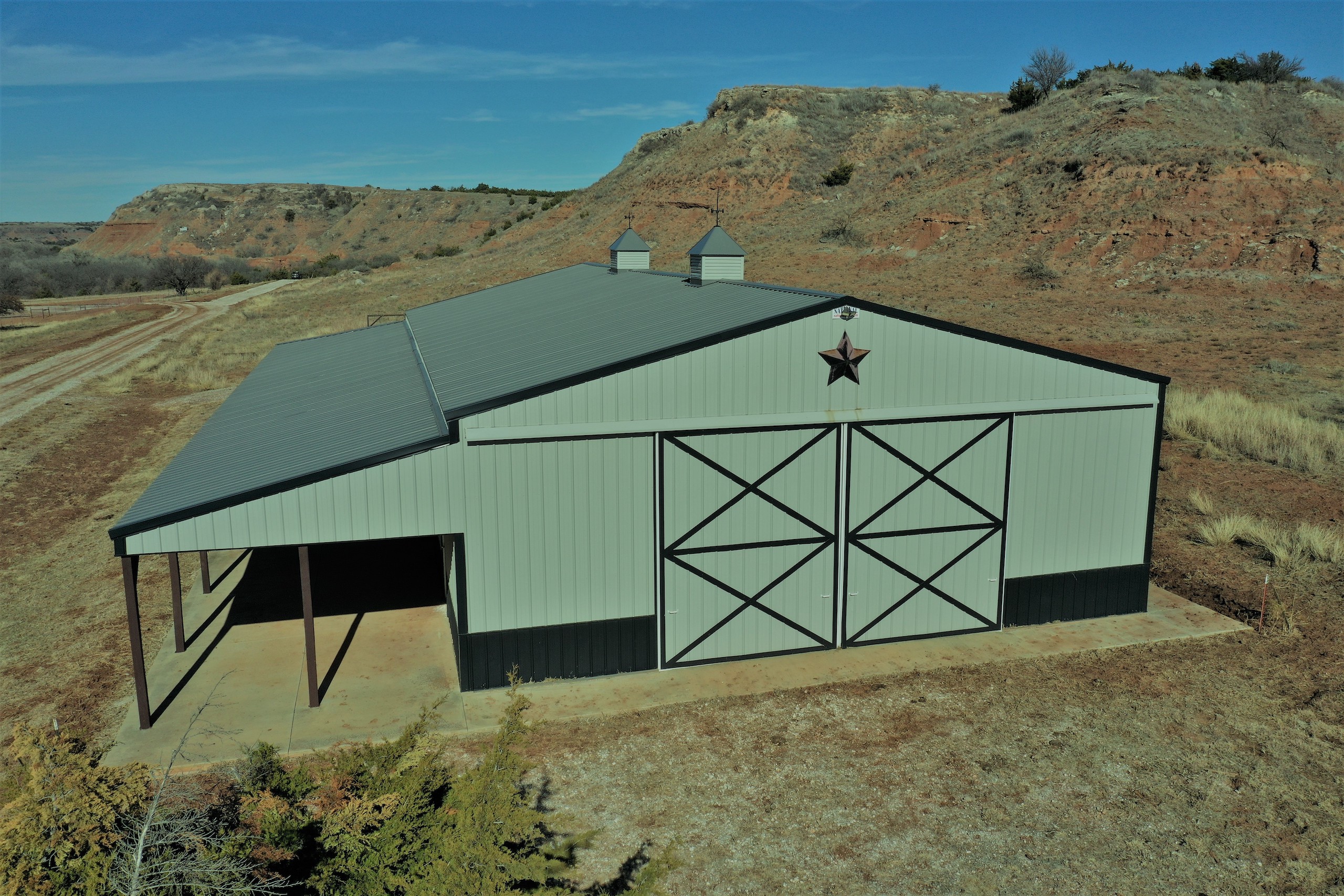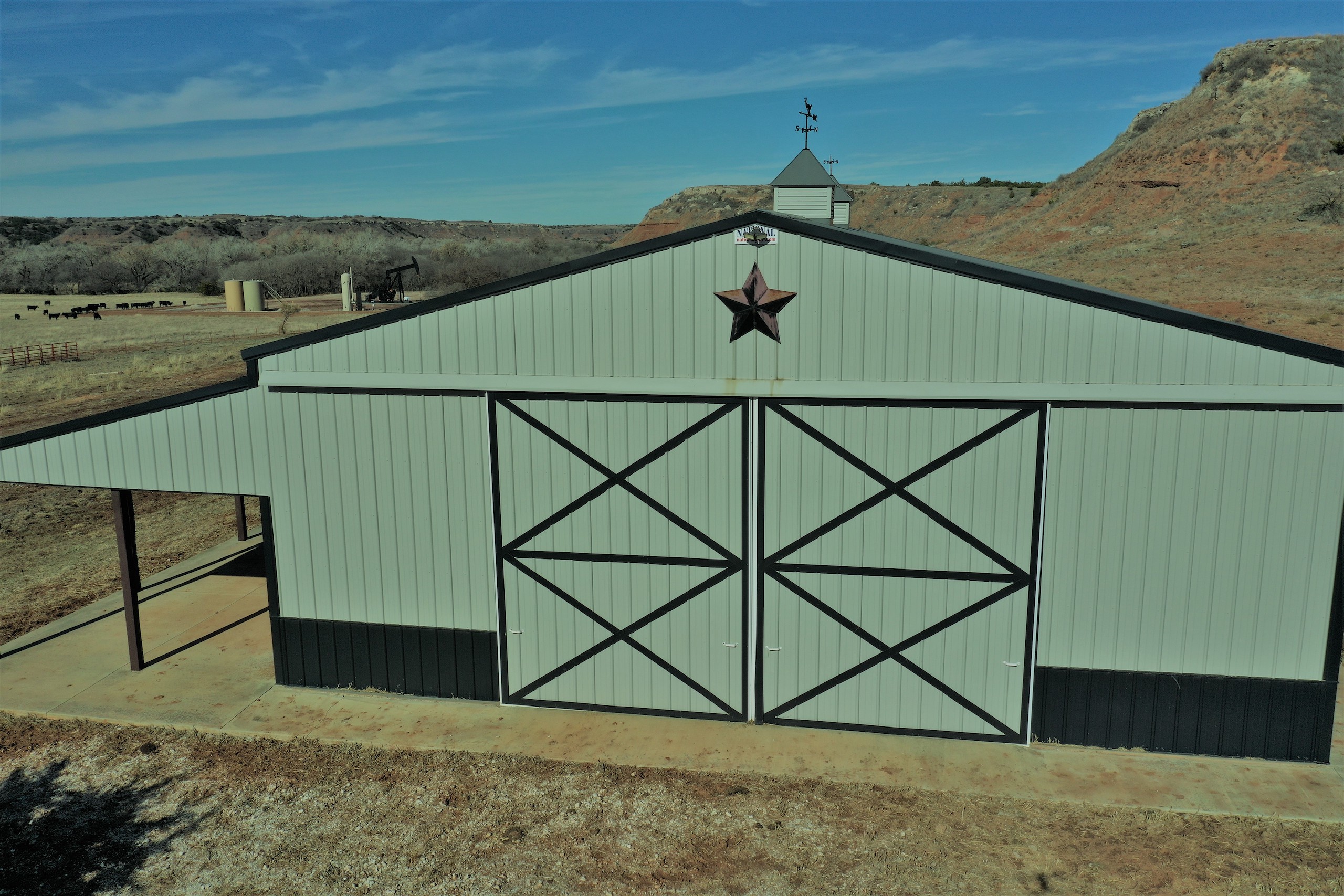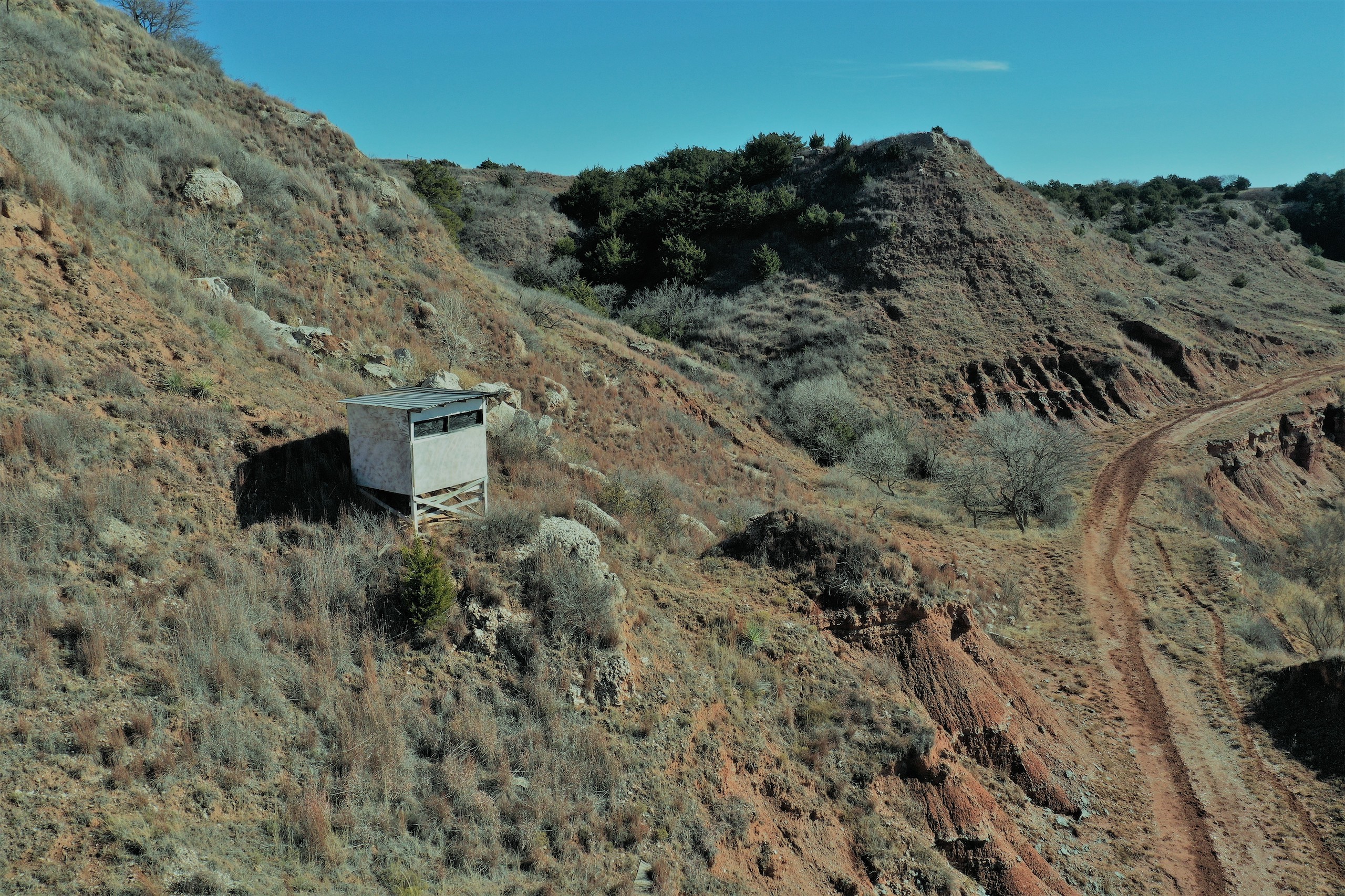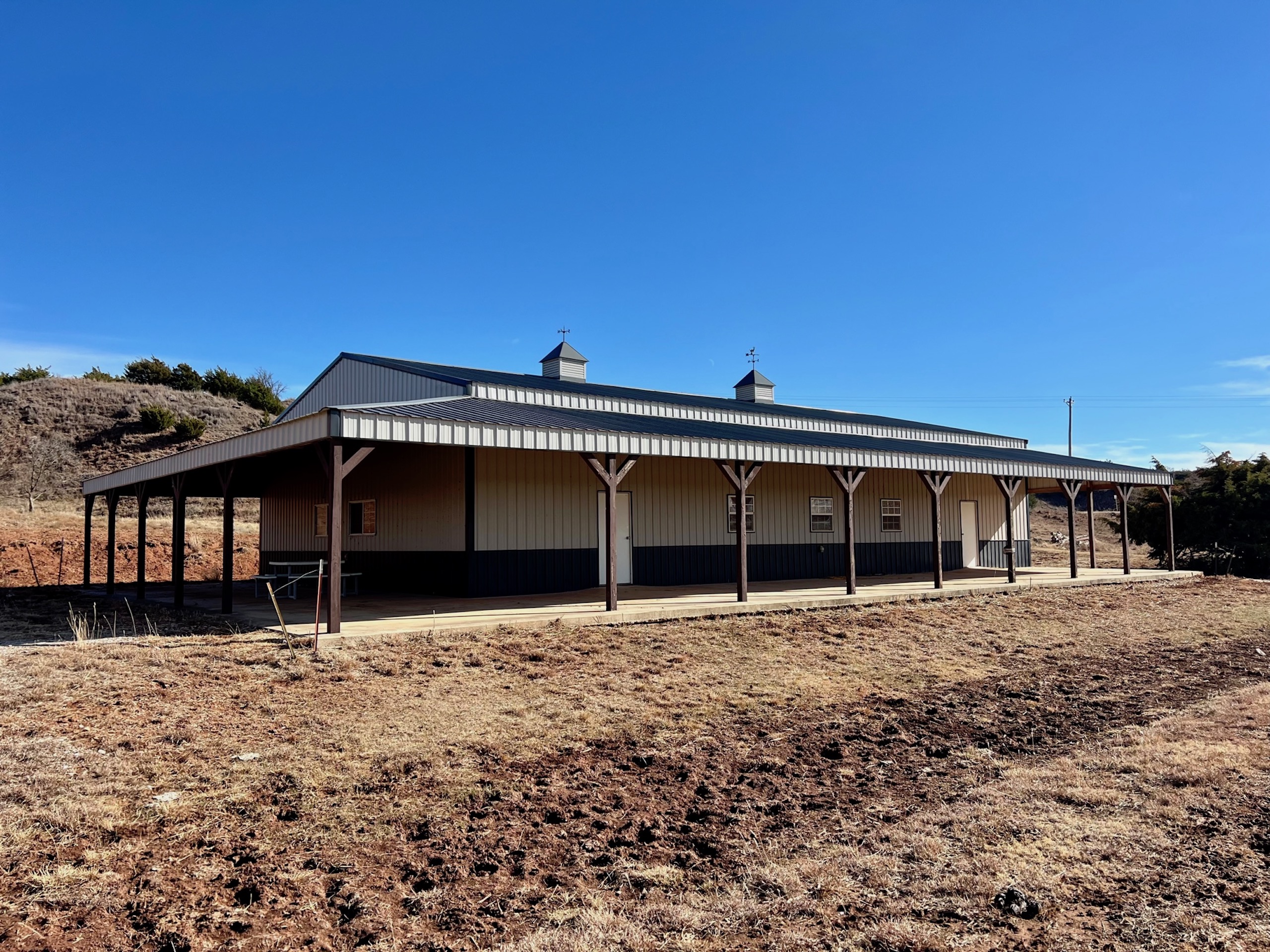 Although the property is ready to hunt, there are some improvements a buyer could make that would greatly improve the hunting. There are three fields currently in grass. If those were planted to alfalfa, wheat, and/or milo, the deer and turkey numbers could easily triple. Deer in this area will travel for many miles to food sources. The Barndo still needs some additional water and electric work, but the structure is there and it’s well-built.