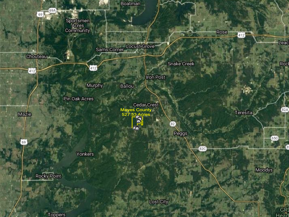 PRICE REDUCED! Welcome to the scenic rolling hills east of Ft. Gibson Lake, just south of Locust Grove. This property is located on a paved road with electricity and water with 5 RV hookups and a 30x30 barn. There are over 8 miles of roads cleared throughout the property offering great access. There are multiple creeks that provide plenty of water along with one pond. There are good numbers of deer, turkey, hogs and small game. The property is loaded with huge old-growth hardwoods and the scattered pine add a nice touch. This property is located just 10 miles south of 412 just an hour's drive from Tulsa, OK. Give me a call and let's go for a ride around this beautiful ranch.