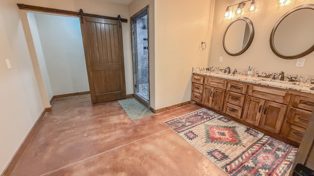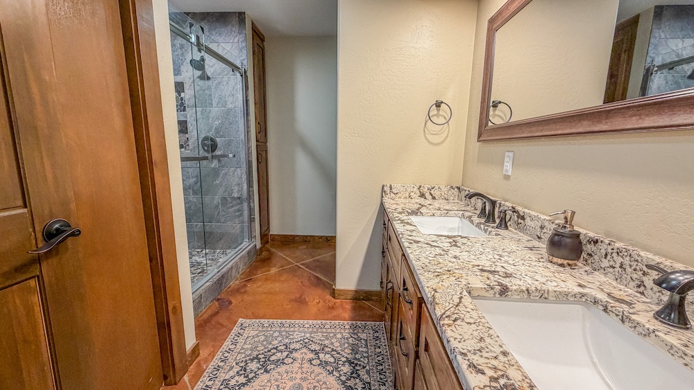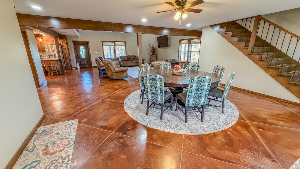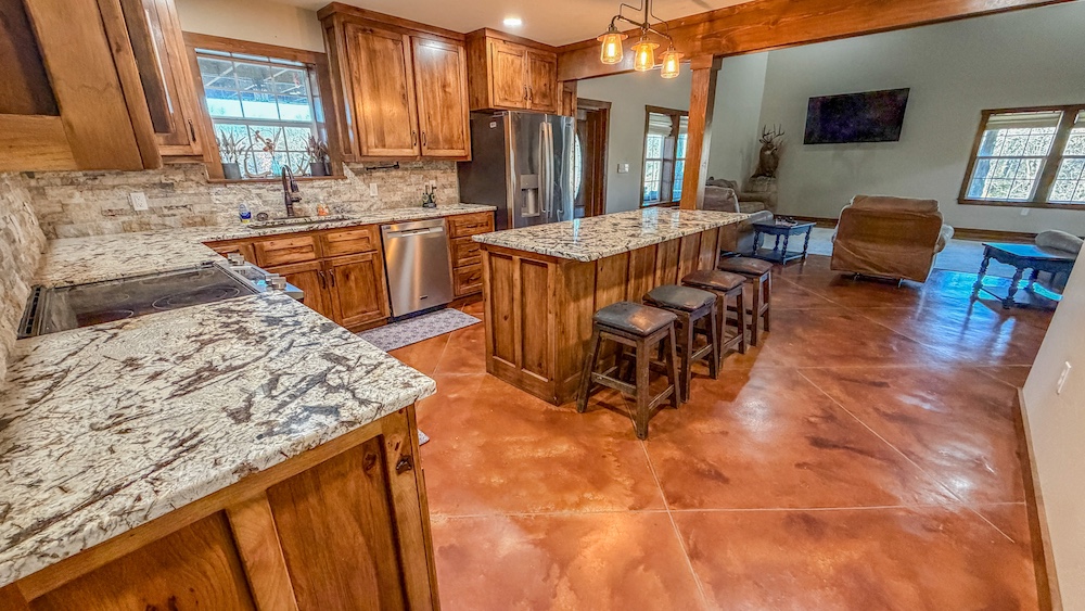 - Lodge includes custom finishes, stained concrete floors downstairs