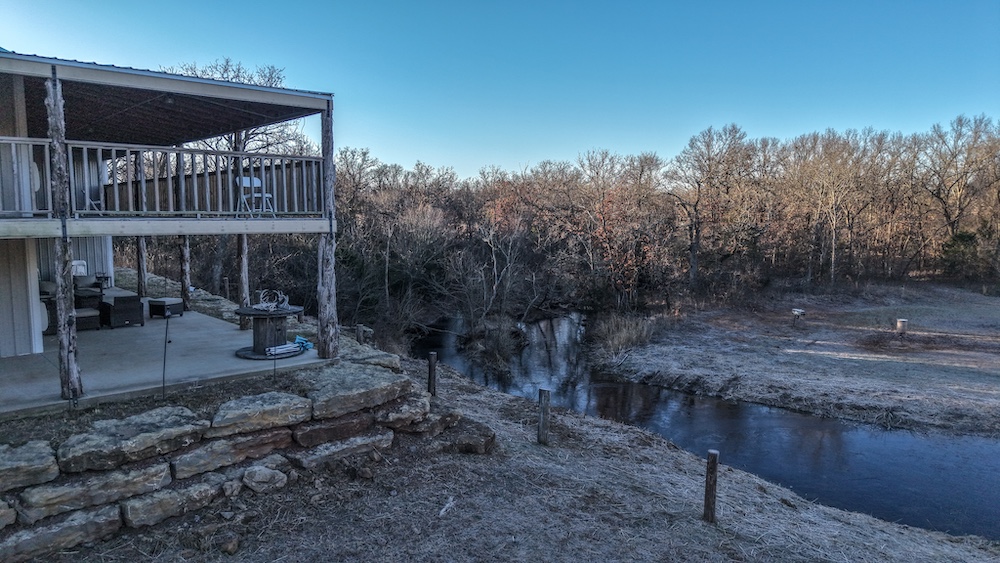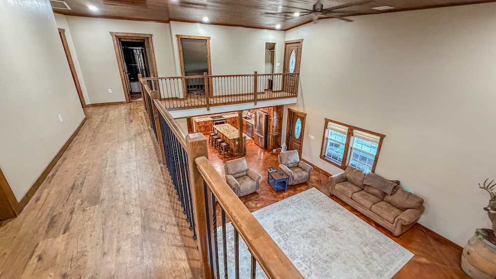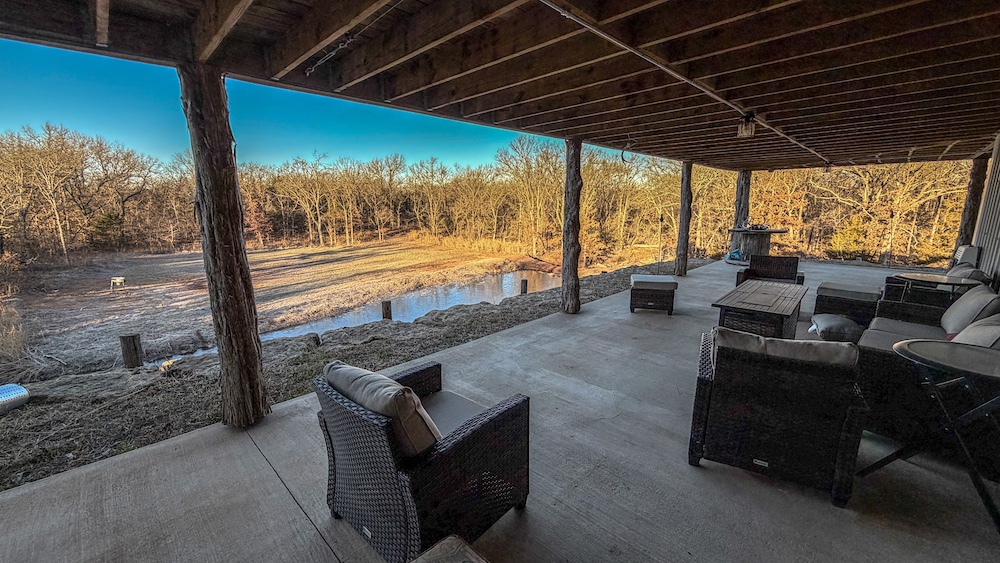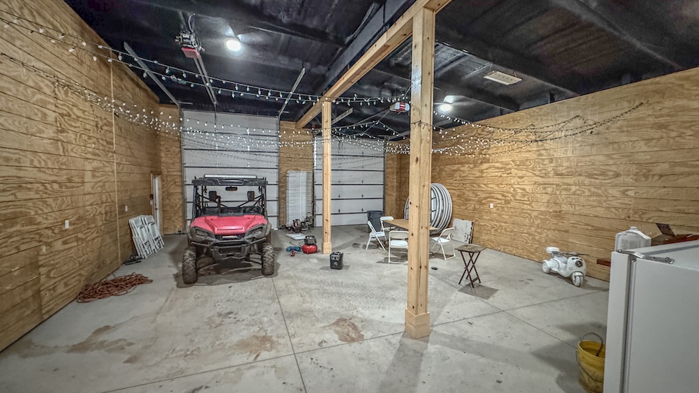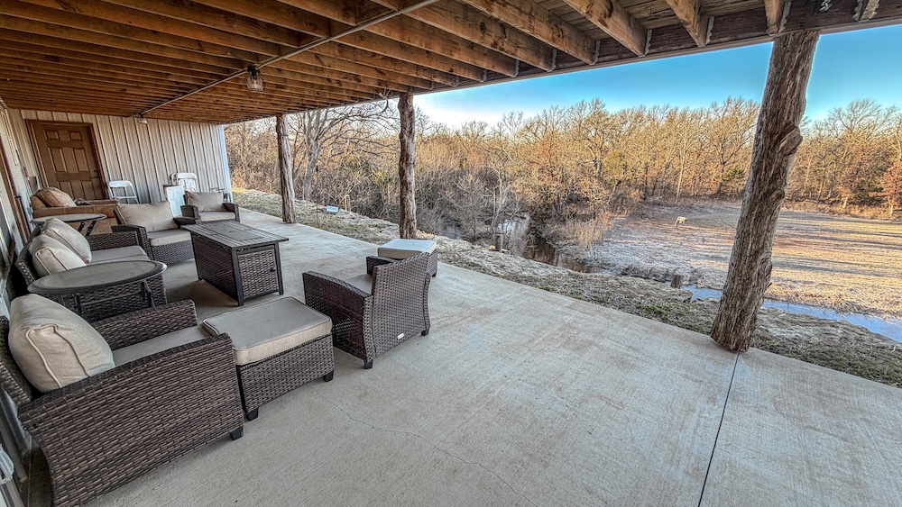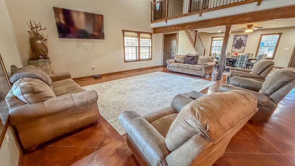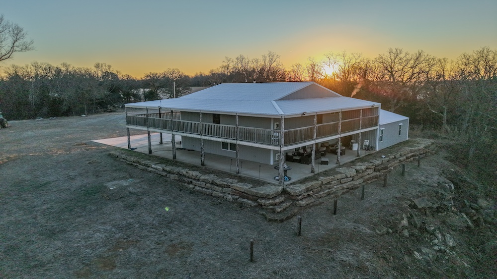 The lodge serves as a central feature of the property and offers approximately 5,000 square feet of finished living space. It includes five bedrooms and three full bathrooms and is currently configured to accommodate up to 20 guests. The interior features custom finishes and stained concrete floors on the lower level, along with a large, open living area designed for group gatherings and shared use. A spacious wraparound porch extends the living space outdoors, both upstairs and downstairs, and offers views of the surrounding landscape. A live creek behind the lodge provides a serene setting while also overlooking a strategically placed food plot/feeder location, allowing you to watch the local deer, turkey, and hogs right from your back porch. The building also includes ample shop space, enabling equipment storage, maintenance, and operational efficiency. The home is also connected to a Generac generator, assuring you have access to electricity even during the stormy spring months. An additional opportunity for the right buyer with this lodge is the potential to use and grow it as an Airbnb and/or corporate retreat. The property has also served as a beautiful setting for weddings and events, providing valuable memories for guests.