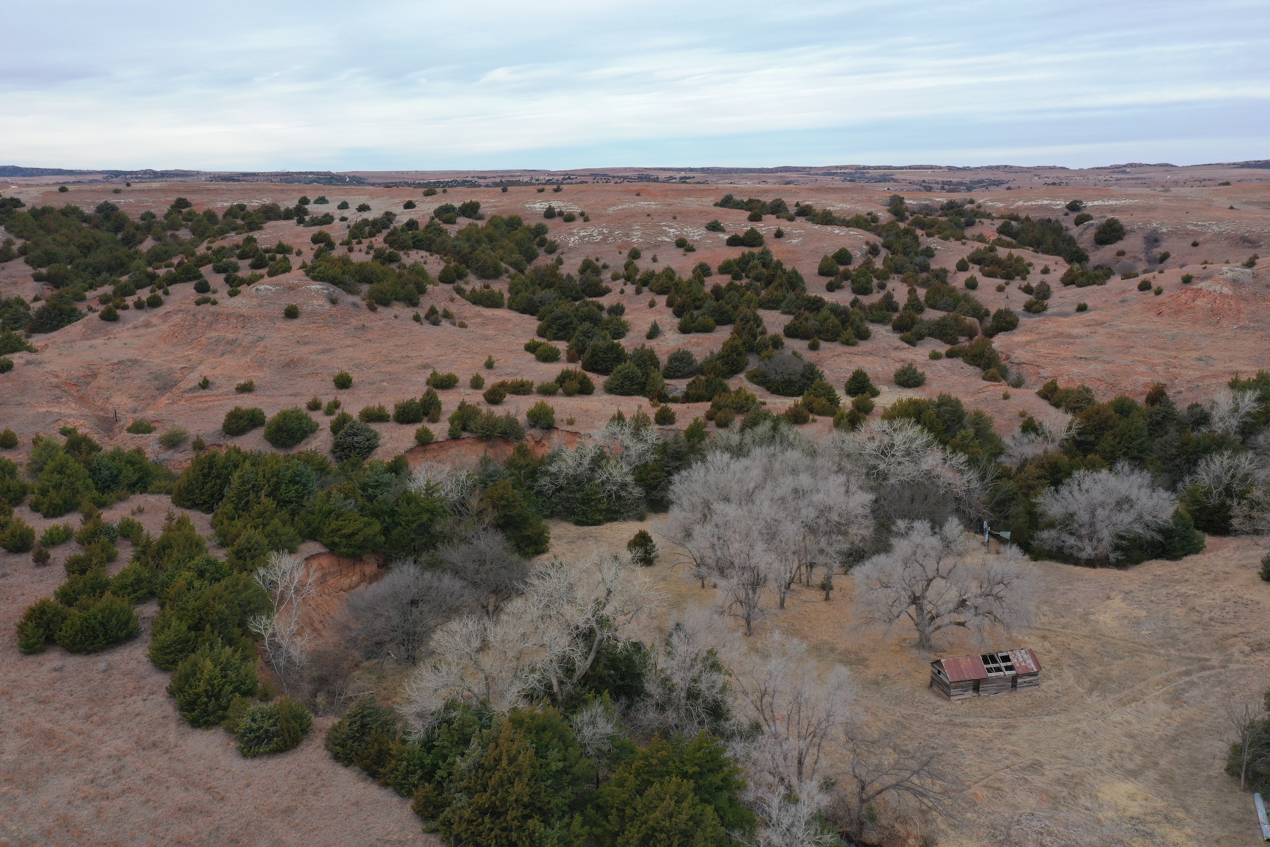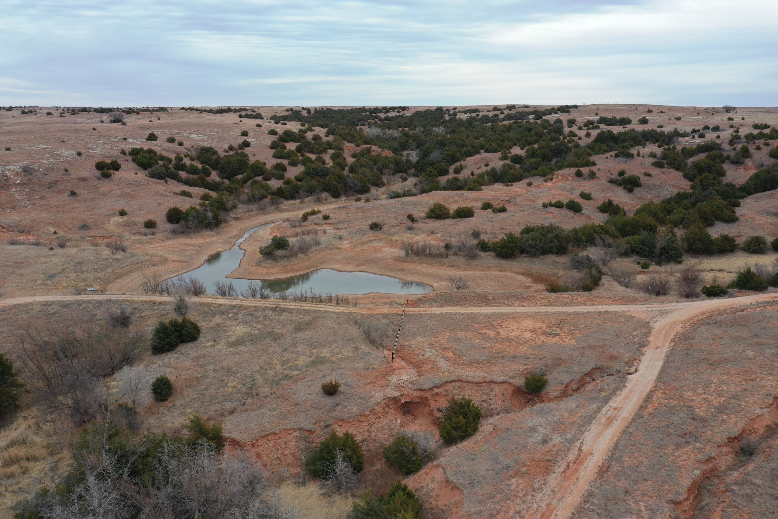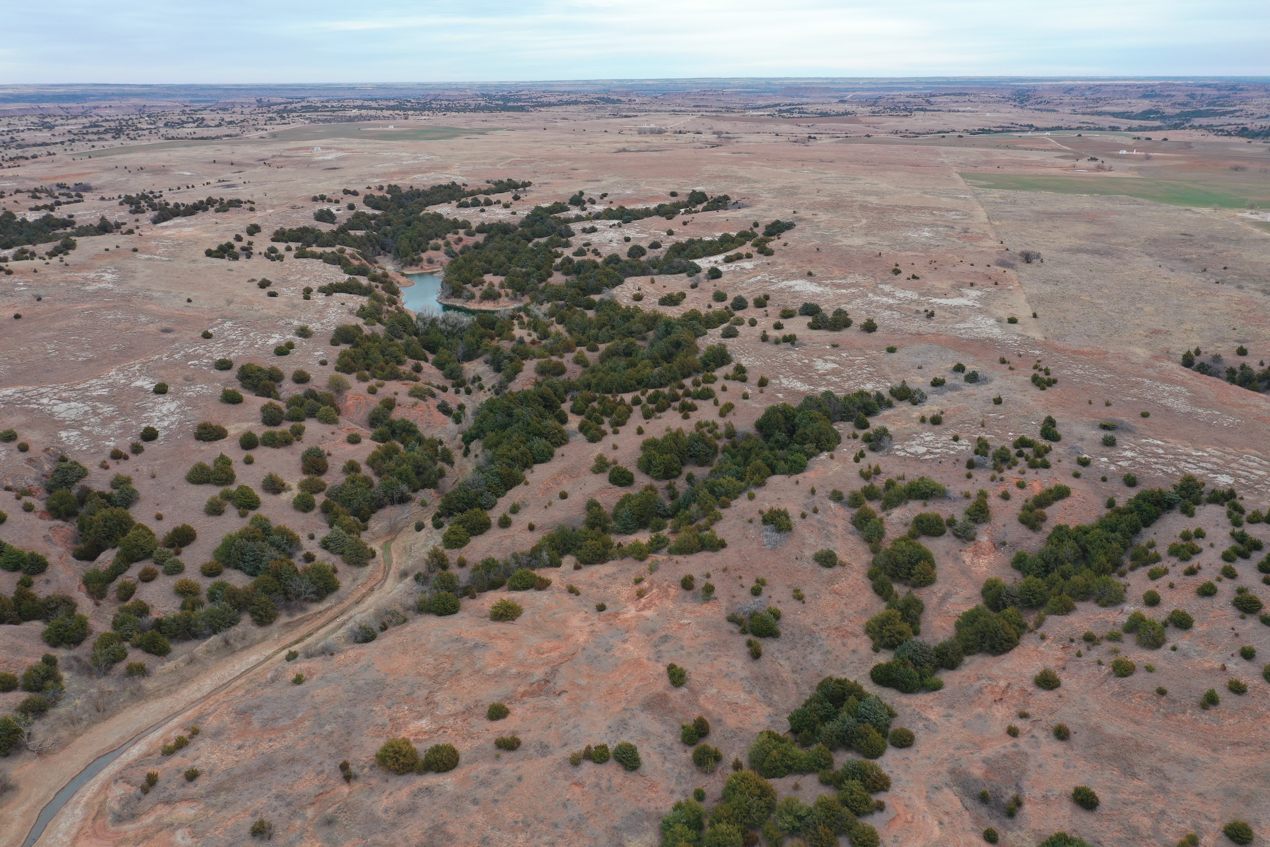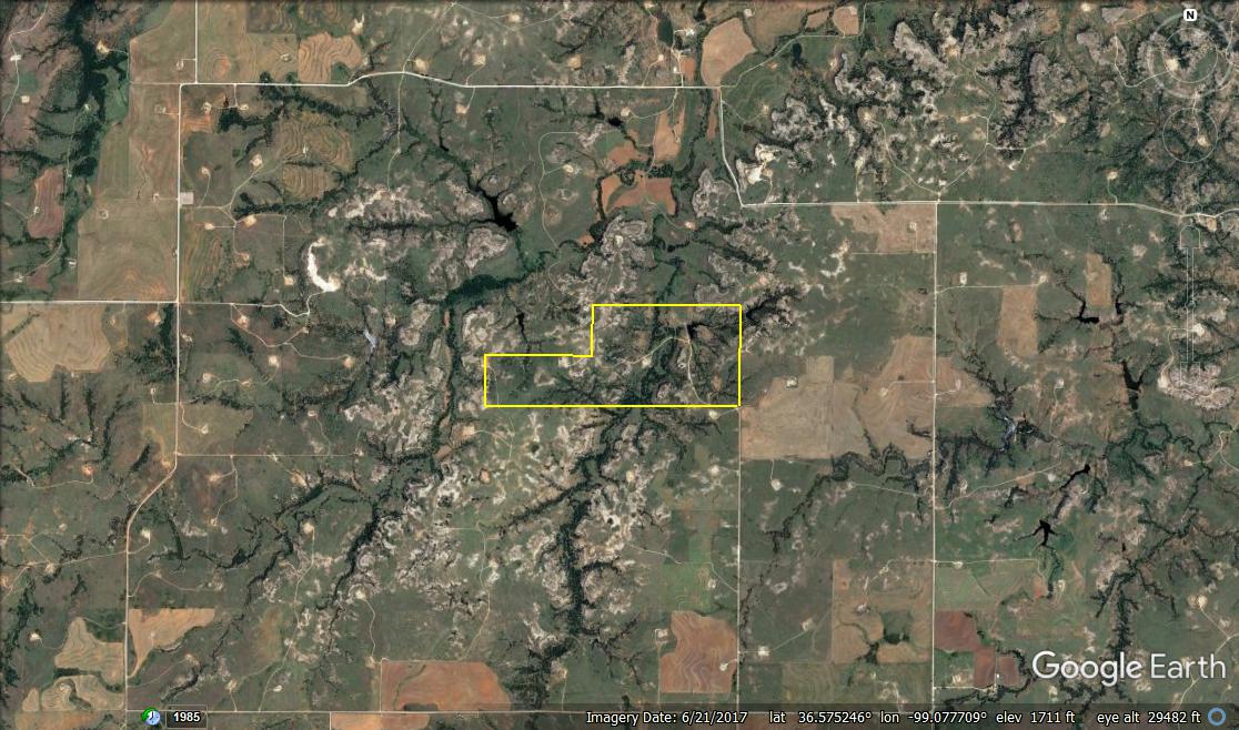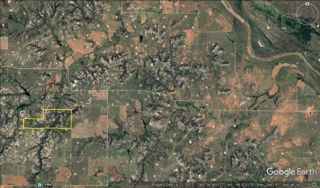 Attention whitetail hunters! Here’s a great Deer hunting property less than 5 miles from the Cimarron River! The property lies in the middle of the scenic Caprock Canyons, north of Quinlan and west of Waynoka. The area in general is well known for its great Whitetail genetics and has produced some great bucks over the years. It’s secluded at the end of a dead-end road and has great Gyp-road access. There’s also Gyp lease-roads running through the property, giving the owner great accessibility throughout the tract. The property has not recently been grazed resulting in a great bedding area. There’s a spring-influenced creek that meanders from south to north and passes just below camp. The creek has numerous pools of water, even in the dry months. It supports numerous hardwoods while serving as a corridor for the deer and turkey. Most of the ranch’s cover consists of cedar trees, hardwoods, plum thickets, and tall native grasses. There will also be some great turkey hunting here. One of the highlights of the property is a fishing pond near the camp area where the owner has caught some big largemouth bass. Near the pond is a corral area with a lean-to and shed. There’s electric and water here. All of these features offer an owner the perfect spot to set up a hunting camp. Being only 100yds from the pond, it also makes a great place to relax in the summer while you take the kids fishing! It would also be the perfect spot for a remote/secluded hunting cabin. Don’t hesitate to contact Steve to look at this great property or if you have any questions. (580) 571-7305