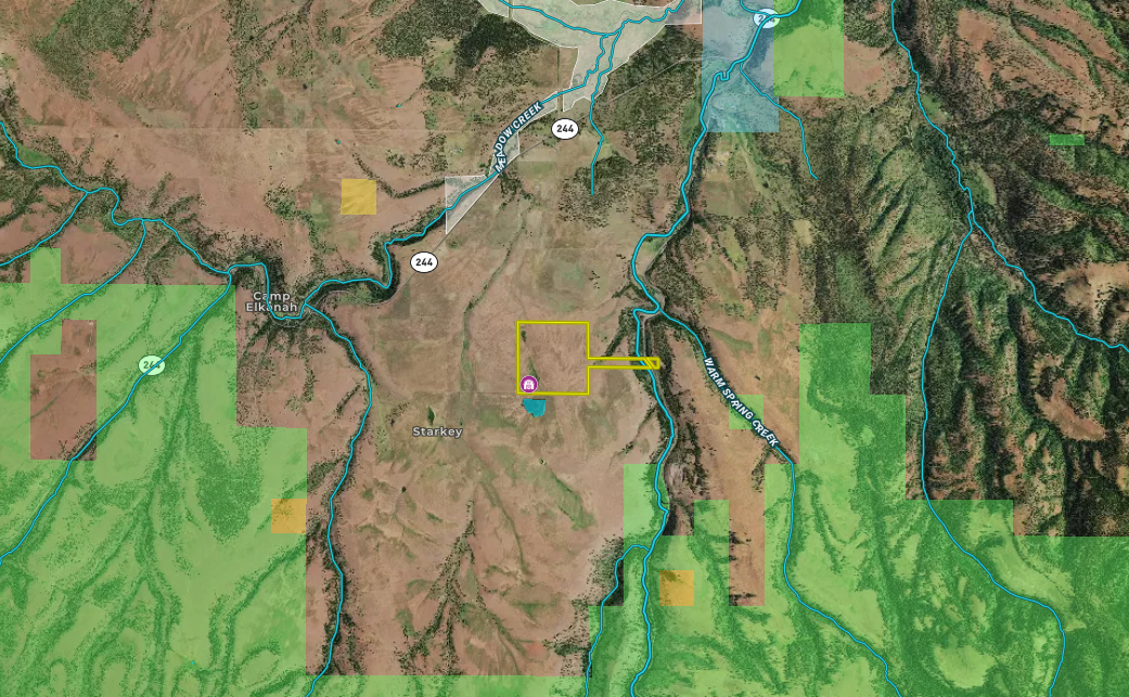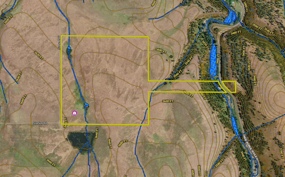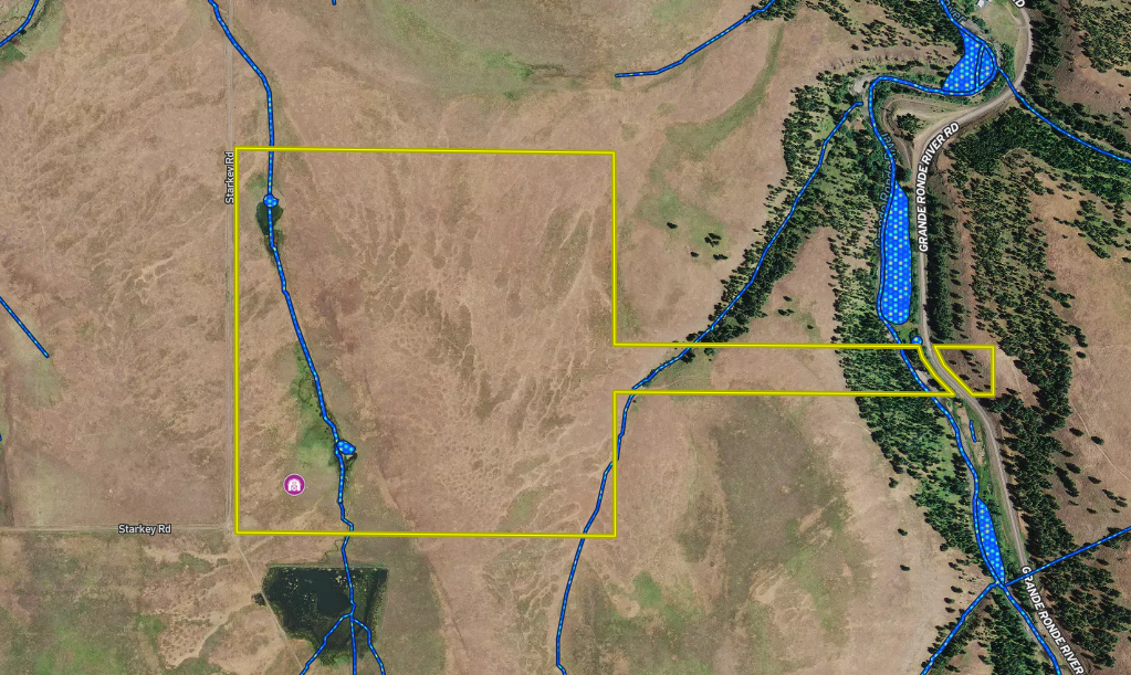 Located approximately 30 minutes west of La Grande sits this diverse tract with views of the Grande Ronde River and surrounding mountain ranges. Two ponds located on the western side of the property and the Grande Ronde River flowing through the eastern portion ensure plenty of water for livestock. The property has been leased for cattle grazing in recent years and could provide the new owners with a source of income to cover some of the annual expenses. Situated in the Starkey hunting unit this area is home to whitetail, mule deer, Rocky Mtn. elk, wolf and black bear. The timbered slope on the eastern side of the property, containing ponderosa pine and tamarack, provides great cover for wildlife and further adds to the visual appeal of this land. This tract is less than a mile from the Umatilla National Forest and also meets the minimum acreage requirements for landowner preference tags making it ideal for the sportsman and outdoor enthusiast. A large barn with an unfinished interior sits on the SW corner of the property and was built with the intent of turning the loft into a living space. This parcel has county approval allowing a new owner to continue building the barn into a dwelling. Another option is to build a breezeway connecting the barn to a more traditional style residence.